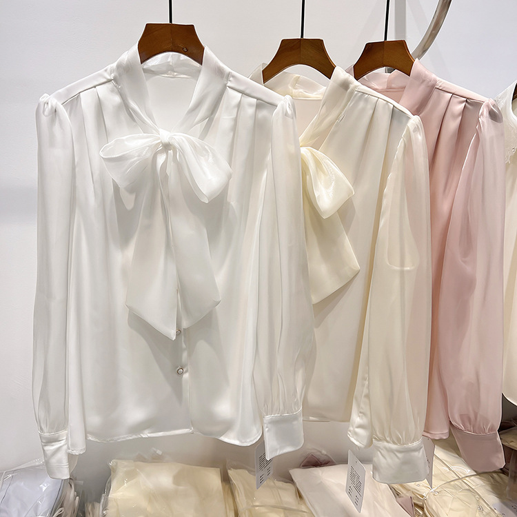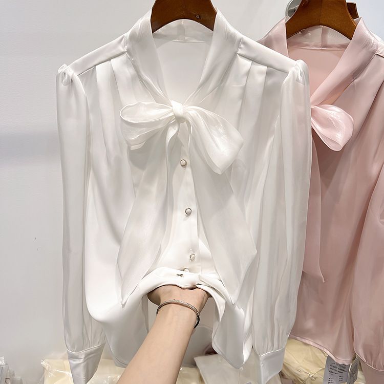 봄과 가을 유럽산 우아한 슬림 솔리드 컬러 V 넥 오르가나 레이스 업 여성용 싱글 브레스트 긴팔 셔츠
