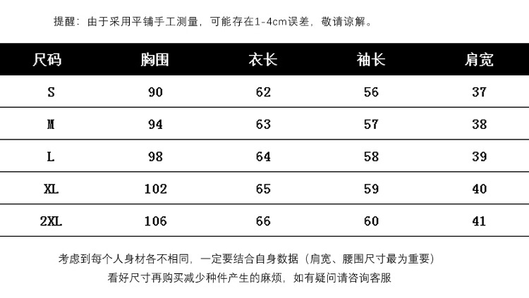 | 尺码 | 胸围(cm) | 衣长(cm) | 袖长(cm) | 肩宽(cm) |