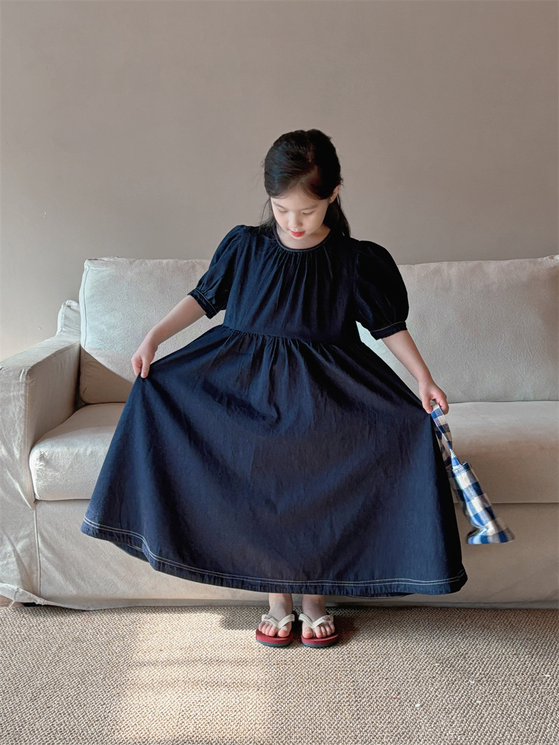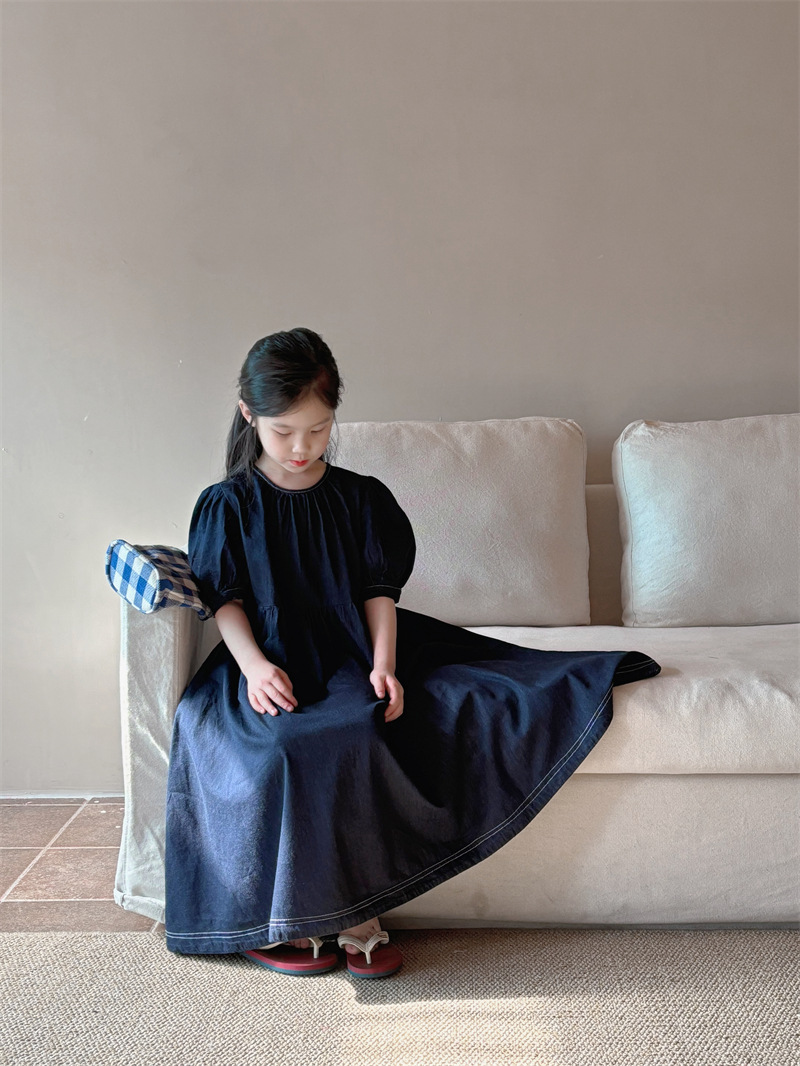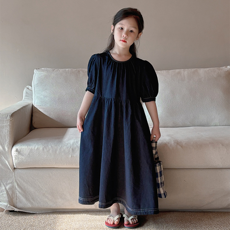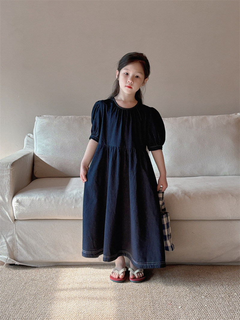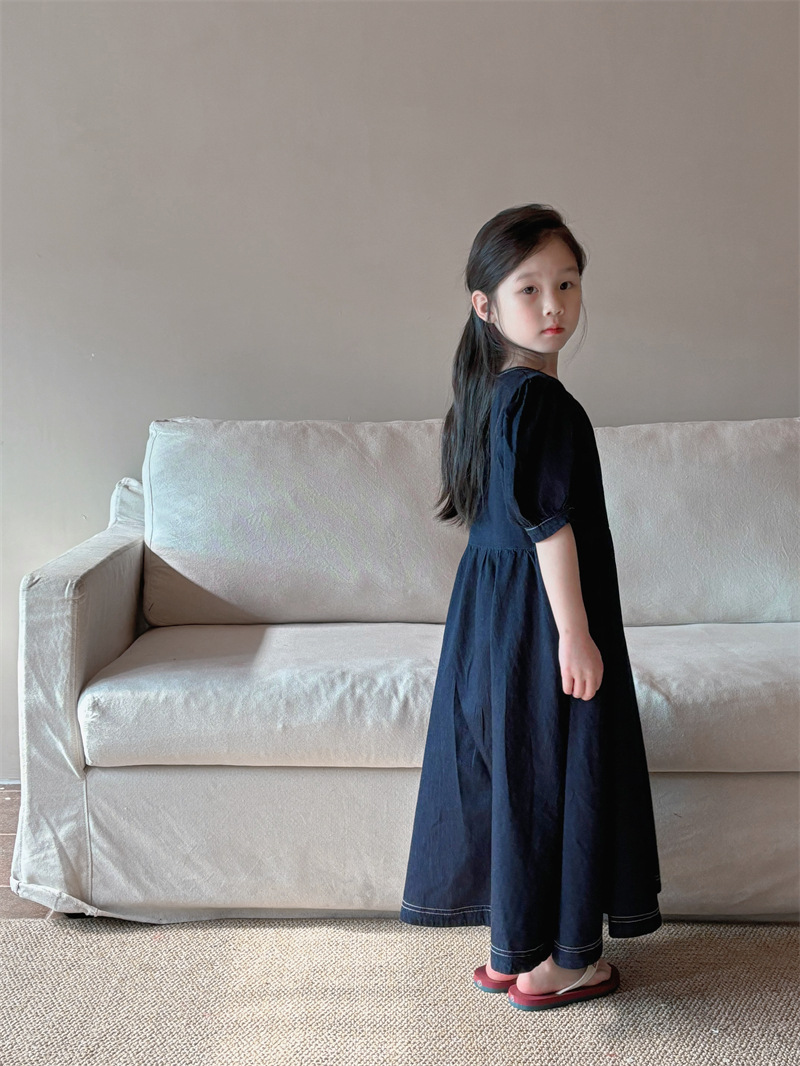 소녀 서양식 반팔 데님 긴 원피스 봄과 여름 새로운 어린이 스타일 유행 올 매칭 원피스 유행 Q437