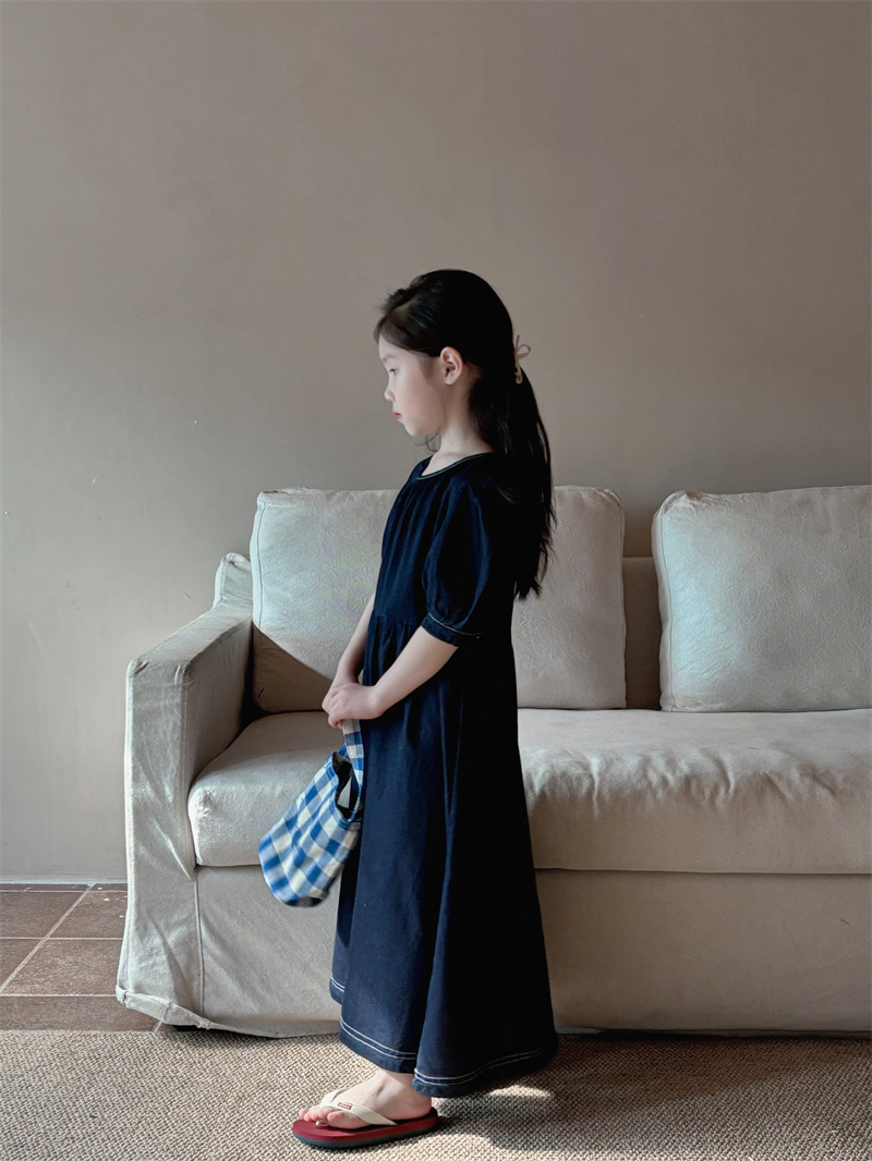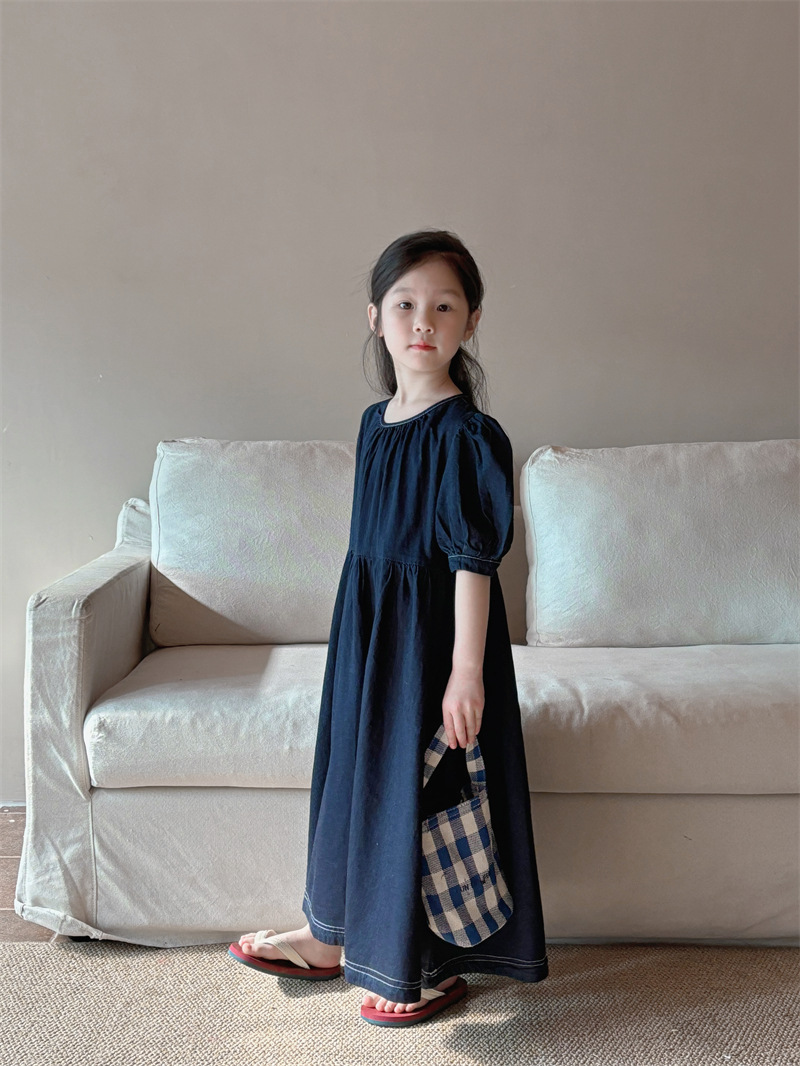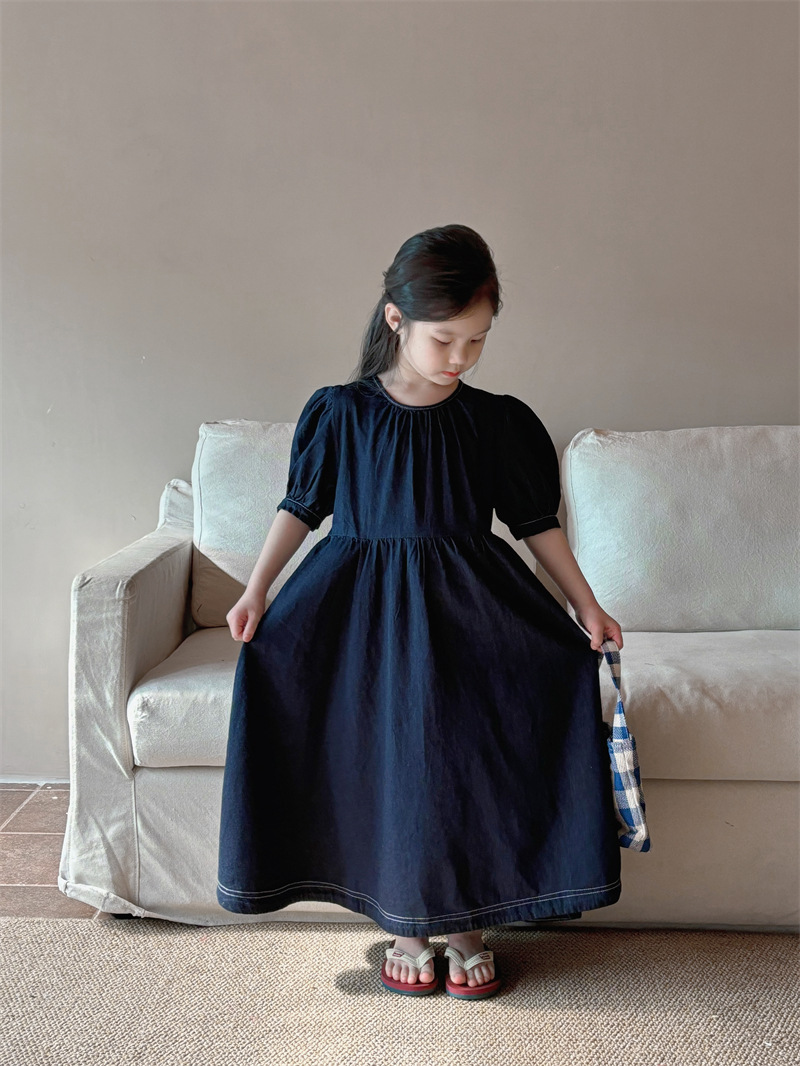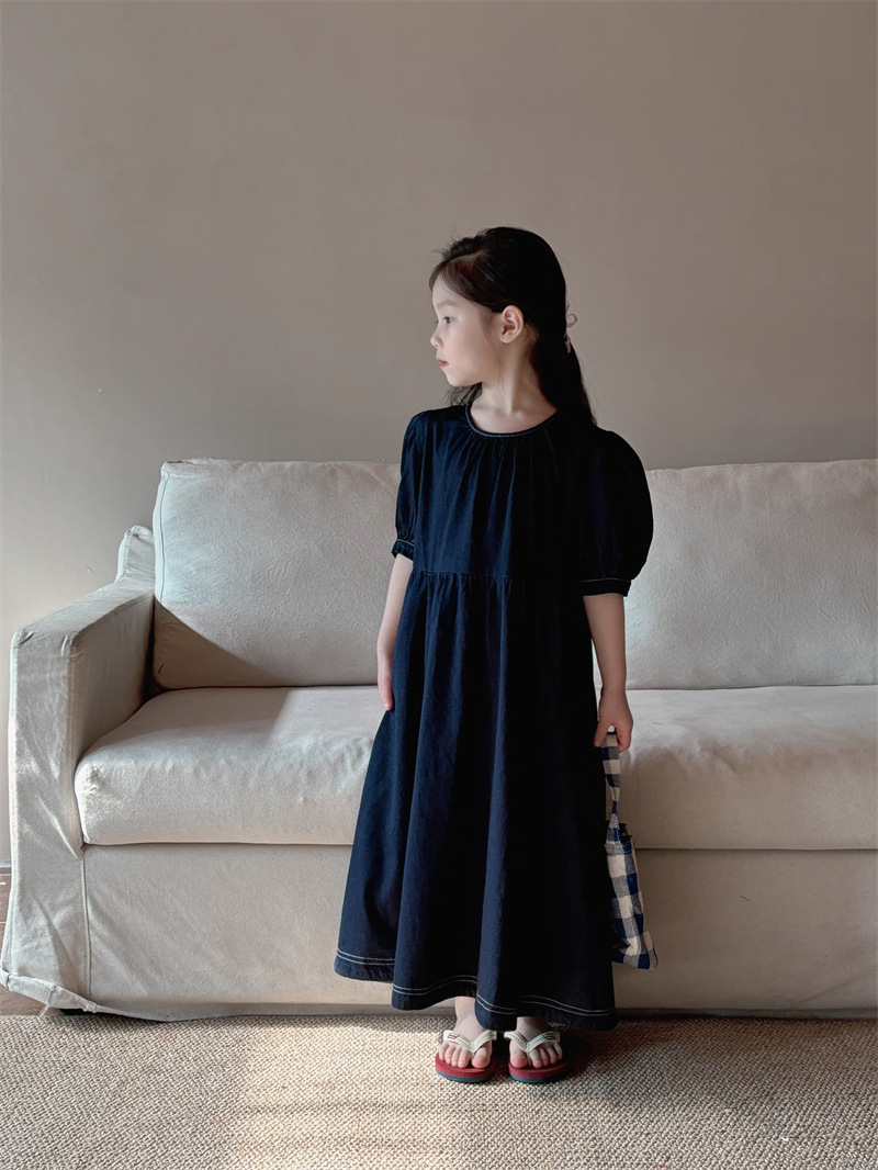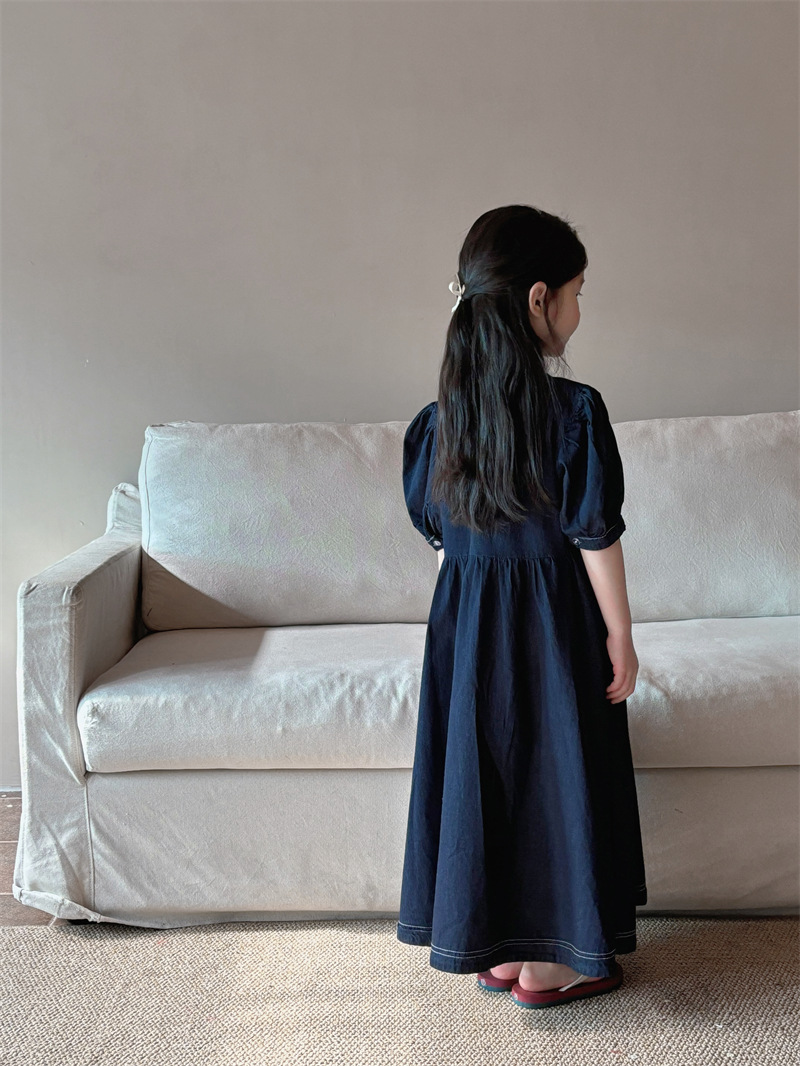 소녀 서양식 반팔 데님 긴 원피스 봄과 여름 새로운 어린이 스타일 유행 올 매칭 원피스 유행 Q437