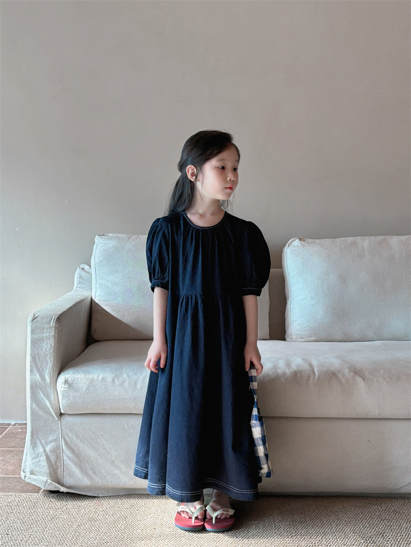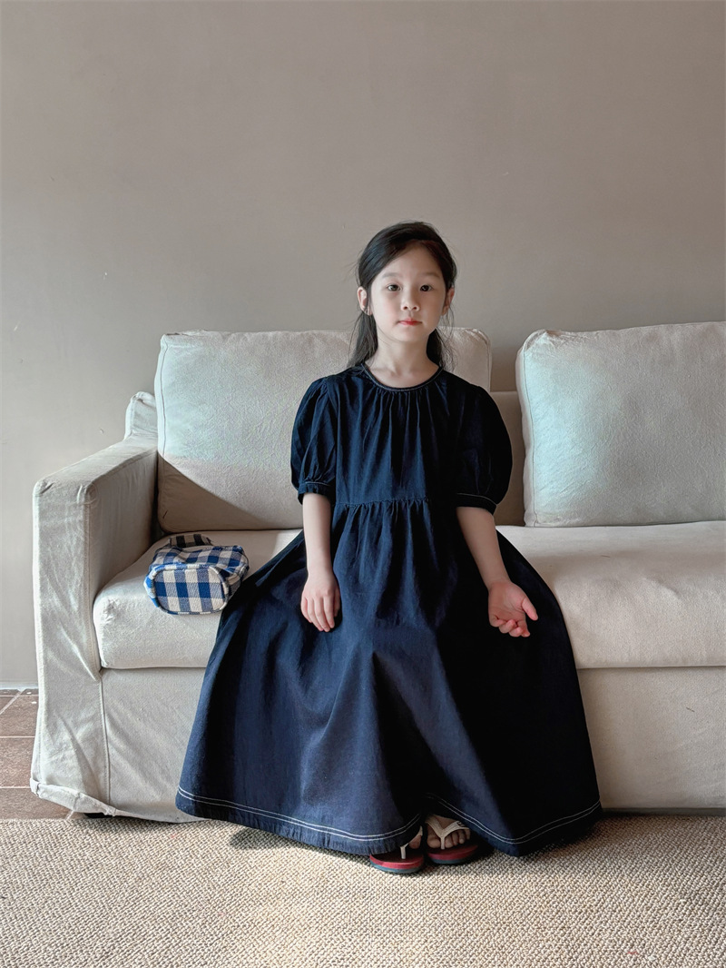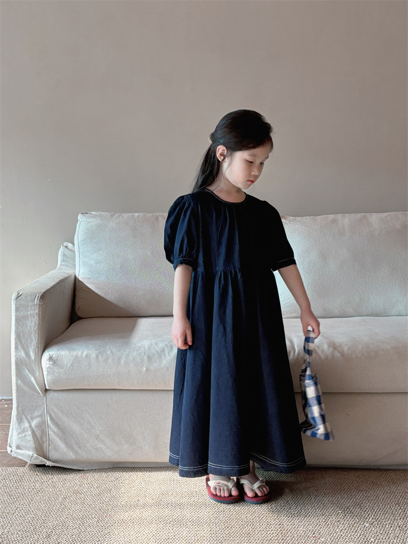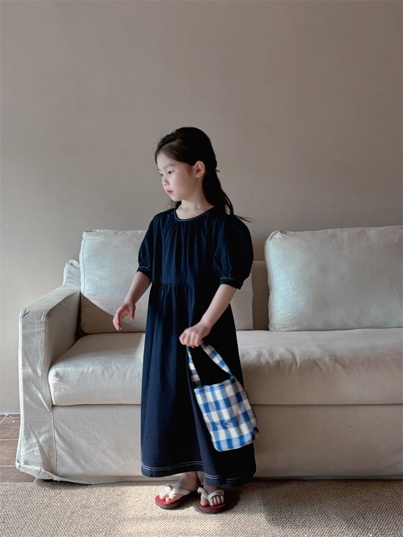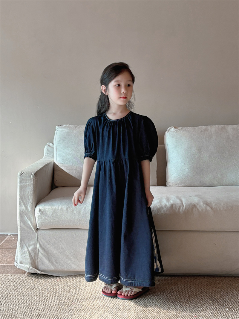 소녀 서양식 반팔 데님 긴 원피스 봄과 여름 새로운 어린이 스타일 유행 올 매칭 원피스 유행 Q437