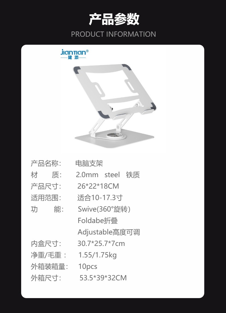 外箱装箱量:  10pcs 功能: Swive(360°旋转)   Foldabe折叠 Adjustable高度可调