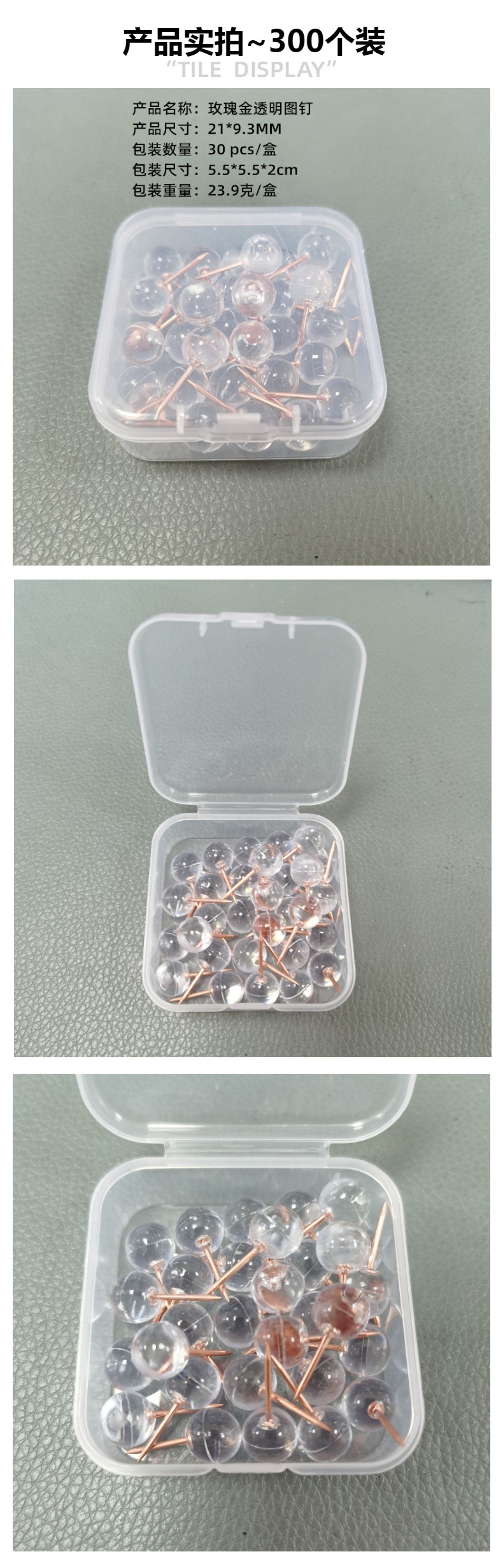 국경 로즈 골드 푸시 핀 라운드 투명 플라스틱 엄지 손톱 스테인레스 스틸 대형 핀 박스 프로모션스토어 가기