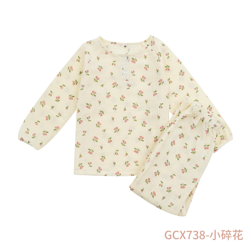 어린이 면화 더블 레이어 크레이프 파자마 부모 자식 면화 봄과 가을 소년 소녀를위한 새로운 중형 및 큰 어린이 긴팔 홈 웨어