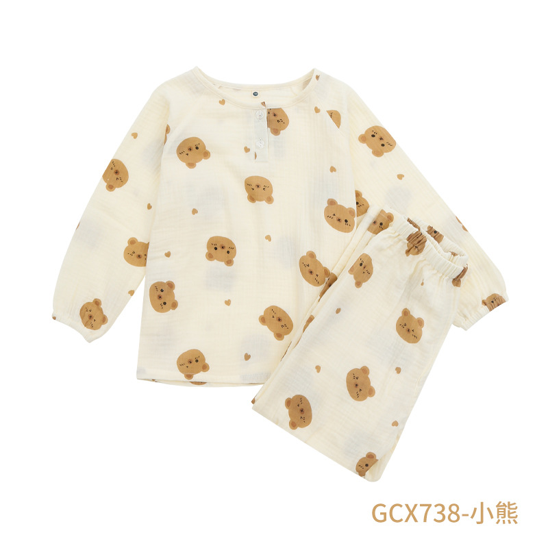 어린이 면화 더블 레이어 크레이프 파자마 부모 자식 면화 봄과 가을 소년 소녀를위한 새로운 중형 및 큰 어린이 긴팔 홈 웨어스토어 가기