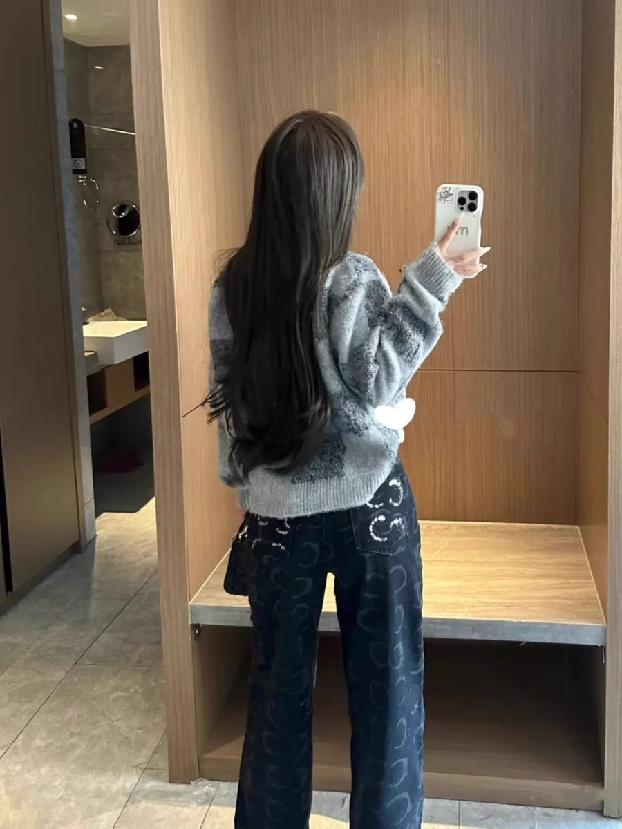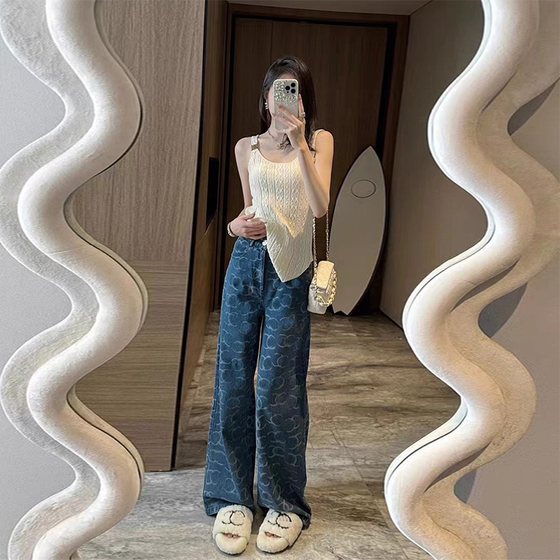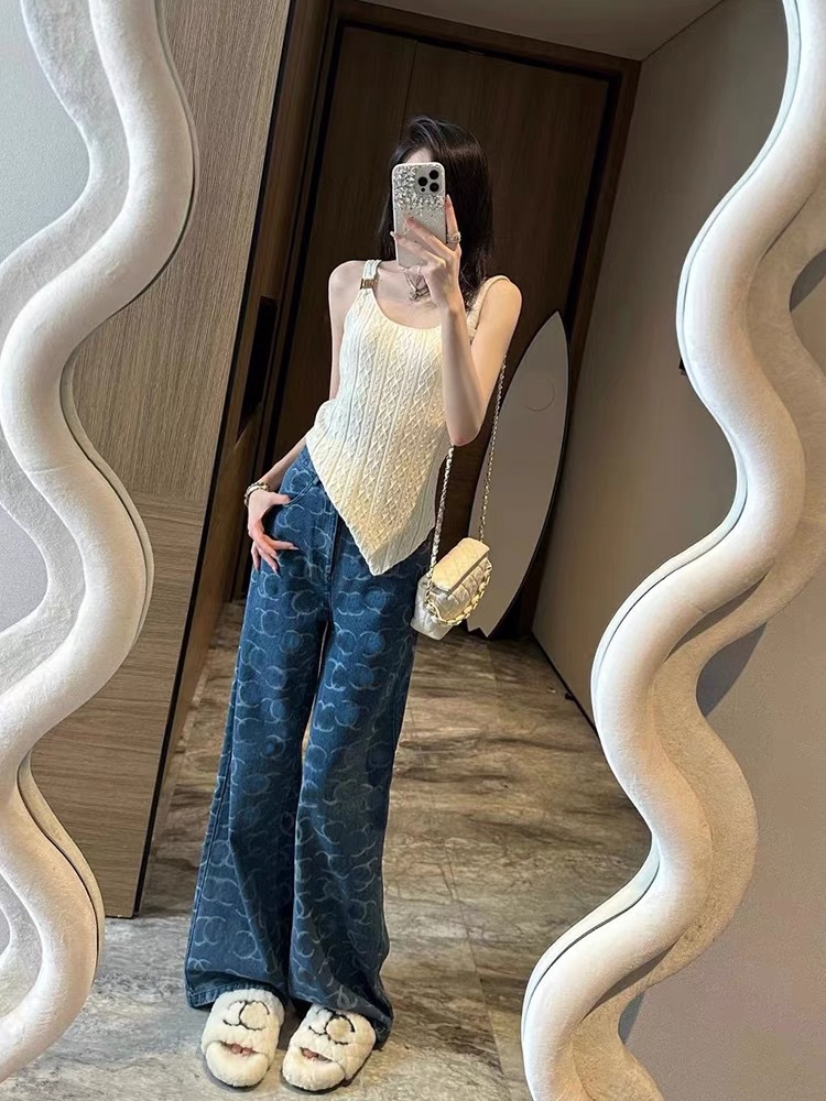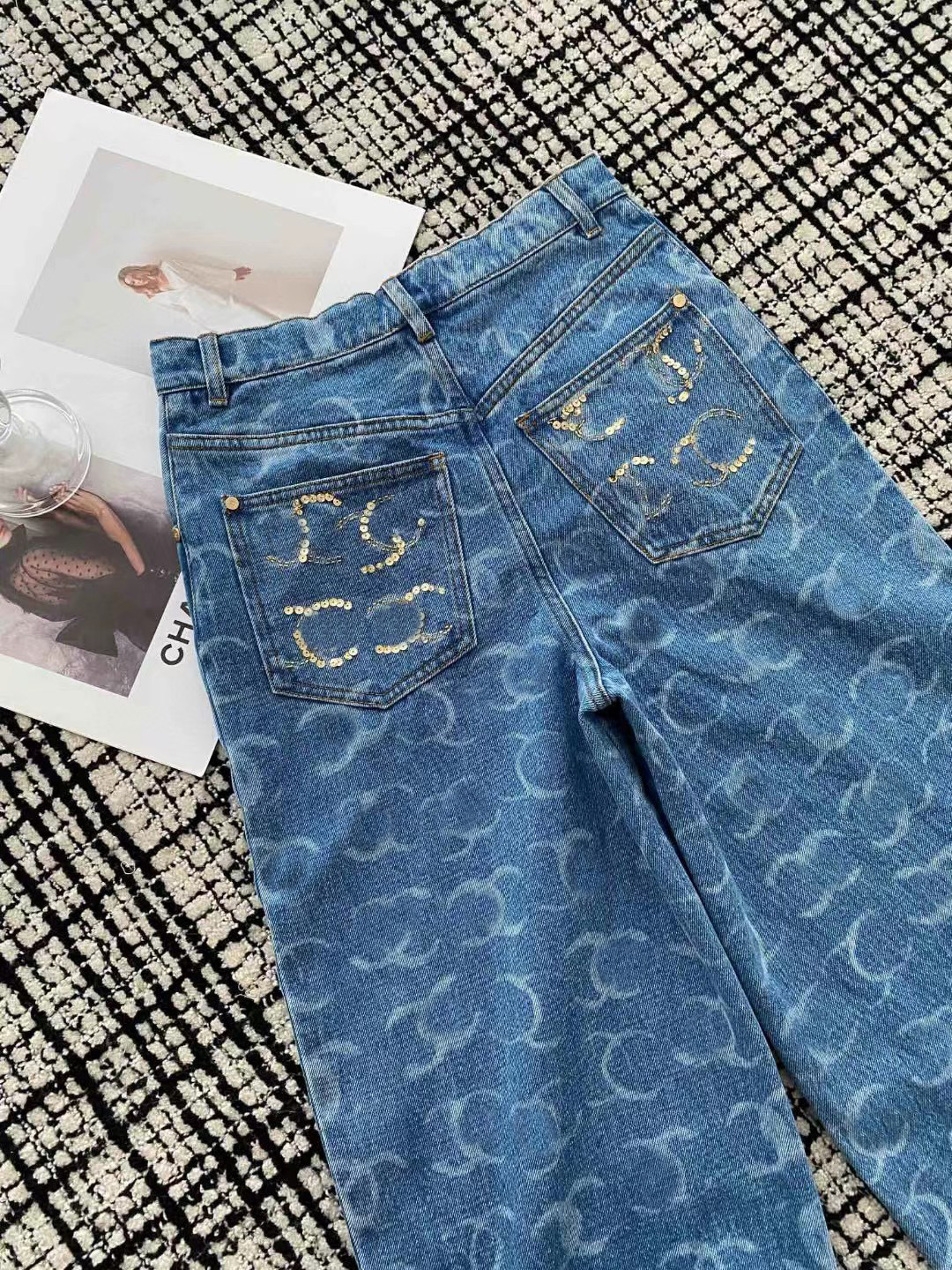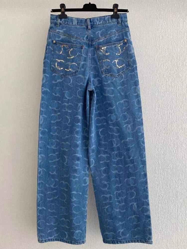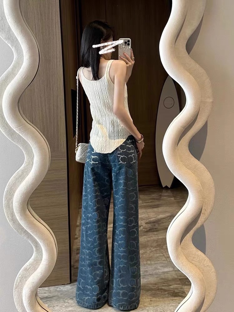 2025 여름 유럽풍 난유 고급 여성복 CH 샤오샹 스타일 로고 스팽글 하이웨이스트 스트레이트 와이드 데님 팬츠 여성용스토어 가기