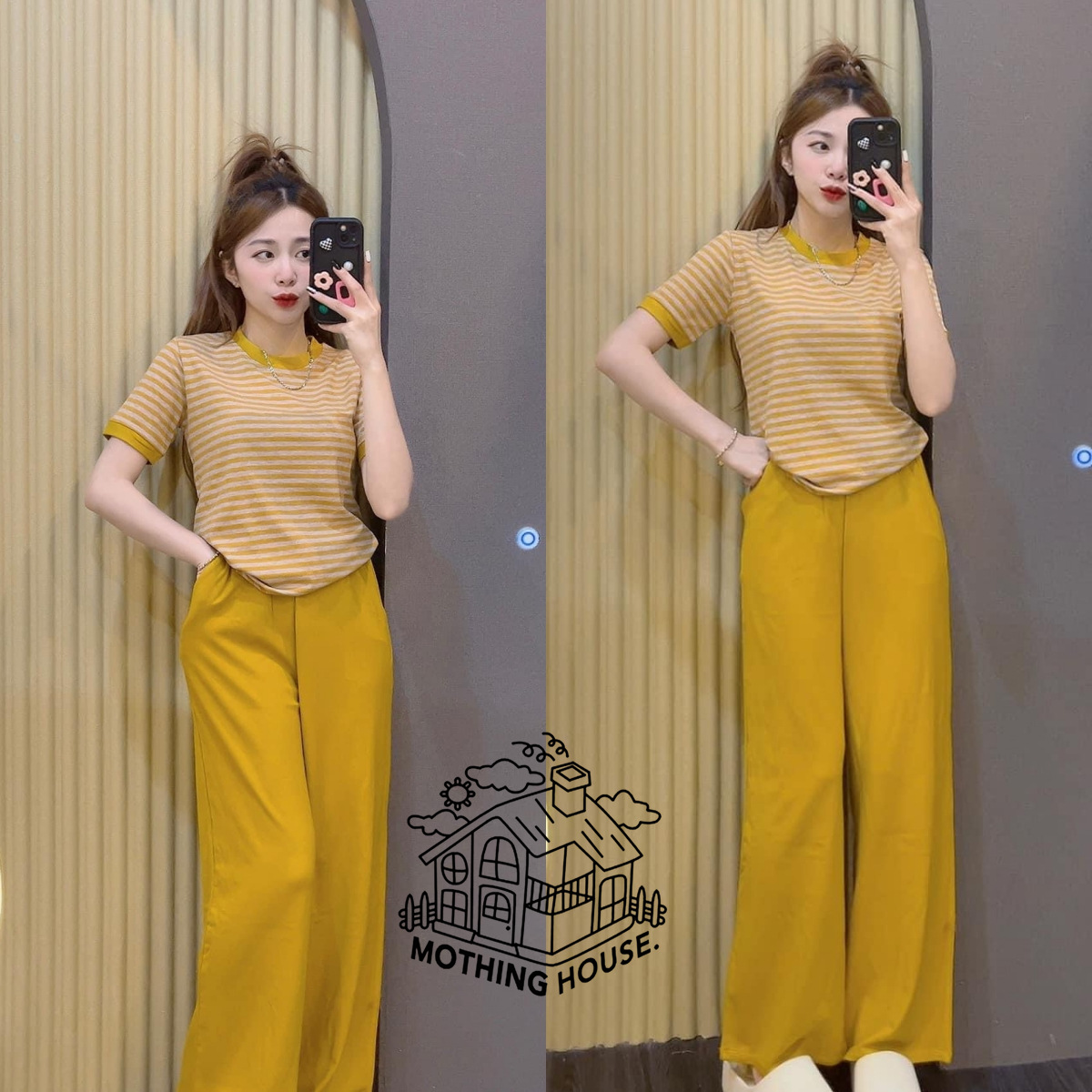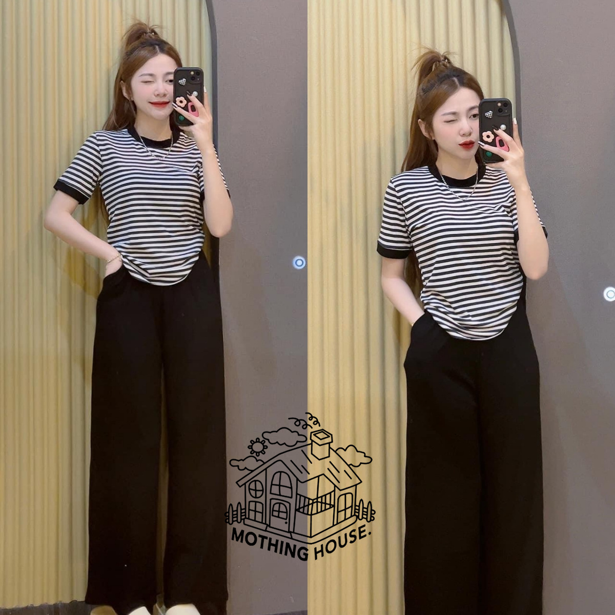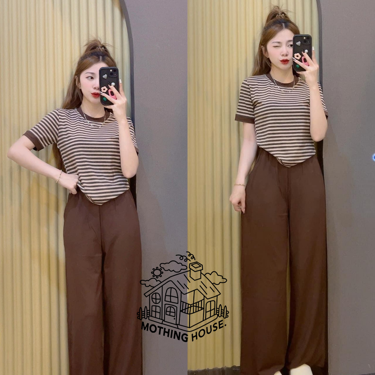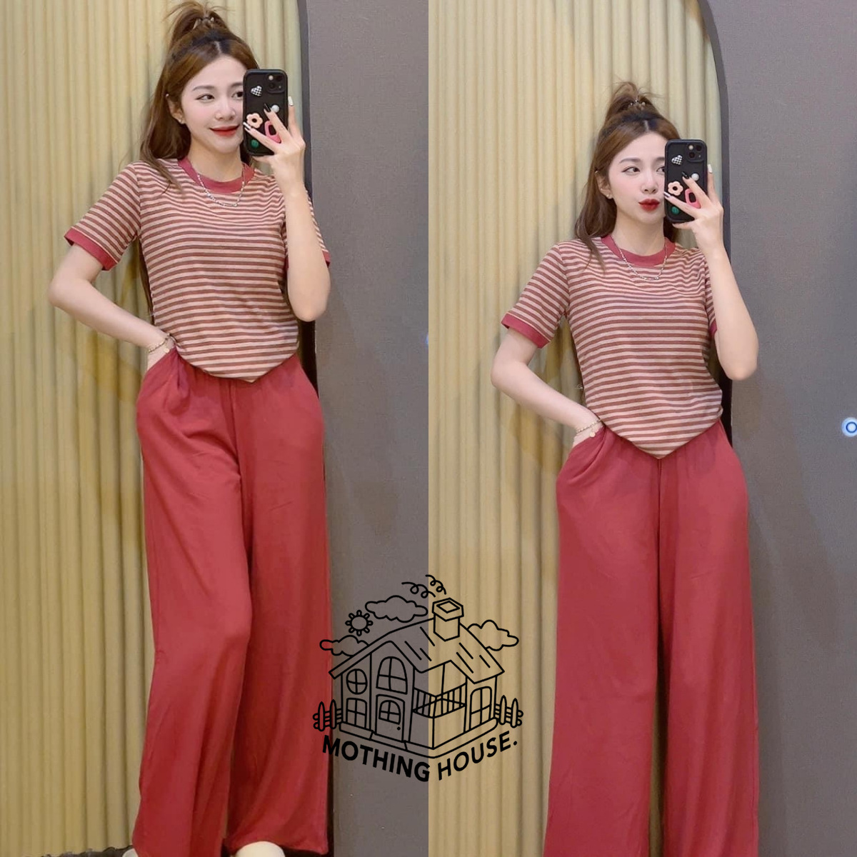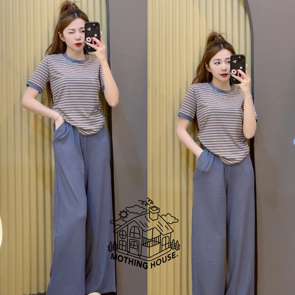 여름 여성의 새로운 시원한 소금 스타일 하이 엔드 홍콩 스타일 캐주얼 스트라이프 탑 넓은 다리 바지 투피스 세트스토어 가기