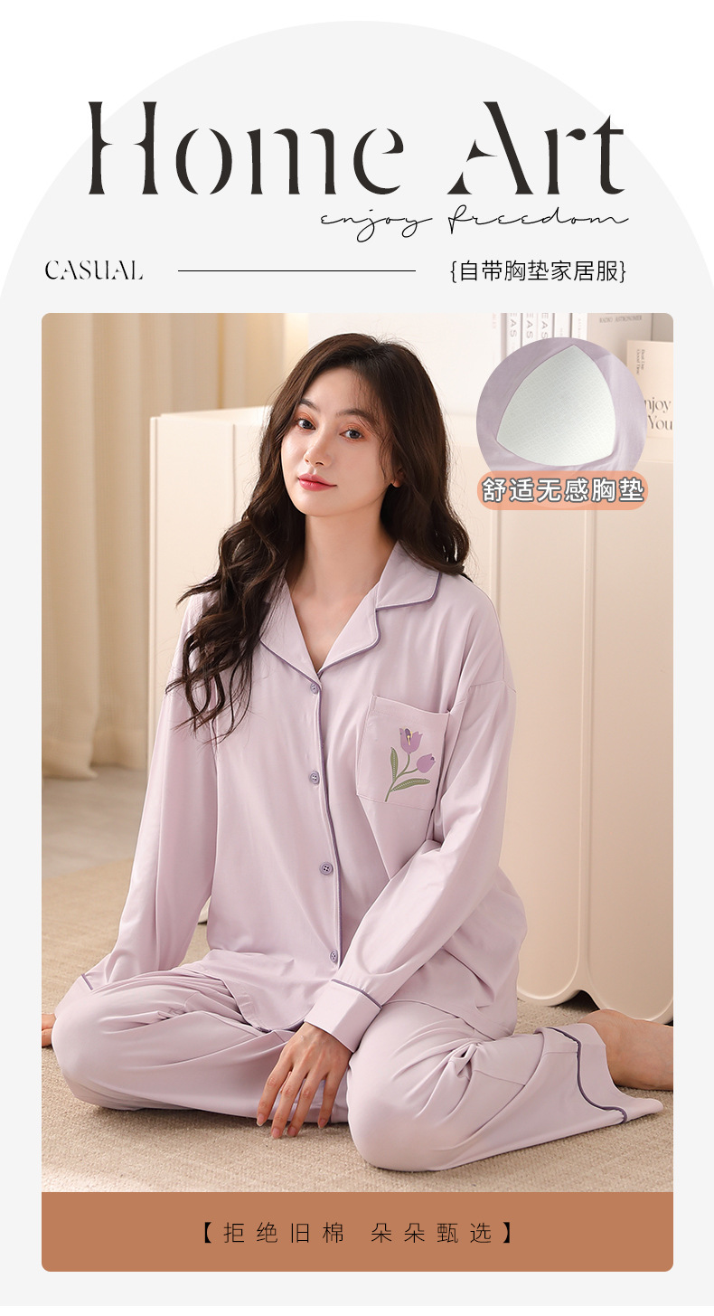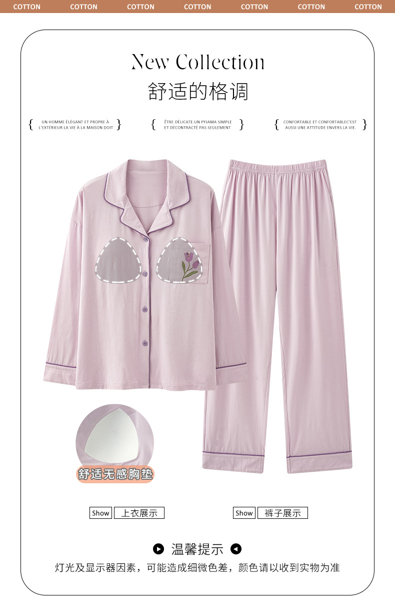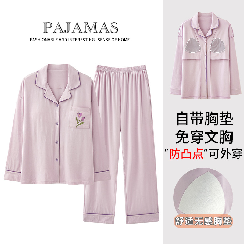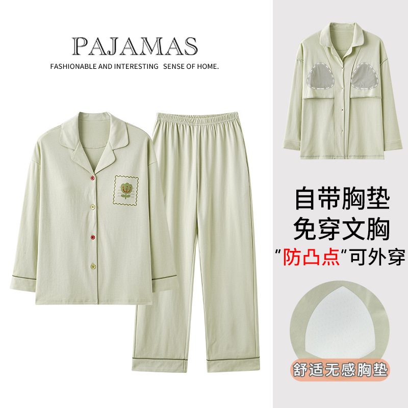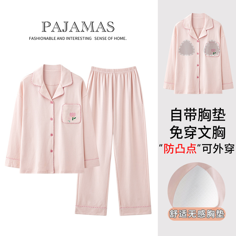 [가슴 패드로] 잠옷 여성 2020 봄 순면 긴팔 옷깃 가을과 겨울 플러스 사이즈 야외 홈웨어 세트