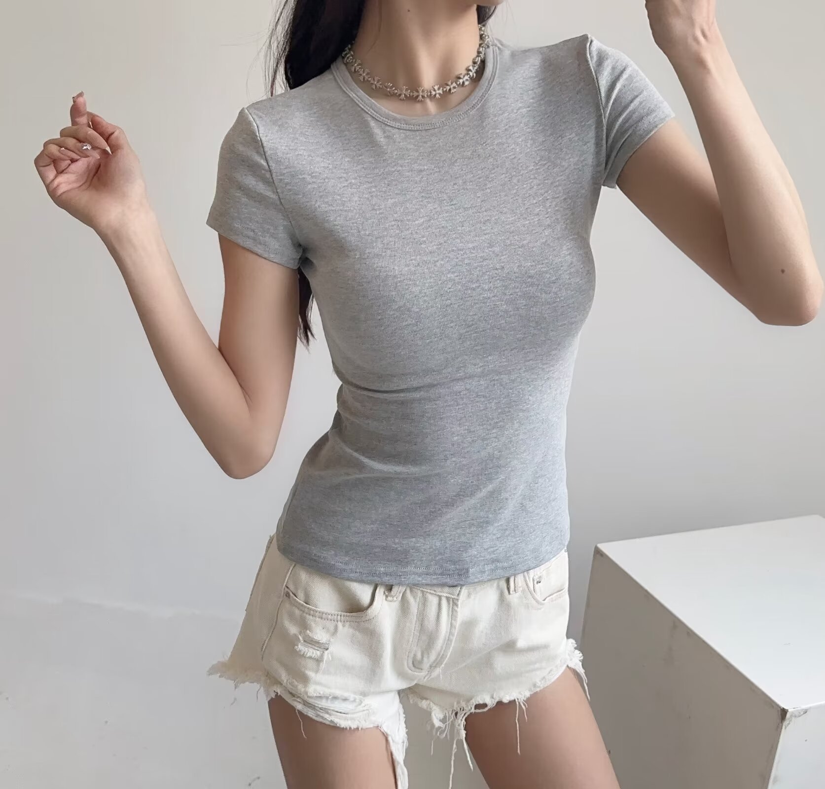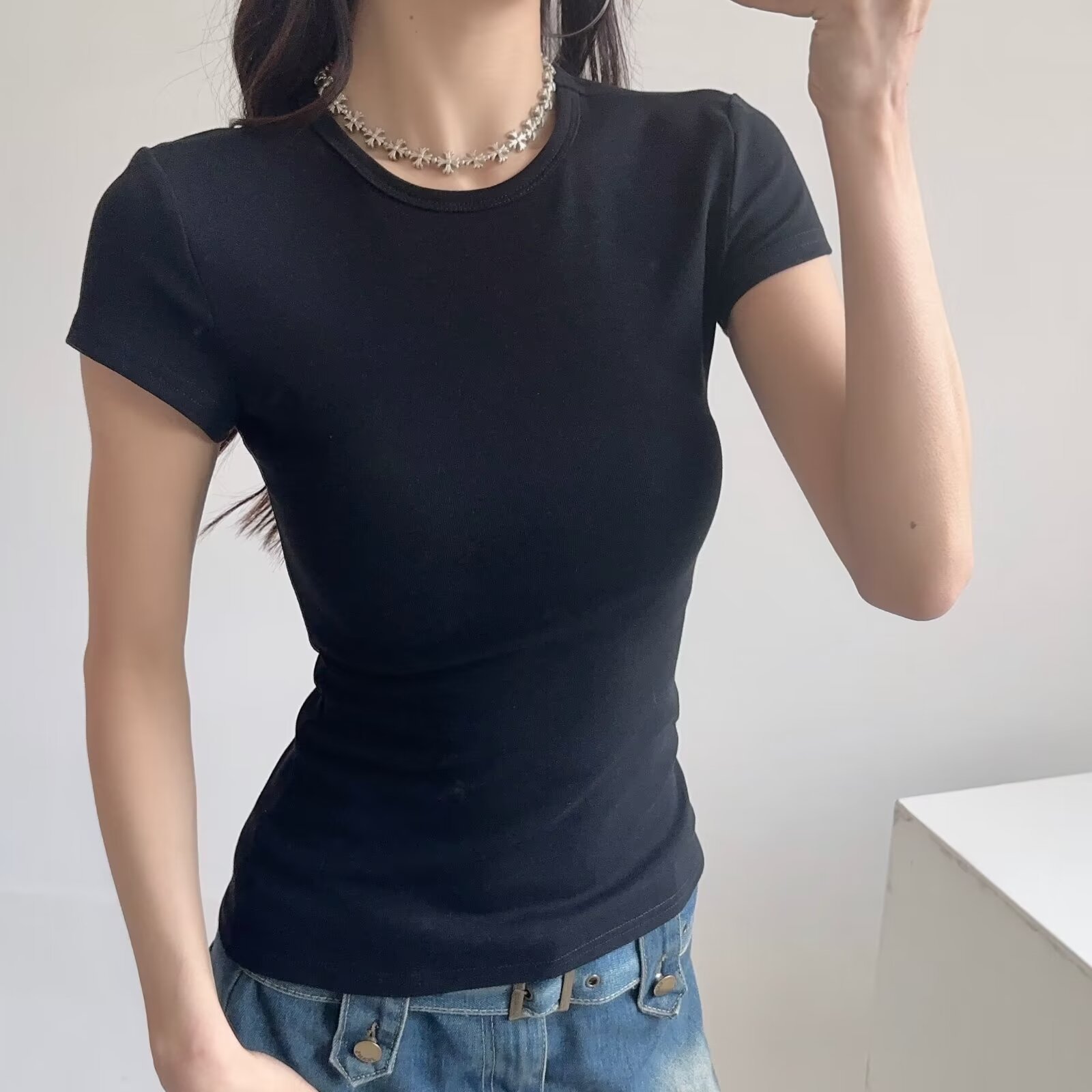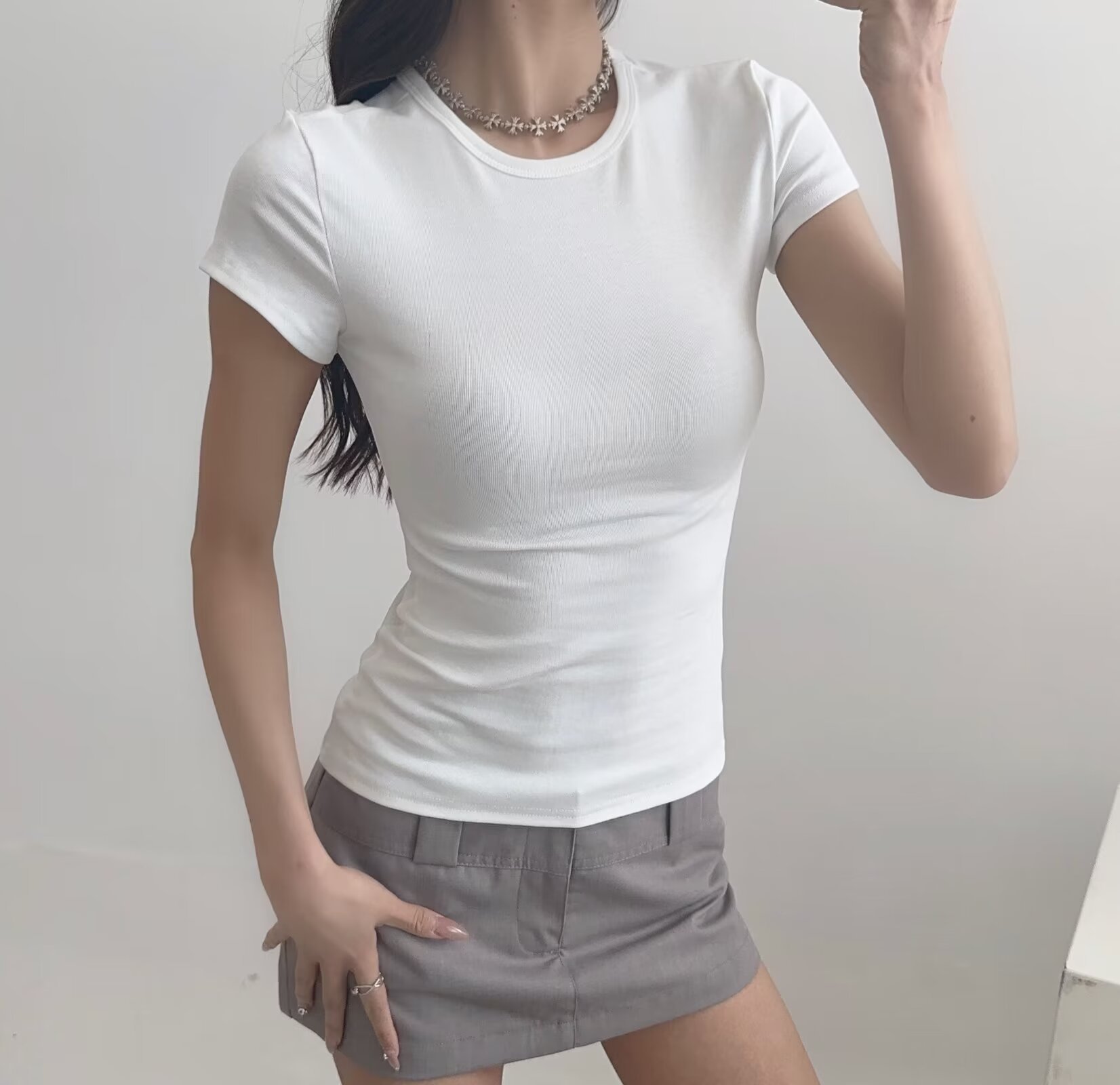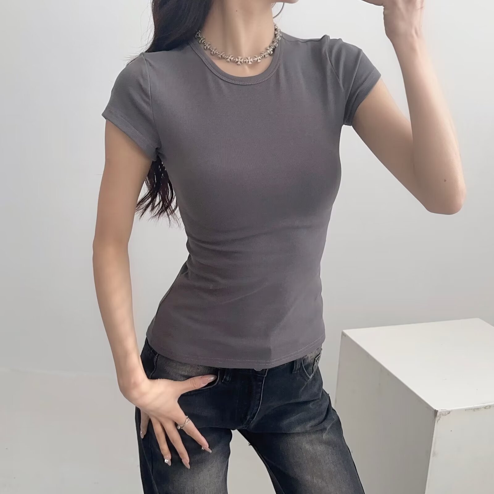 카다시안 여성용 반팔 티셔츠 2026 봄 여름 솔리드 컬러 슬림핏 라운드넥 슬리밍 베이스 스포츠 크로스보더 탑 도매스토어 가기