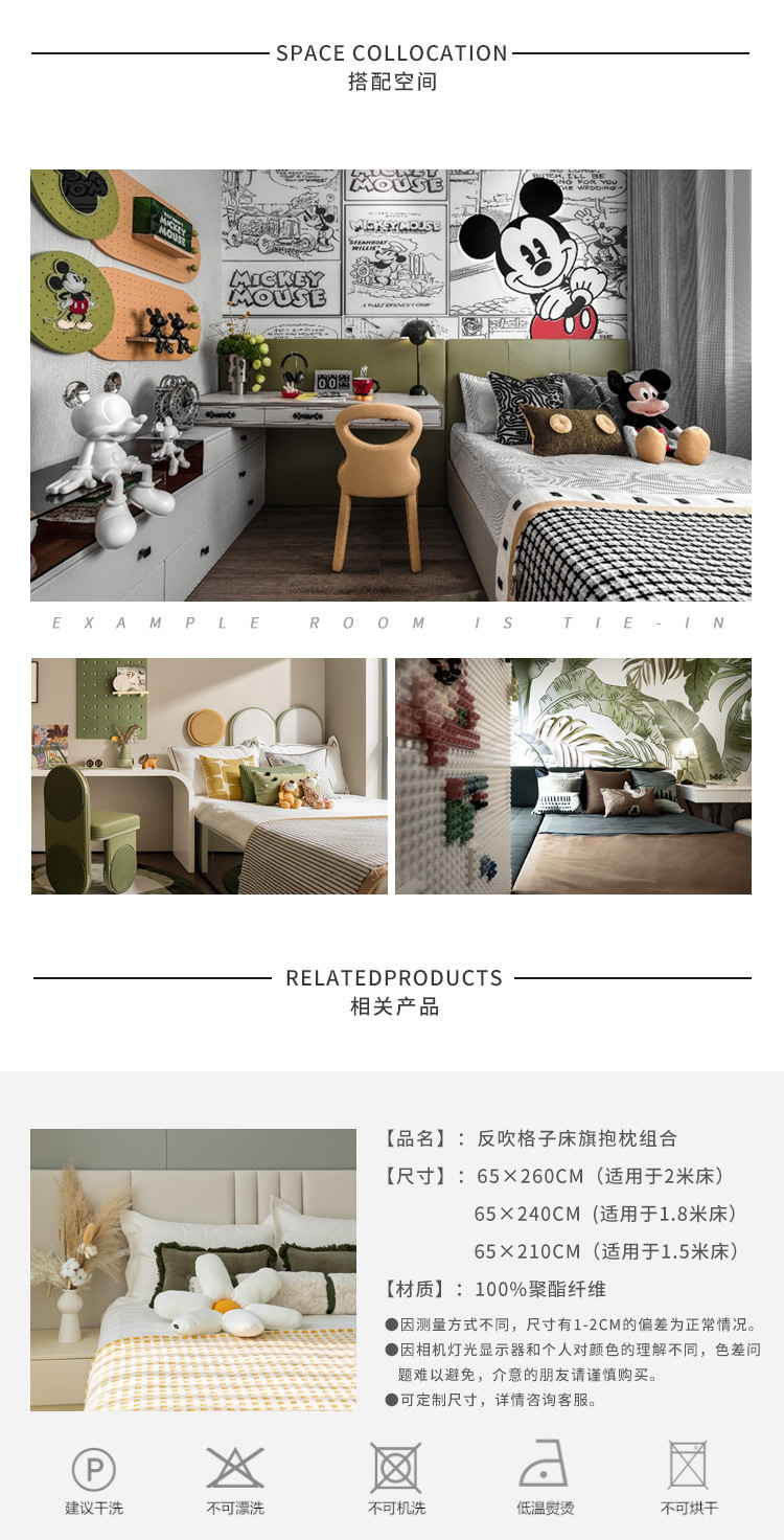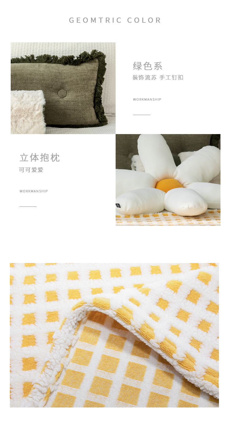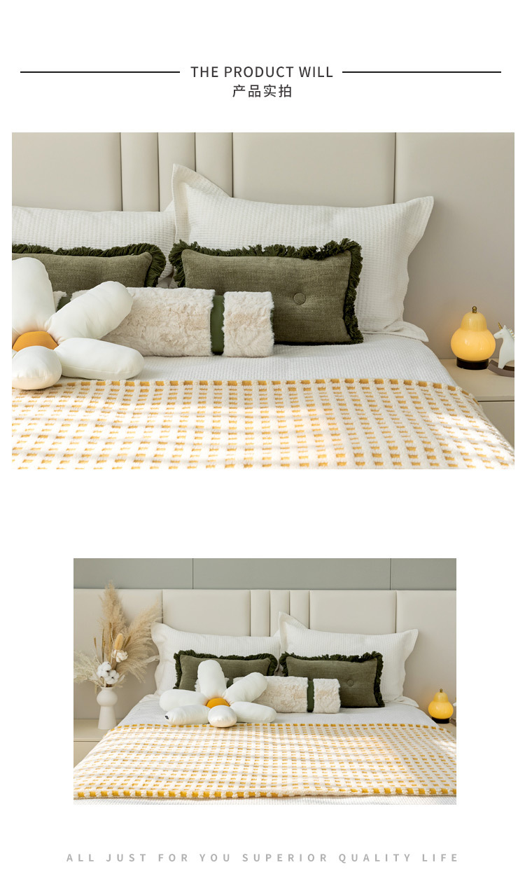 북유럽 어린이 방 모델 룸 침구 역 불고 노란색과 흰색 격자 무늬 침대 러너 람스울 담요 녹색 술 베개