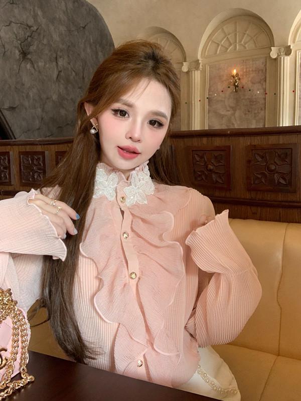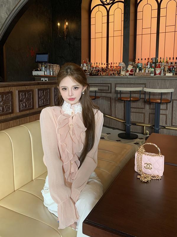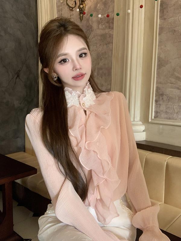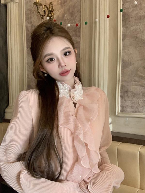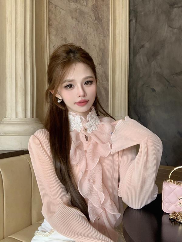 Maillard 디자인 러플 스티칭 셔츠 여성용 가을과 겨울 프랑스 스타일의 가벼운 럭셔리 벨 슬리브 스탠드 칼라 쉬폰 탑스토어 가기