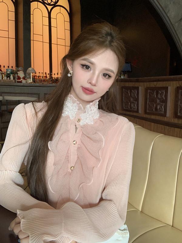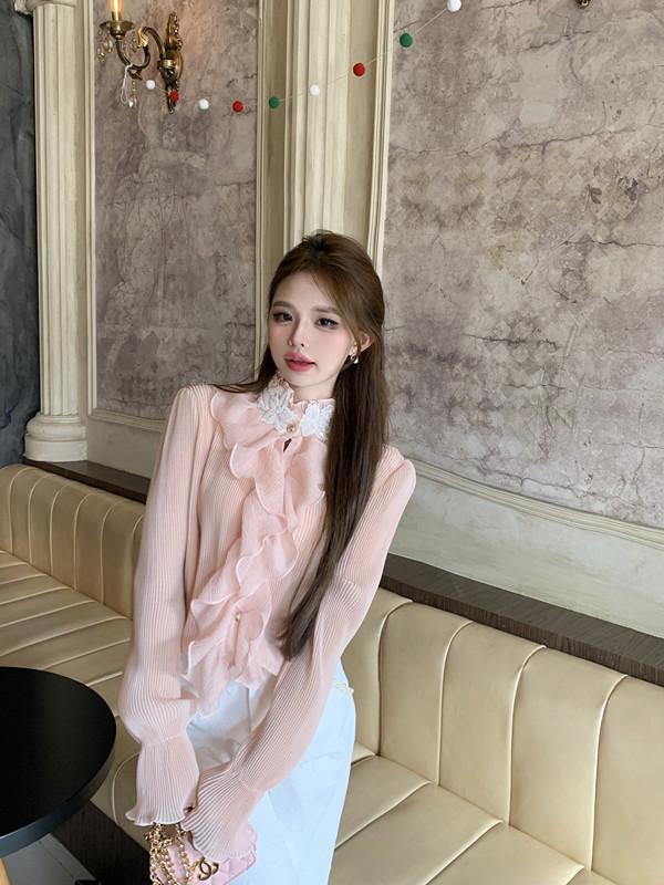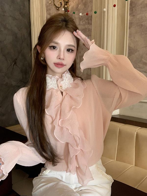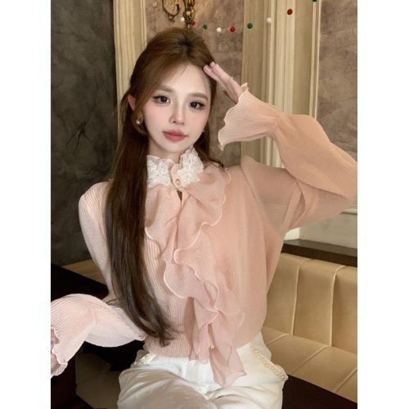 Maillard 디자인 러플 스티칭 셔츠 여성용 가을과 겨울 프랑스 스타일의 가벼운 럭셔리 벨 슬리브 스탠드 칼라 쉬폰 탑
