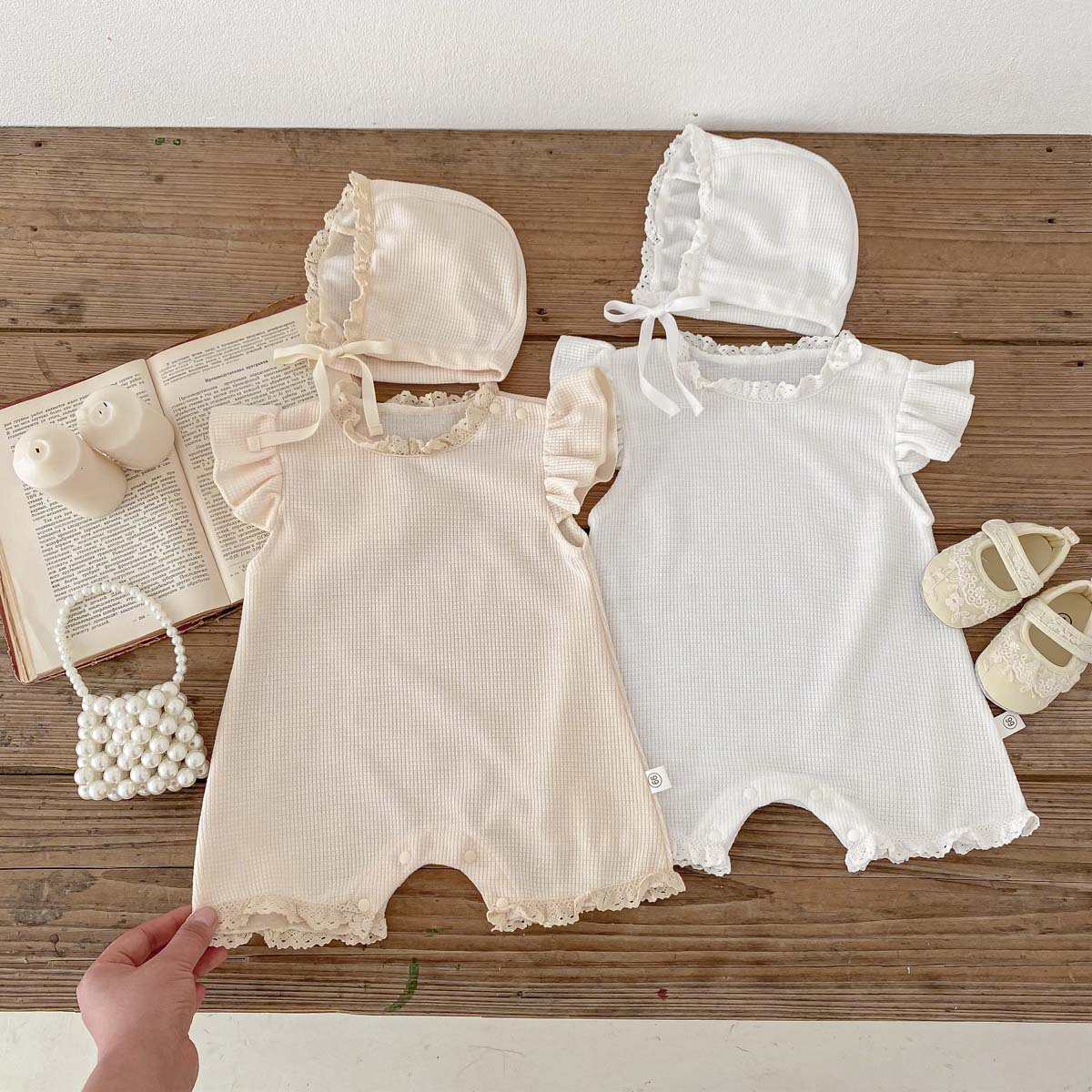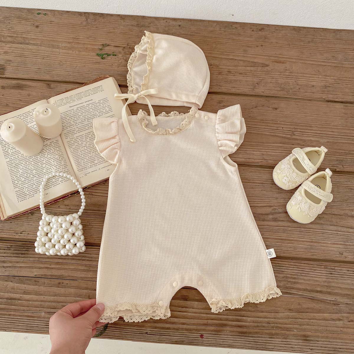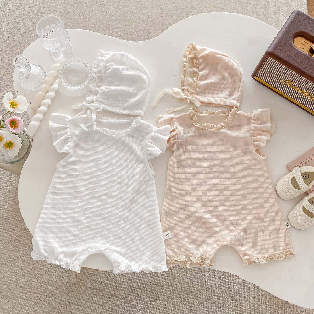 INS 한국판 여름 아기 소녀 와플 레이스 점프 수트 비행 소매 얇은 모자 등반 옷 신생아 옷