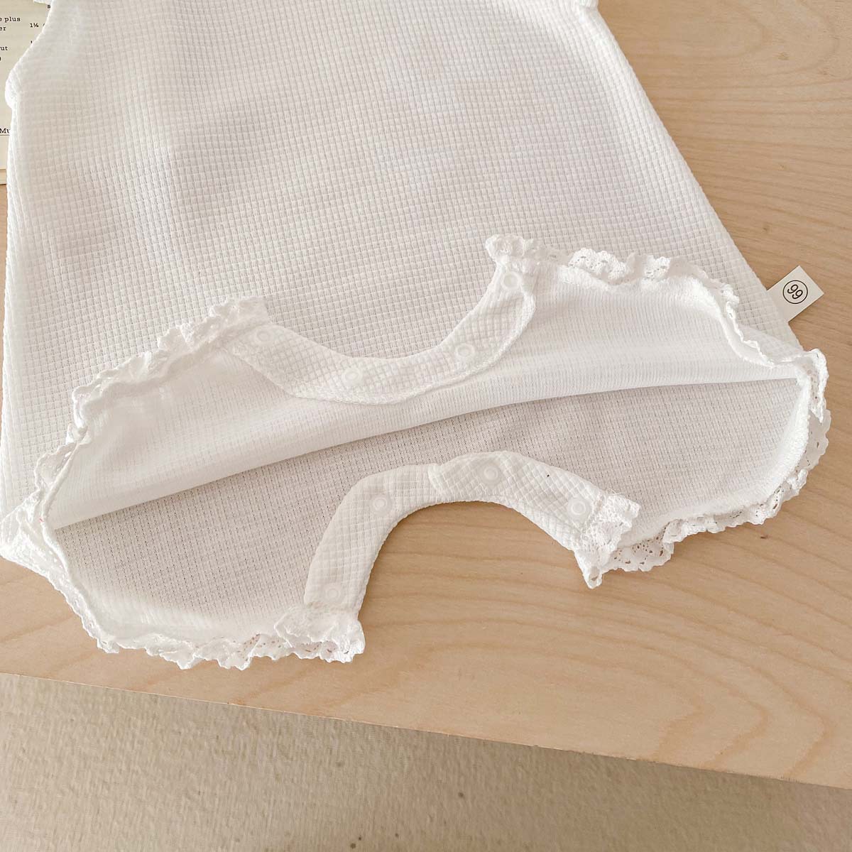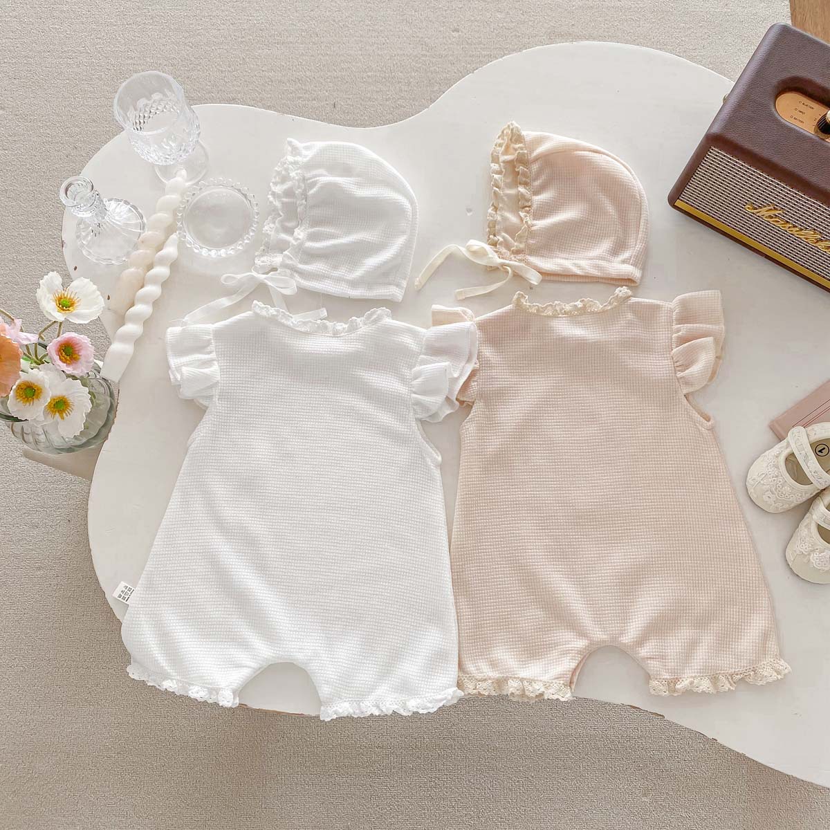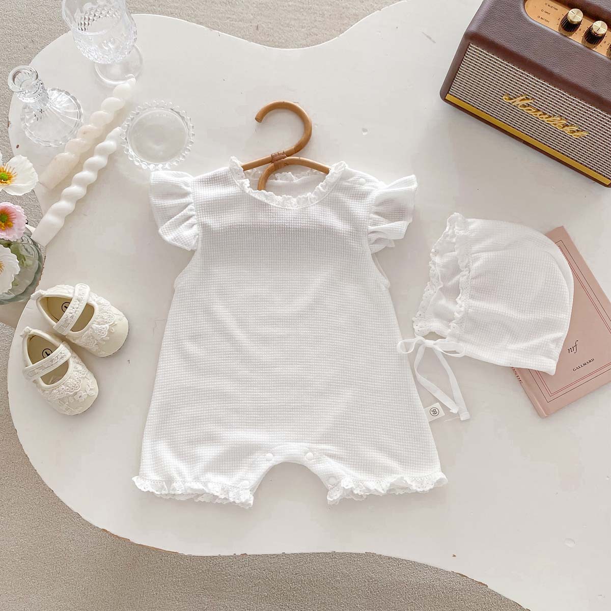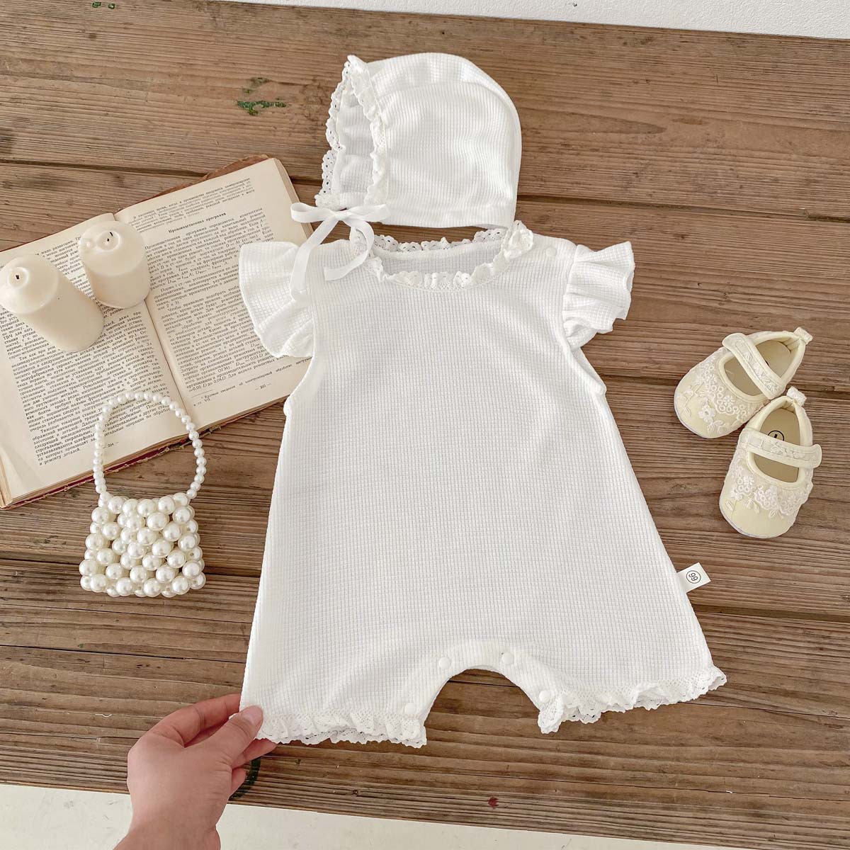 INS 한국판 여름 아기 소녀 와플 레이스 점프 수트 비행 소매 얇은 모자 등반 옷 신생아 옷