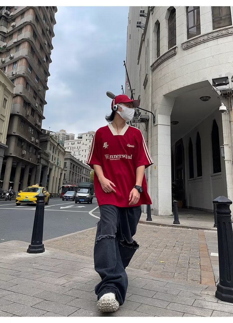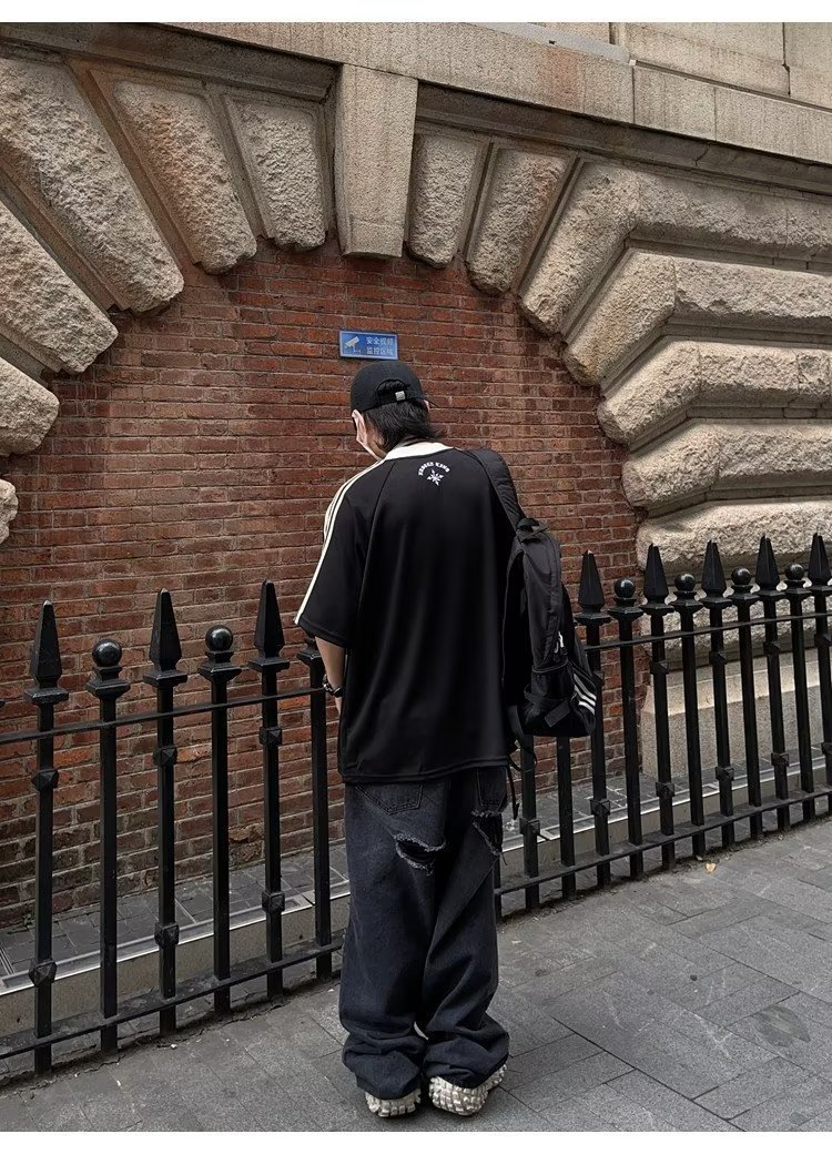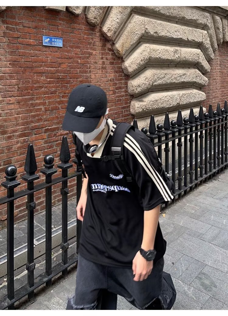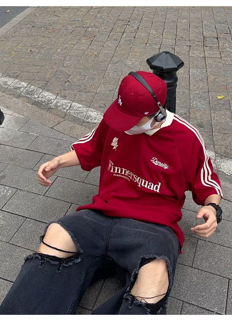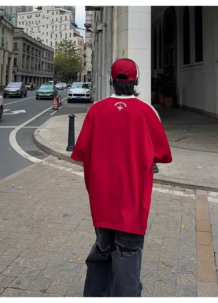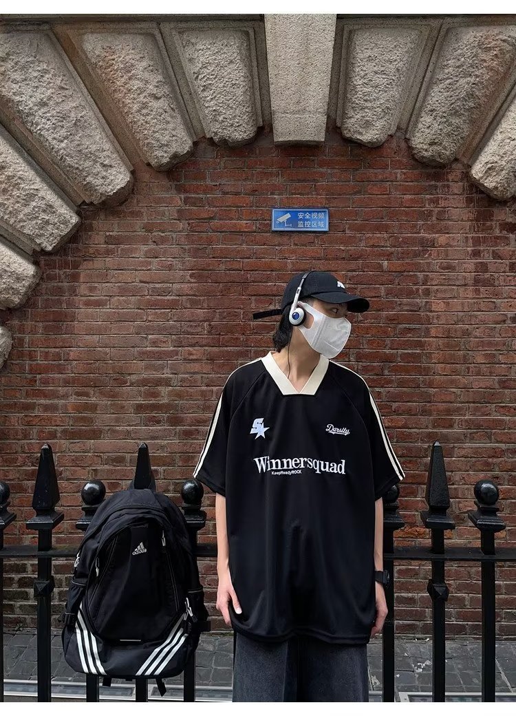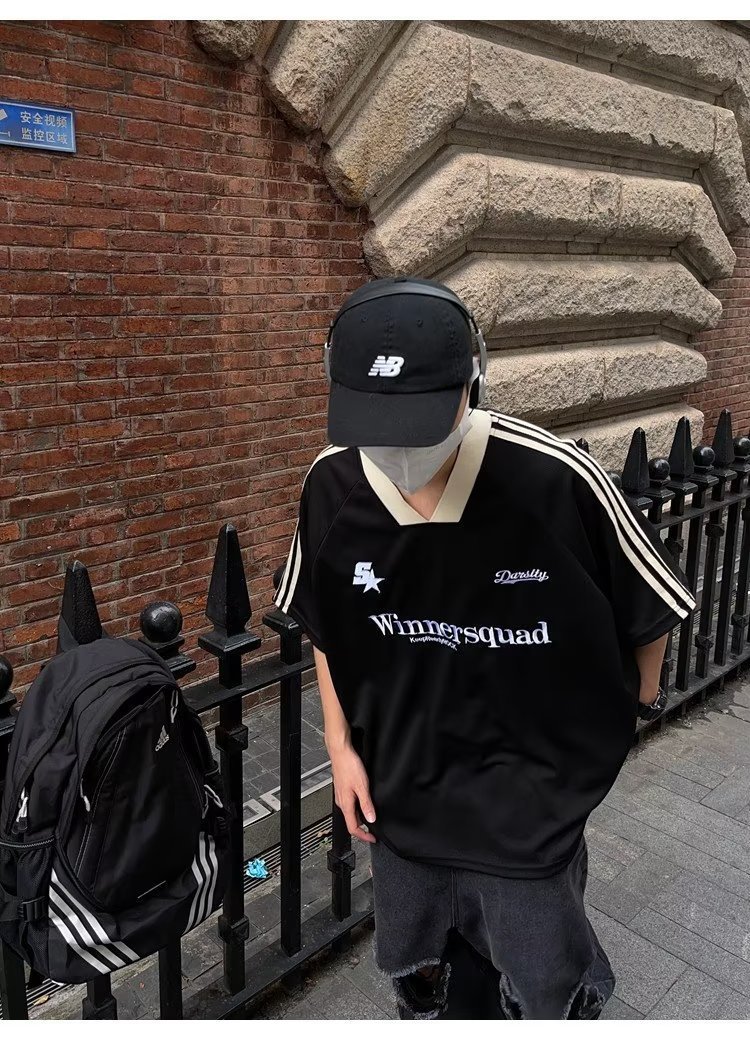 미국 하이 스트리트 프린트 스티칭 V 넥 반팔 티셔츠 남성과 여성의 느슨한 힙 하프 슬리브 느슨한 저지 패션스토어 가기