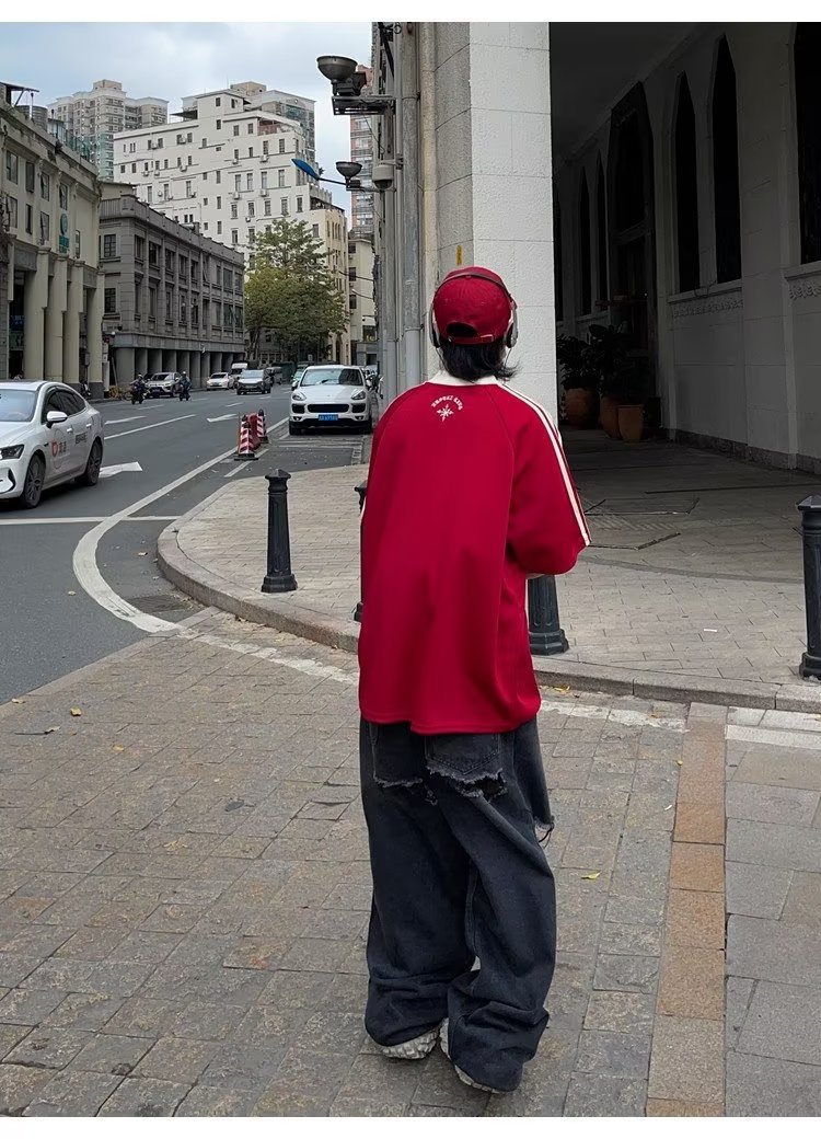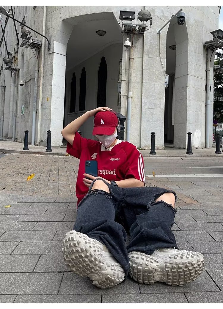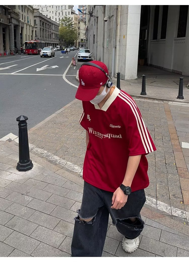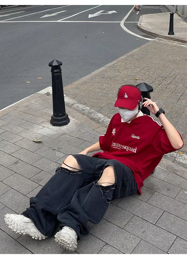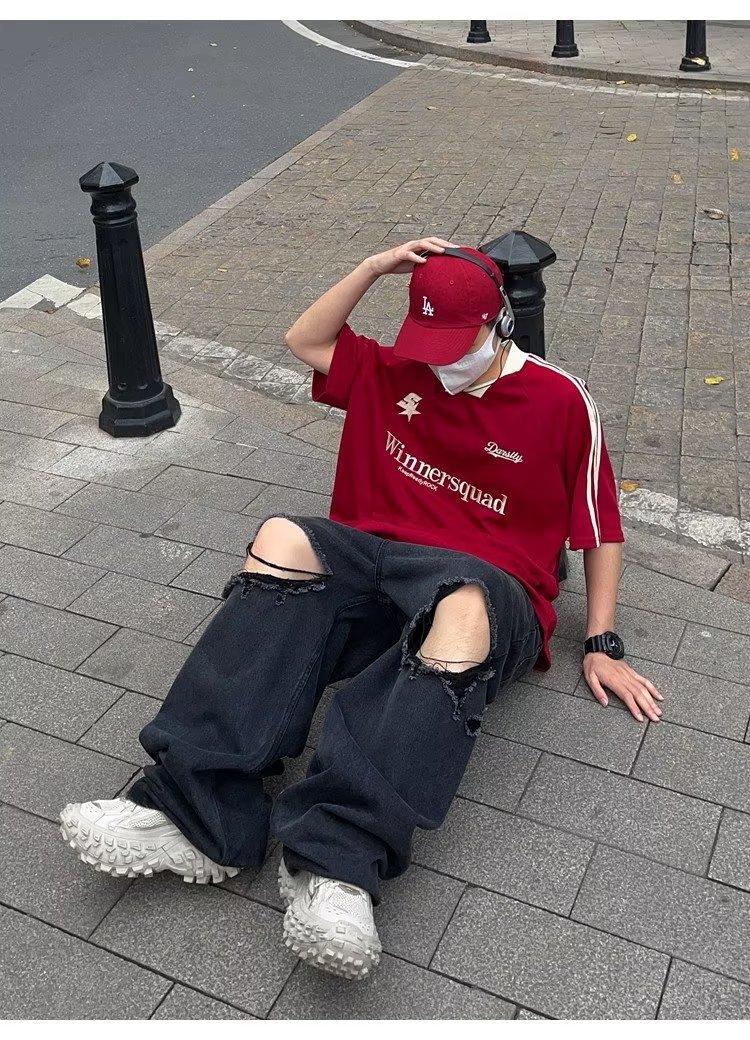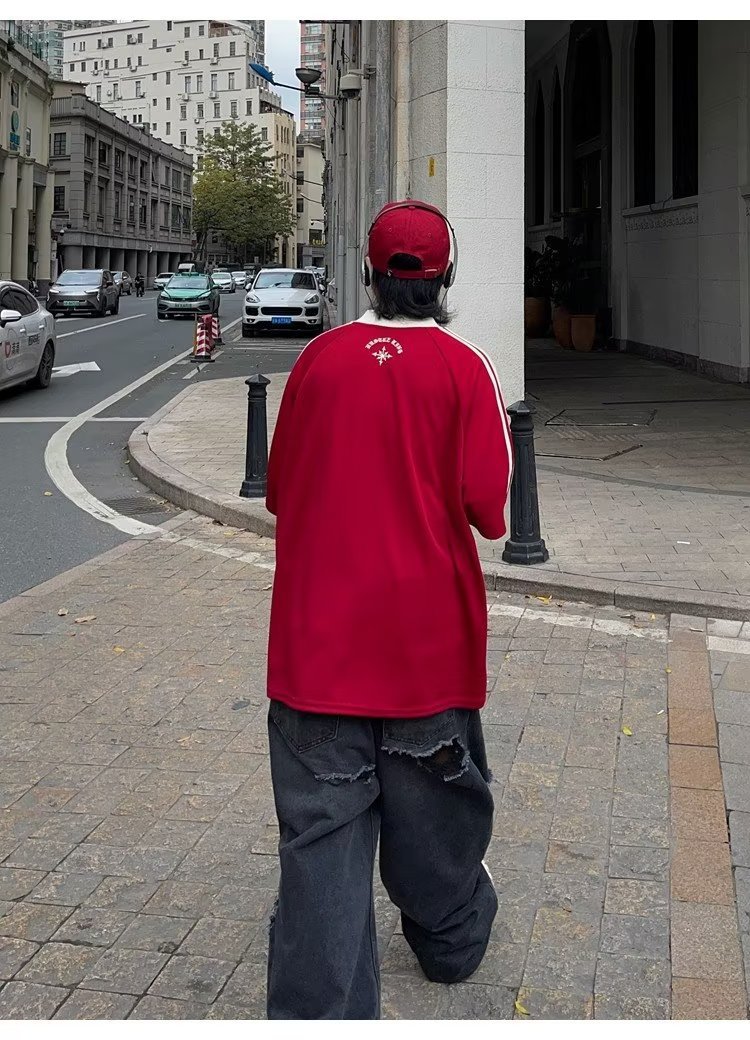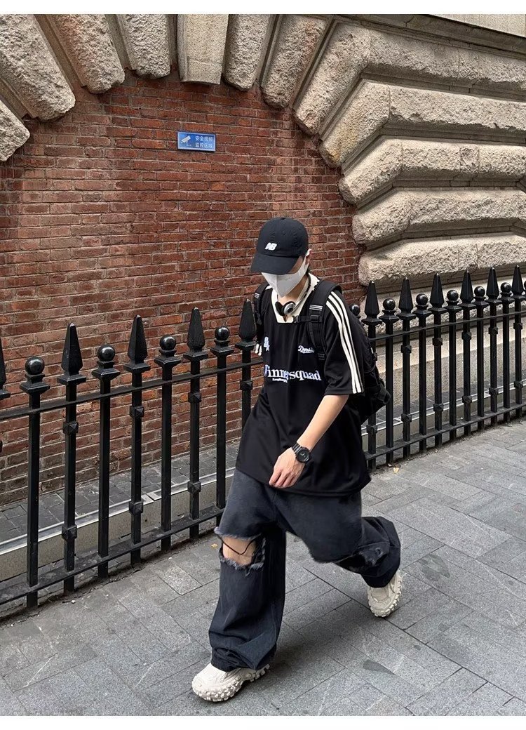 미국 하이 스트리트 프린트 스티칭 V 넥 반팔 티셔츠 남성과 여성의 느슨한 힙 하프 슬리브 느슨한 저지 패션스토어 가기