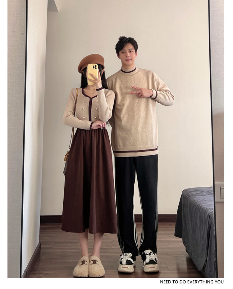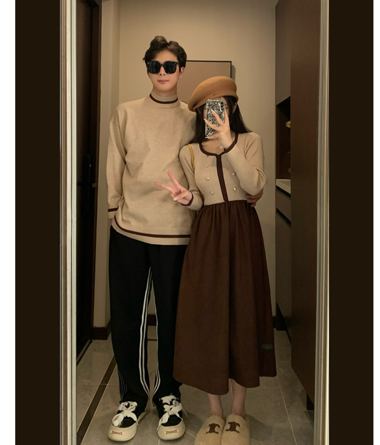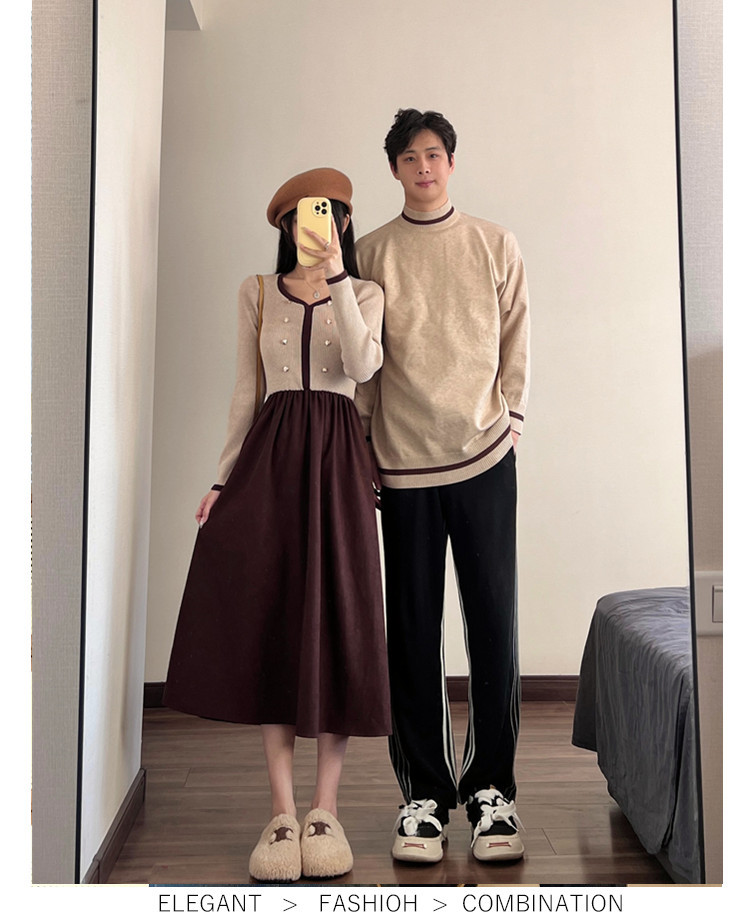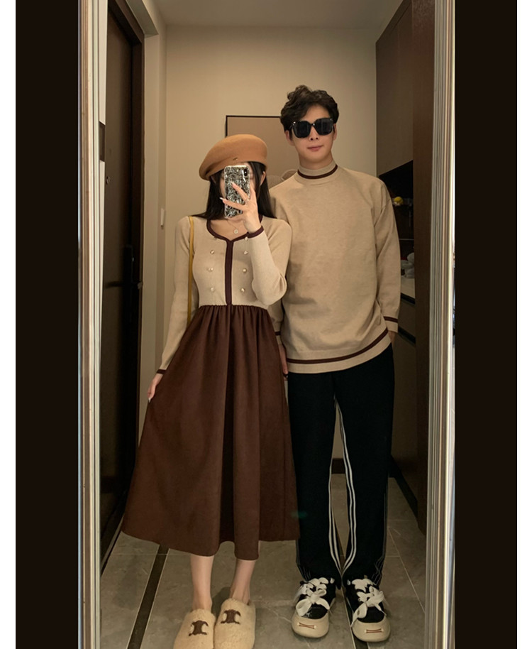 2024 커플 봄 옷 여성 스티칭 원피스 남성 둥근 목 니트 원피스 배달스토어 가기