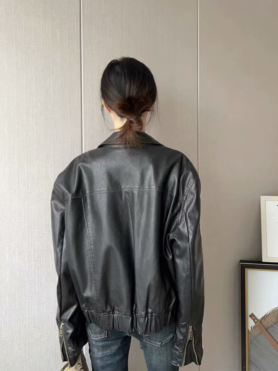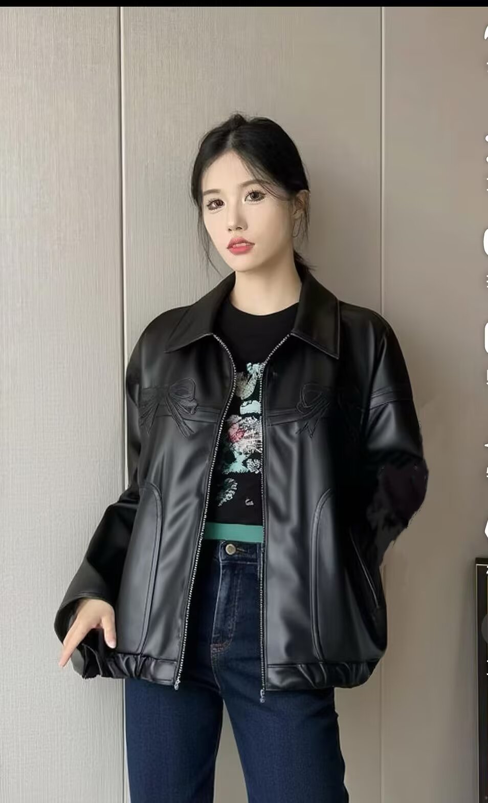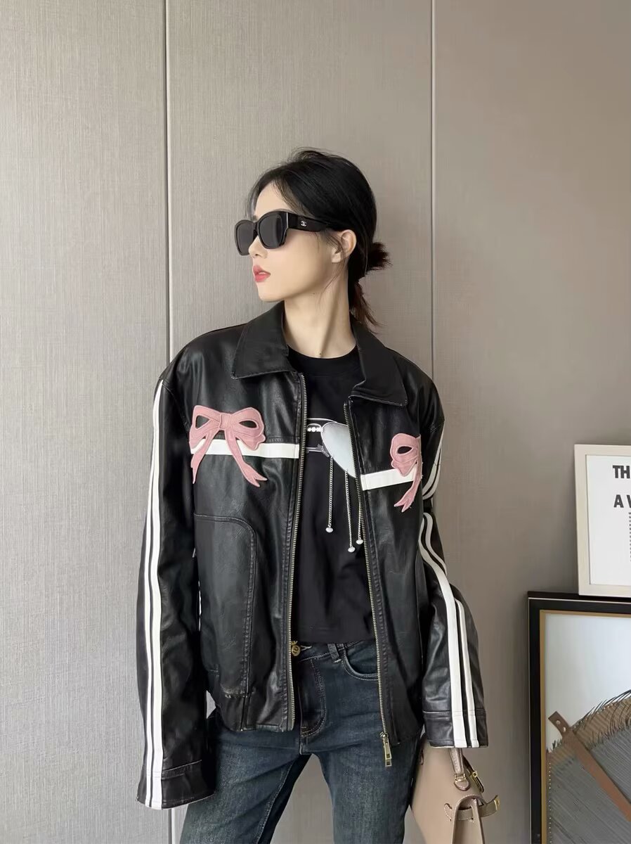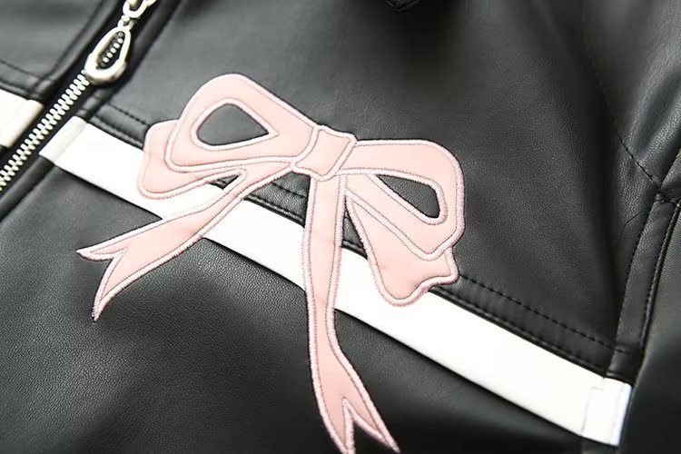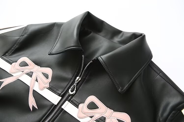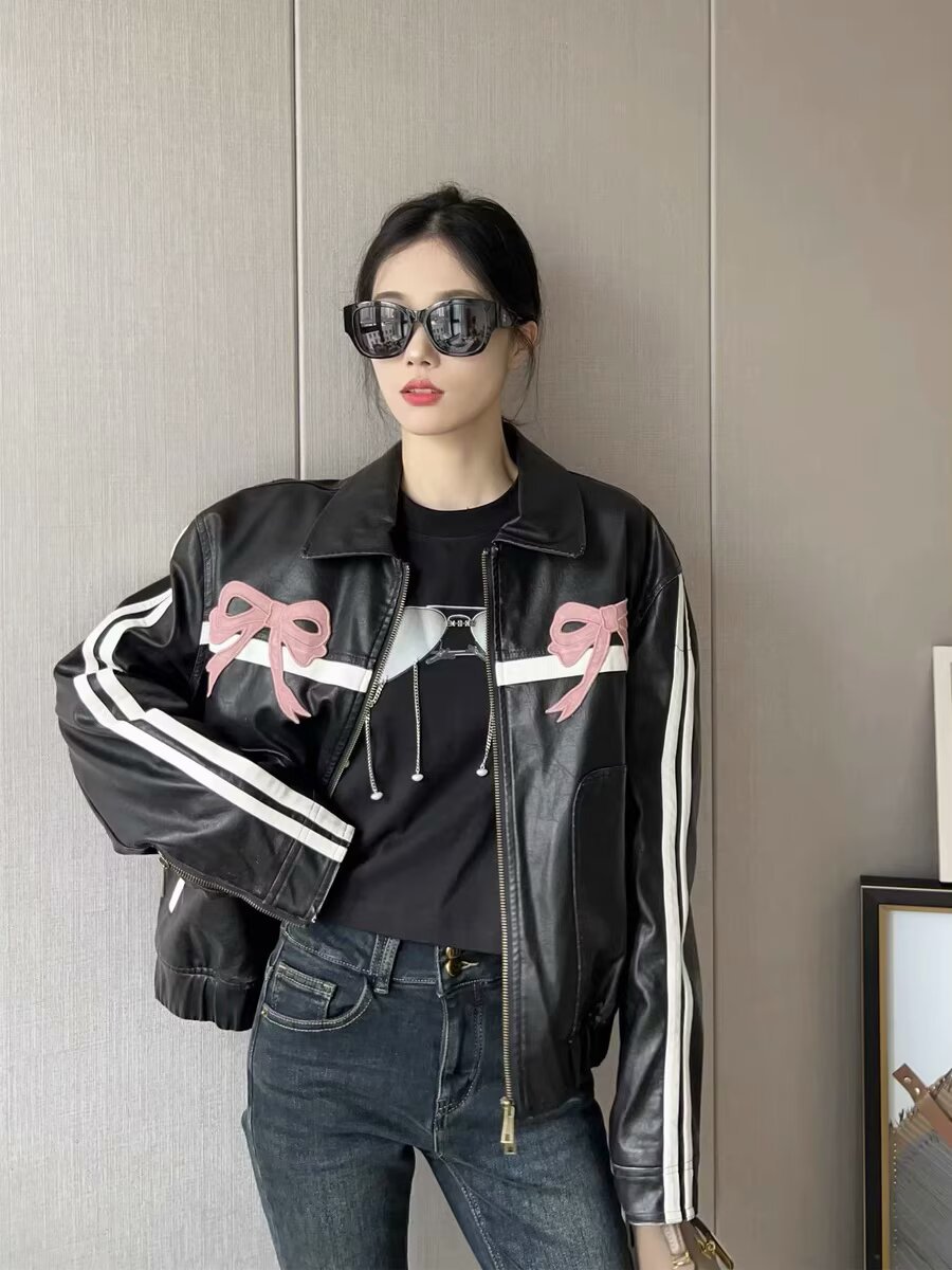 2025 가을 겨울 신상 유럽 및 미국 여성복 달콤하고 시크한 리본 자수 가죽 재킷 w034 23215