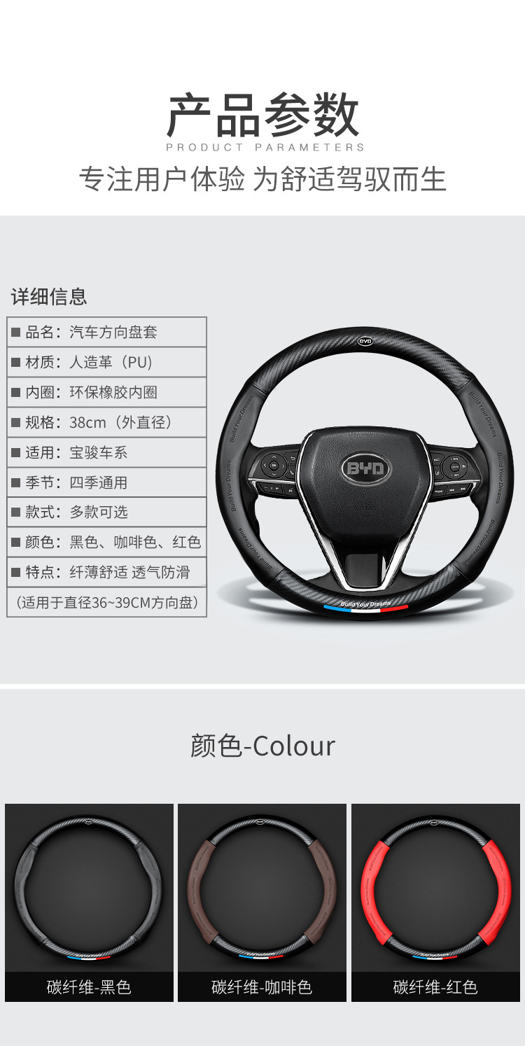 BYD 자동차 스티어링 휠 커버 탄소 섬유 3D 양각 스포츠 3 색 미끄럼 방지 마모 통기성 가죽 그립 커버스토어 가기