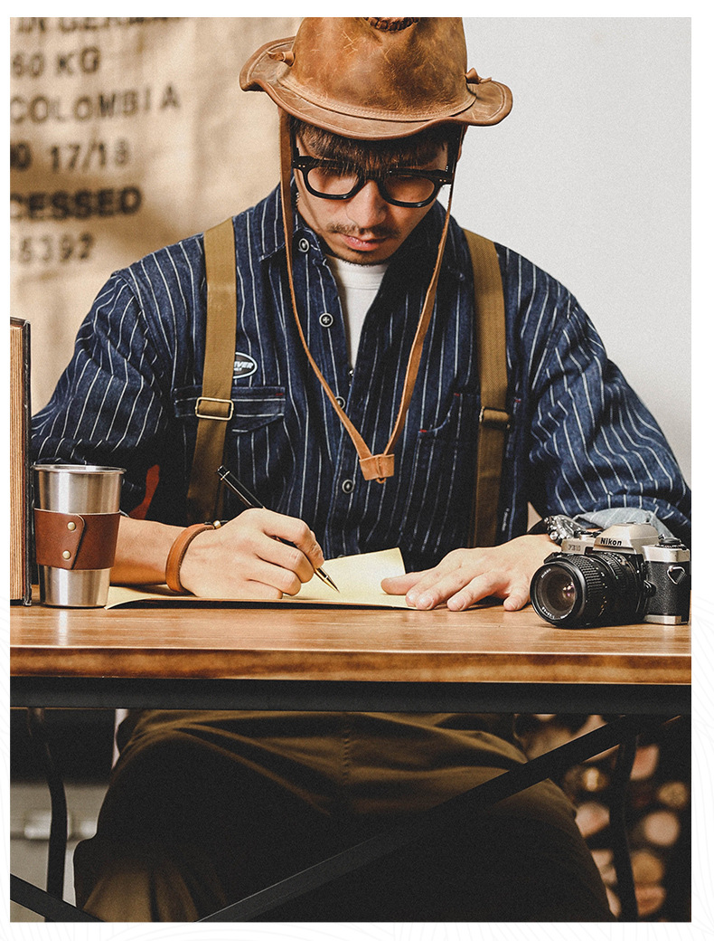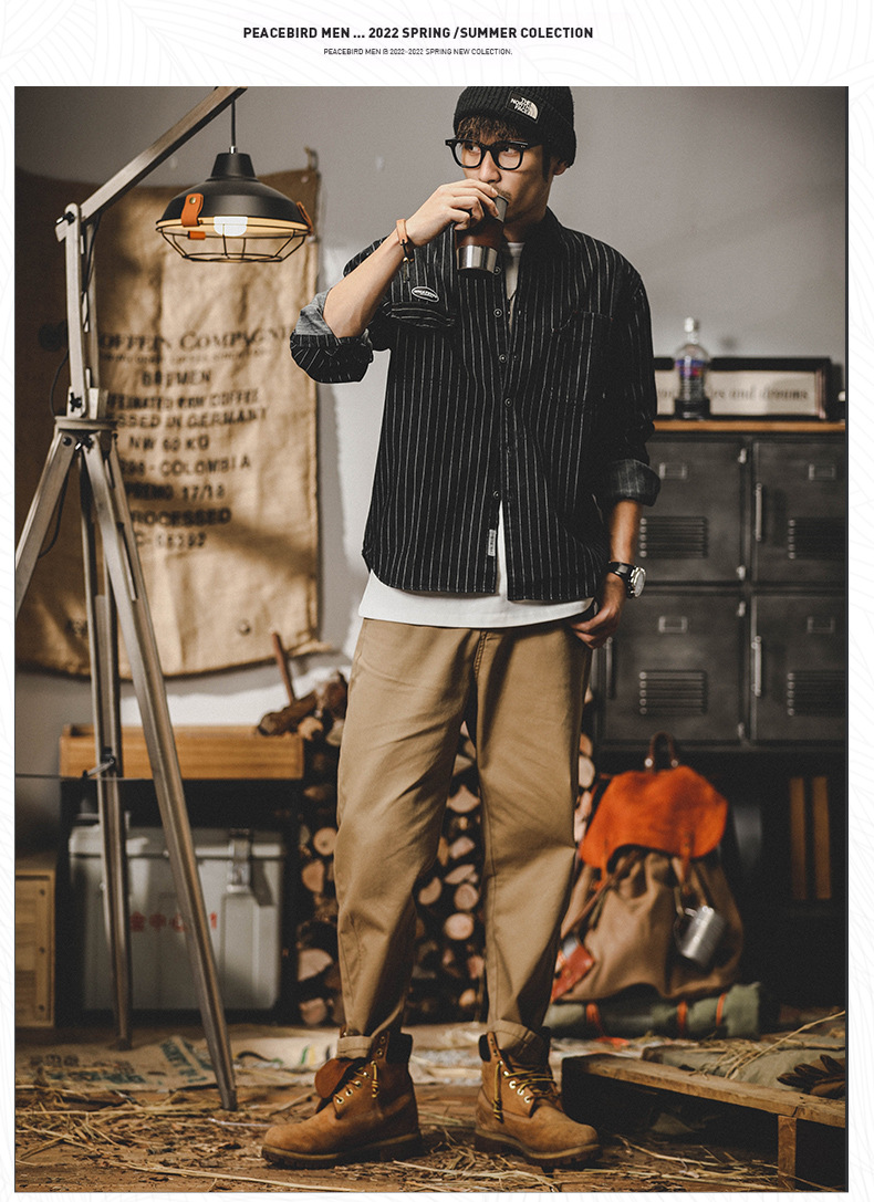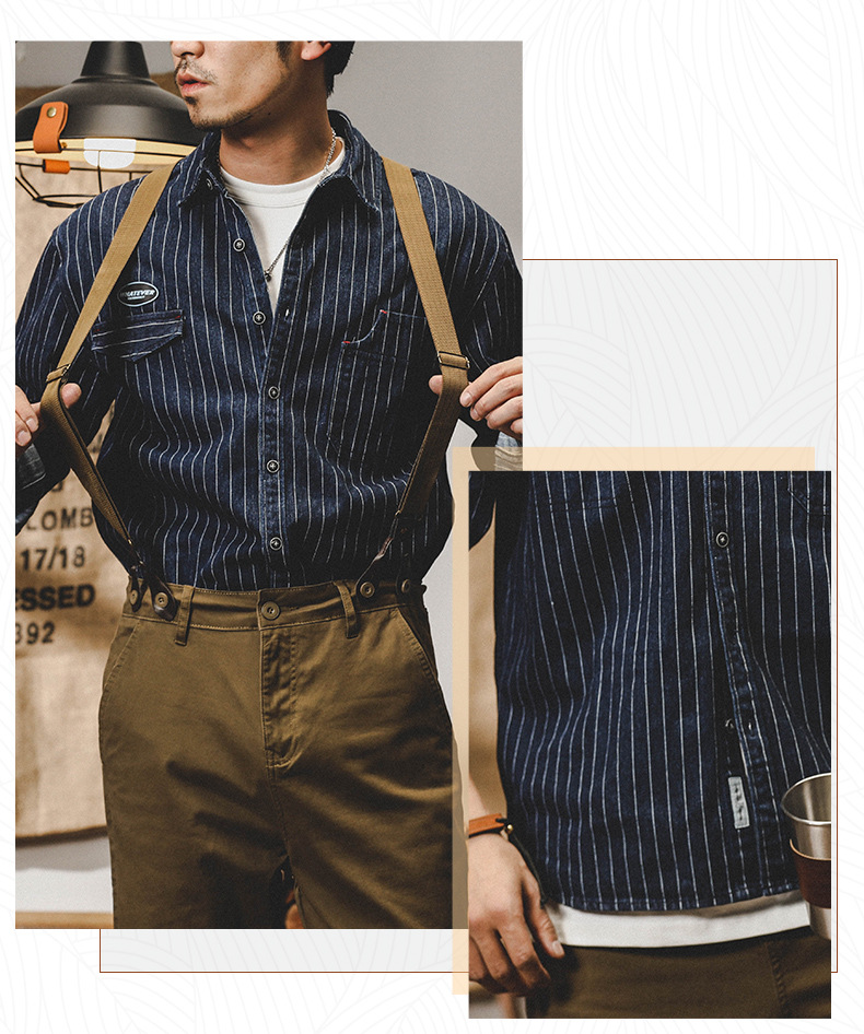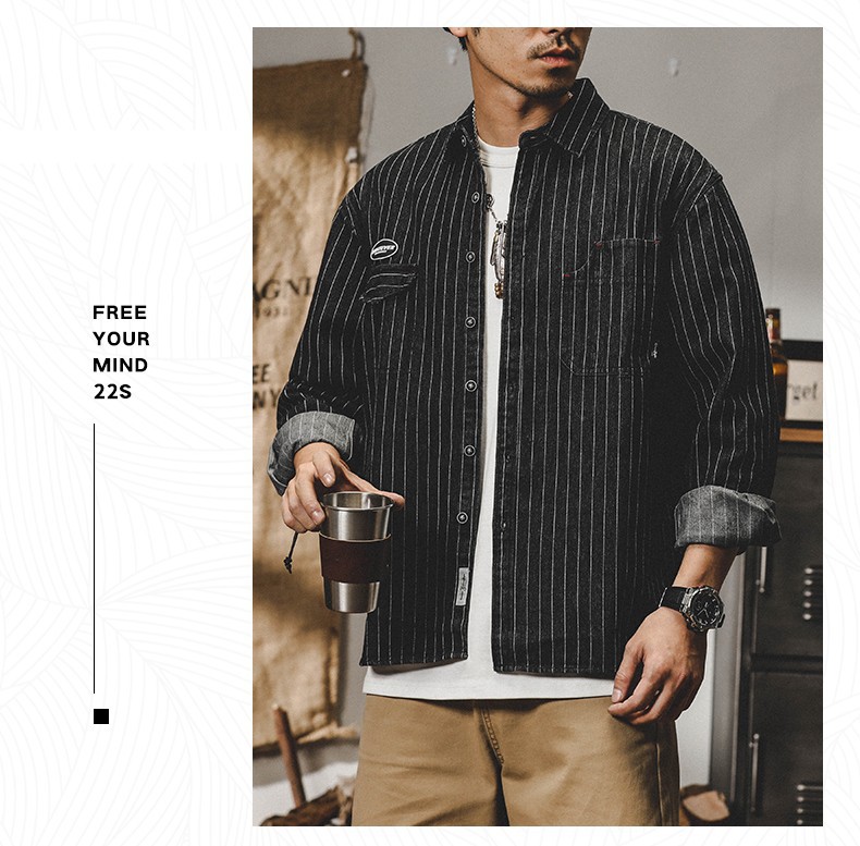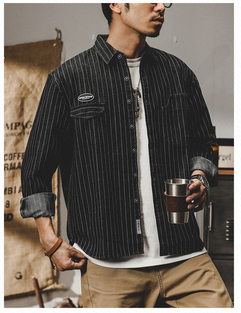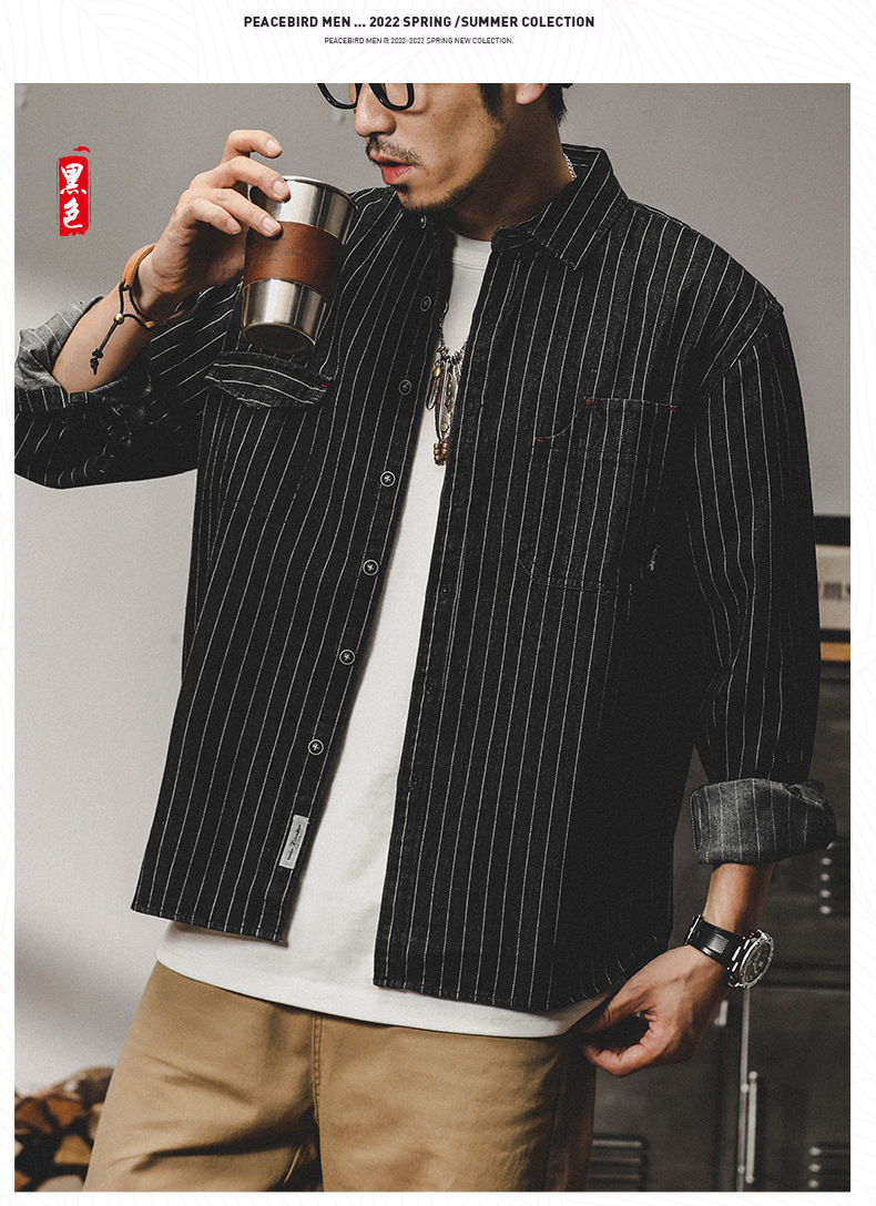 미국 스타일의 무거운 줄무늬 데님 셔츠 남자의 긴 소매 2024 새로운 느슨한 작업복 셔츠 남자의 봄과 가을 코트 남자