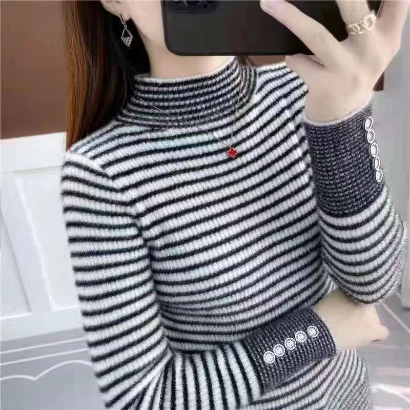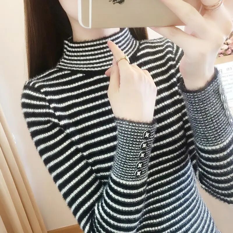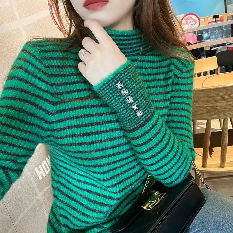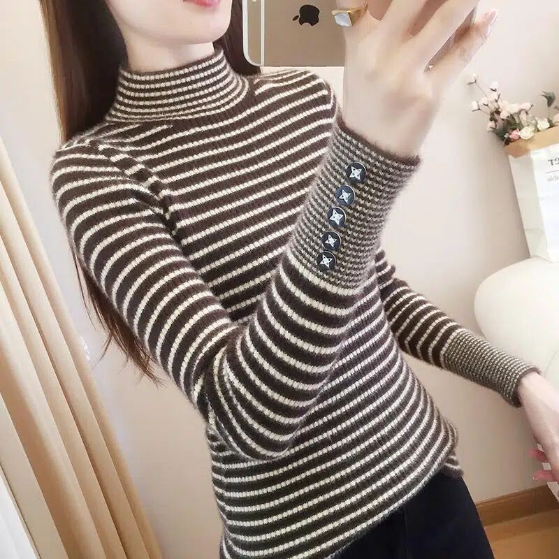 여성을위한 2024 바지 셔츠 새로운 인기 스트라이프 니트 스웨터 한국 스타일 슬림 핏 슬리밍 캐주얼 올 매칭 탑