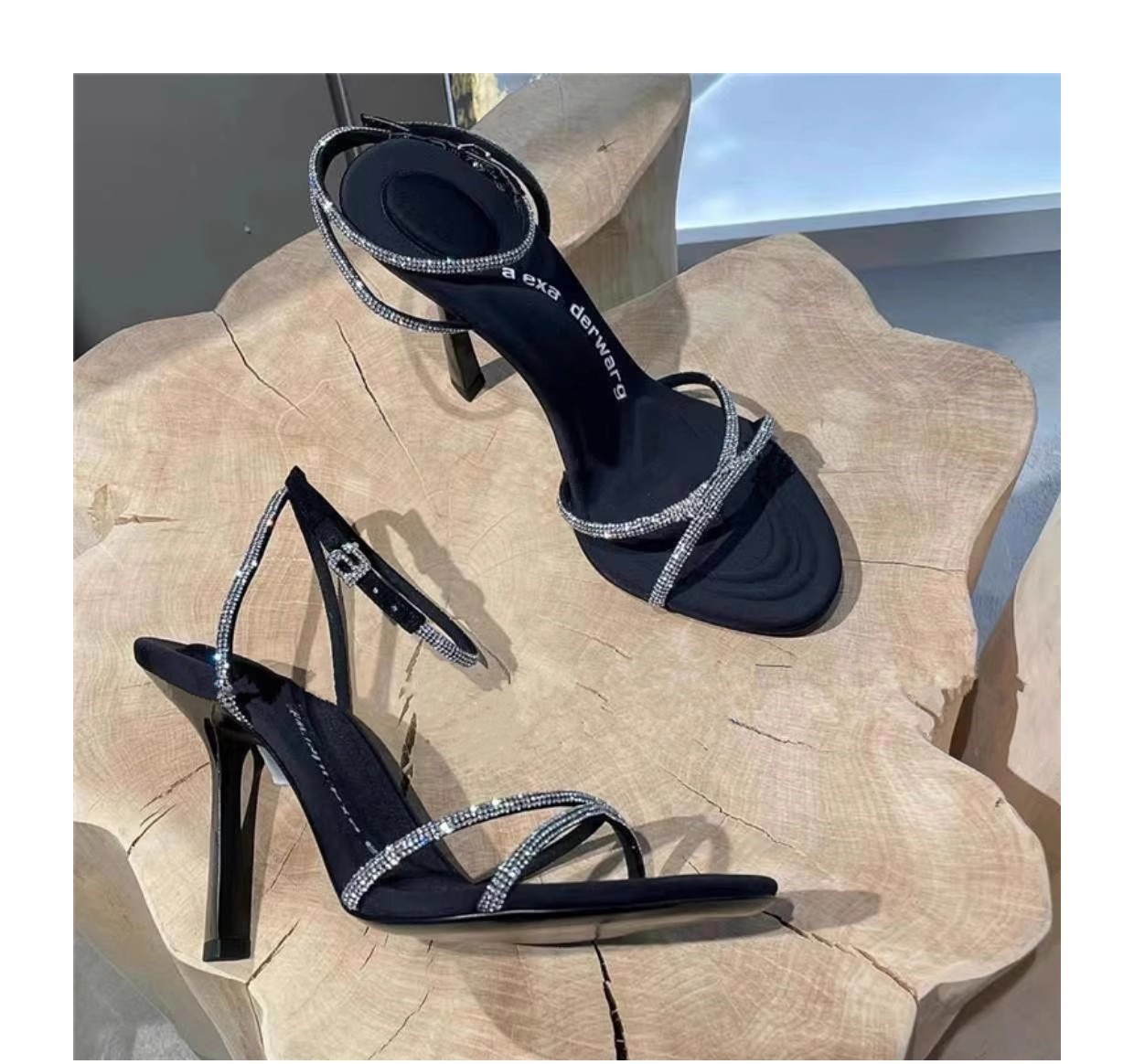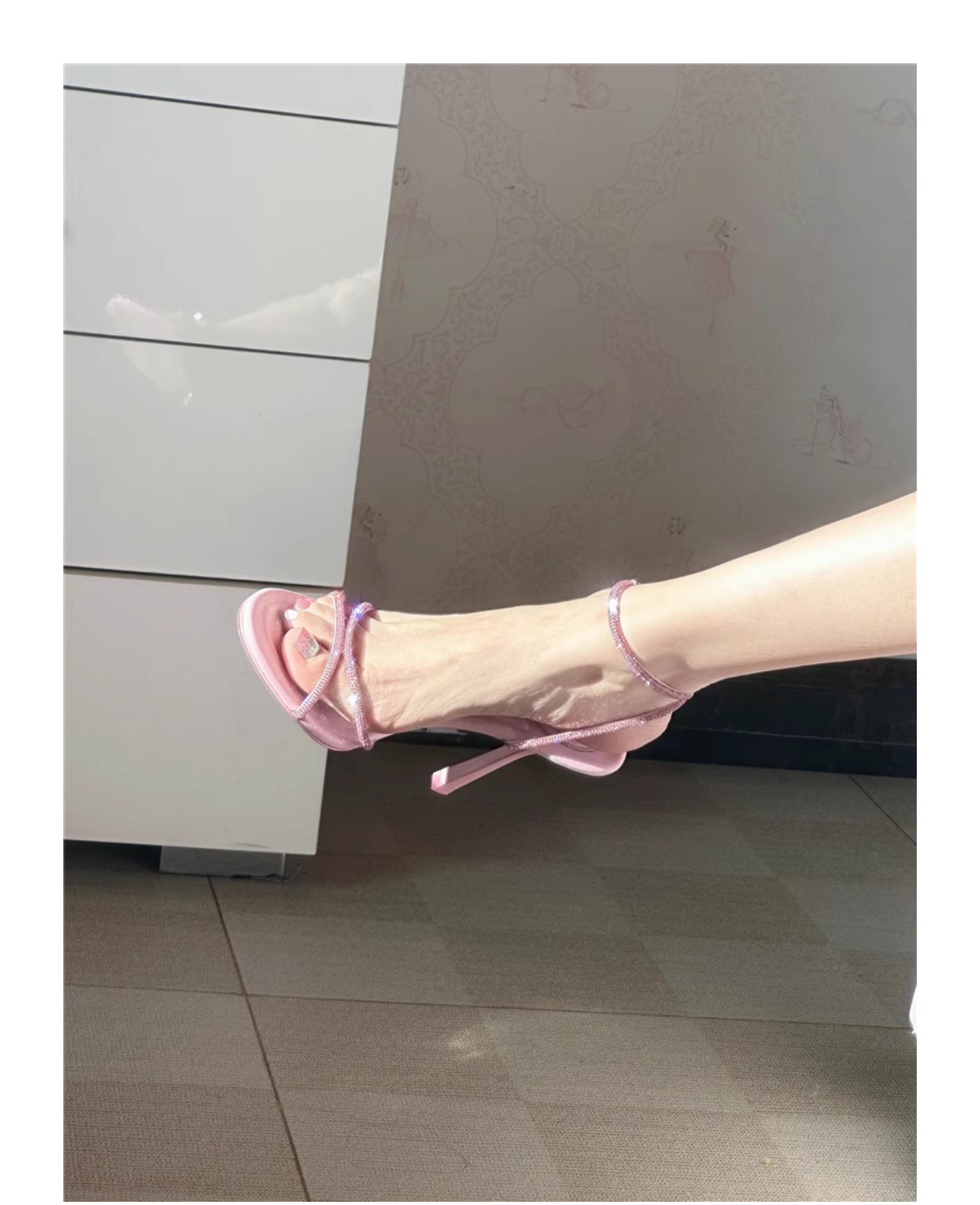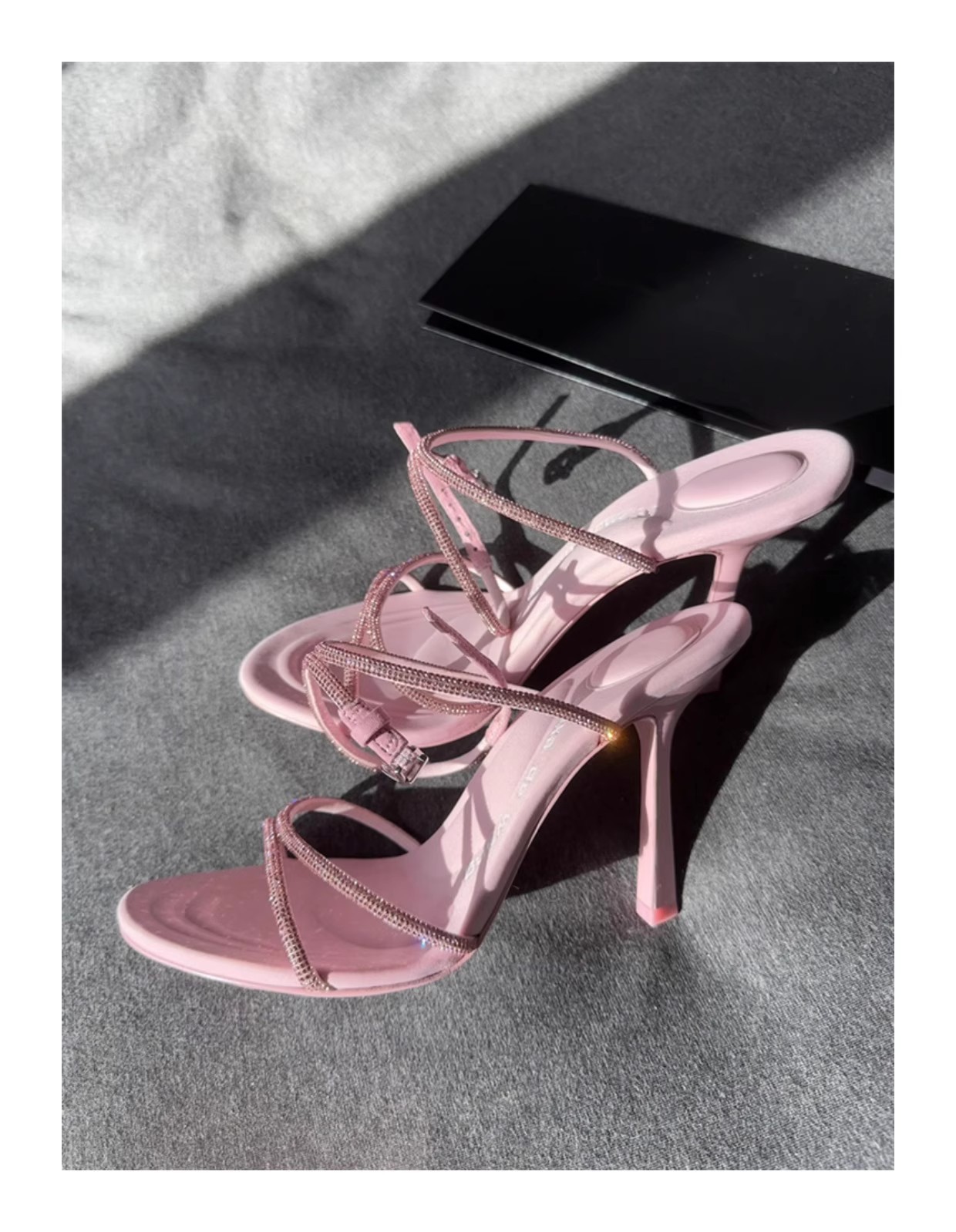 2023 년 봄과 여름 여성을위한 새로운 핑크 하이힐 여성 스틸레토 섹시 오픈 발가락 버클 스트랩 라인스톤 레터 샌들