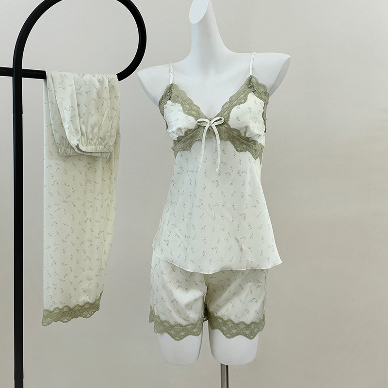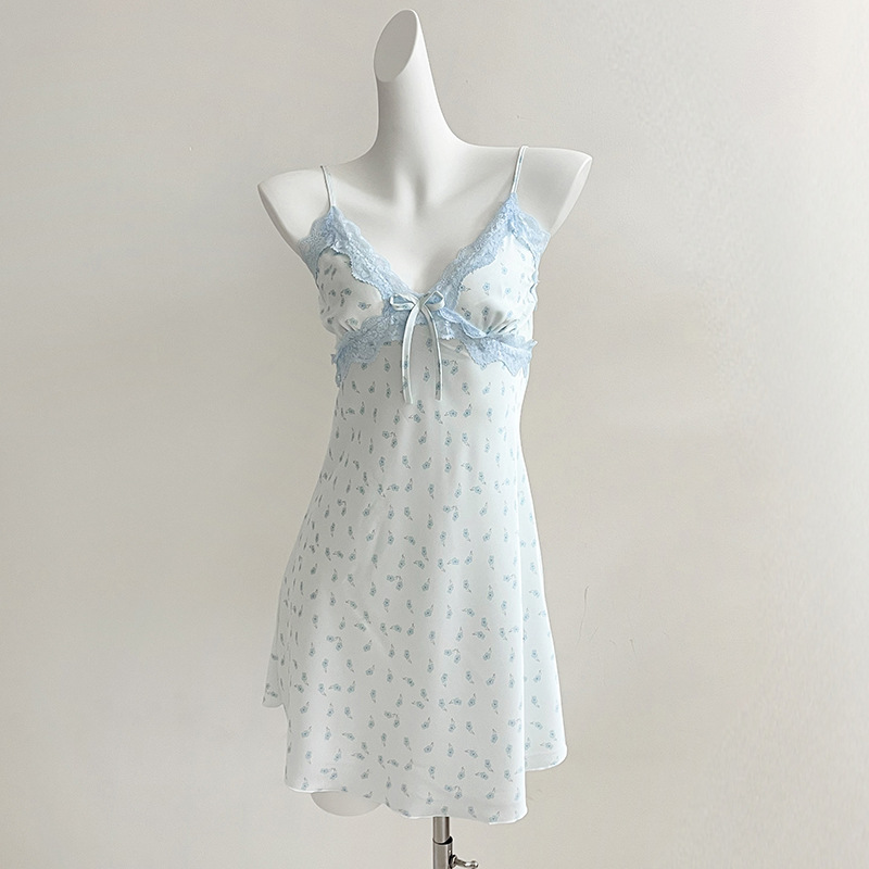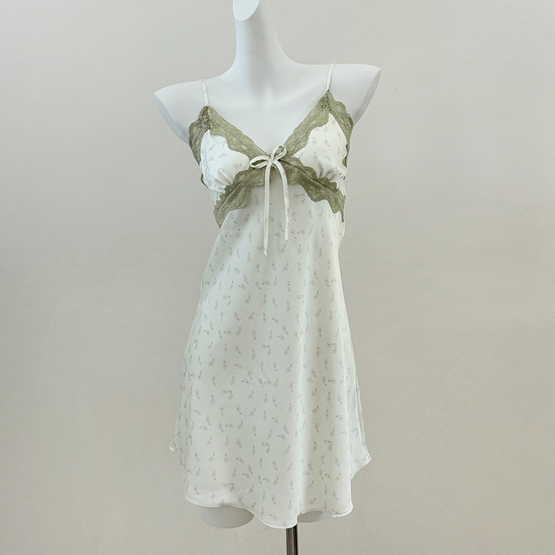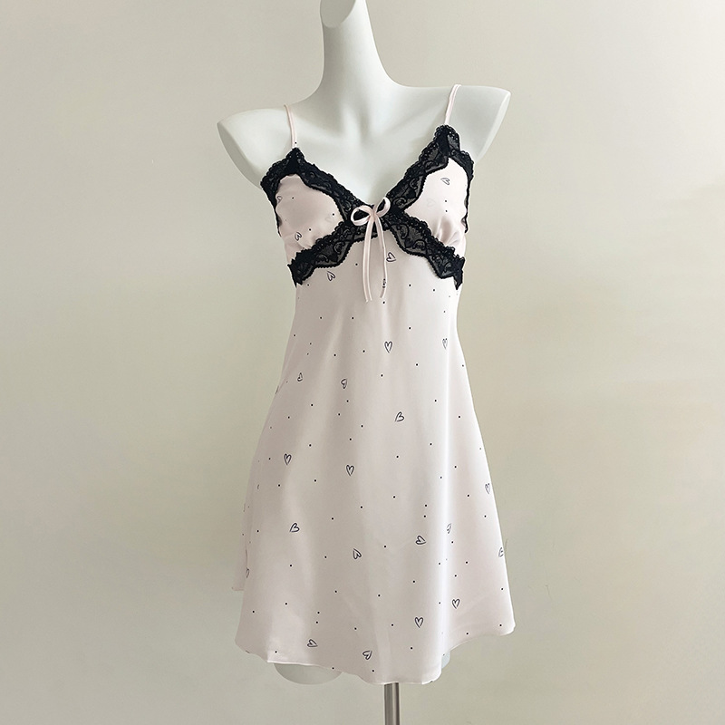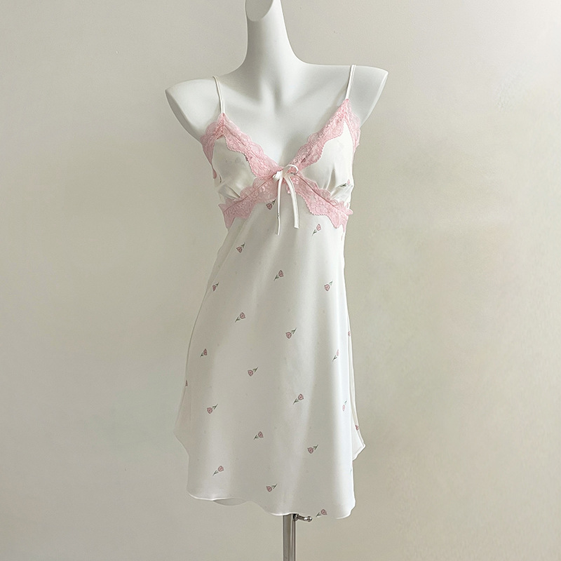 가슴 패드가있는 여성용 섹시한 서스펜더 잠옷, 아이스 실크 여성용 홈웨어, 프린트 서스펜더 잠옷, 여성스러운 홈웨어스토어 가기