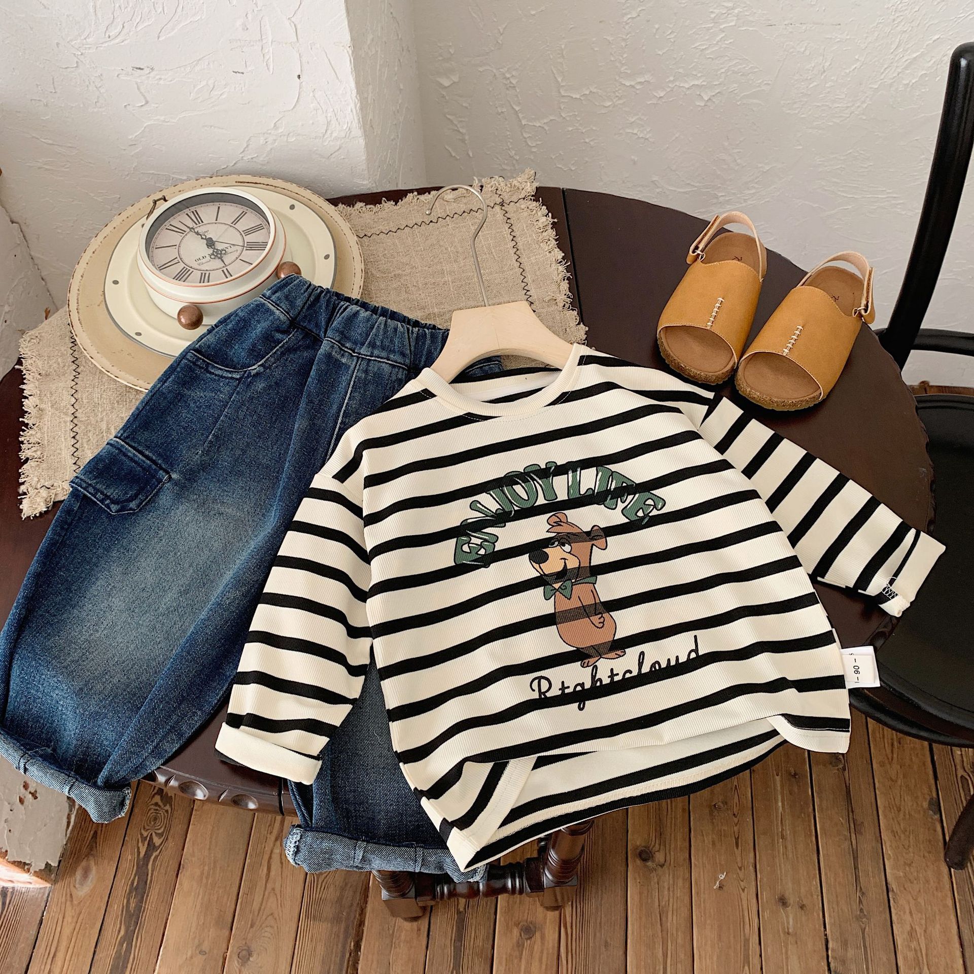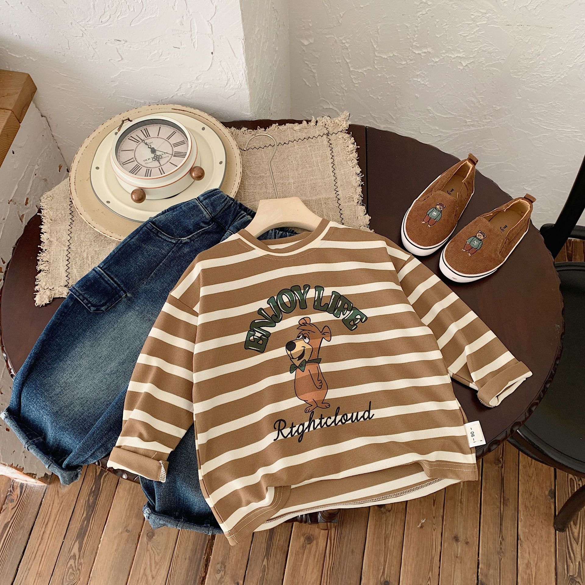 어린이 티셔츠 Bangcheng 소년 바닥 셔츠 25 가을 새로운 줄무늬 곰 인쇄 긴팔 캐주얼 탑 G0003스토어 가기