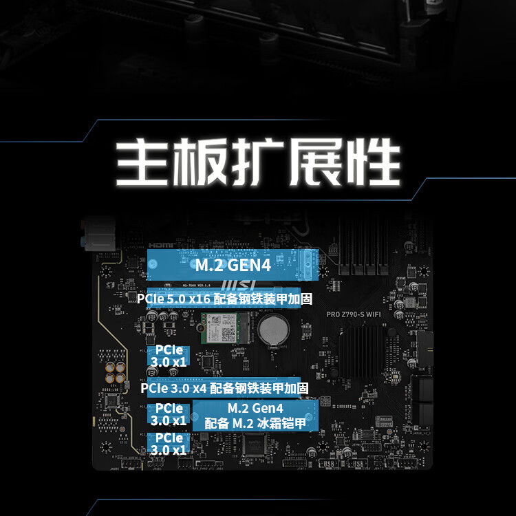 PCIe 5.0 x16 插槽(显卡专用,支持 x16/x8 模式),搭配 Steel Armor 金属加固技术,防止显卡插拔损坏de.msi.com。