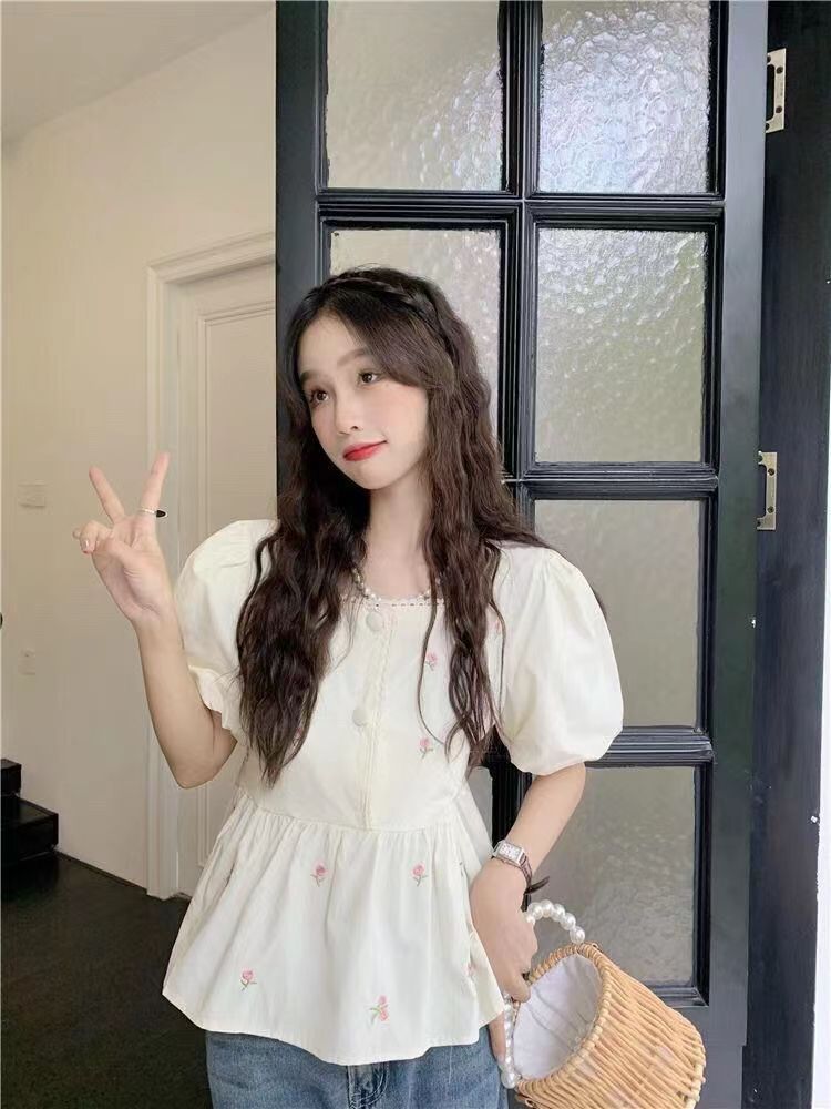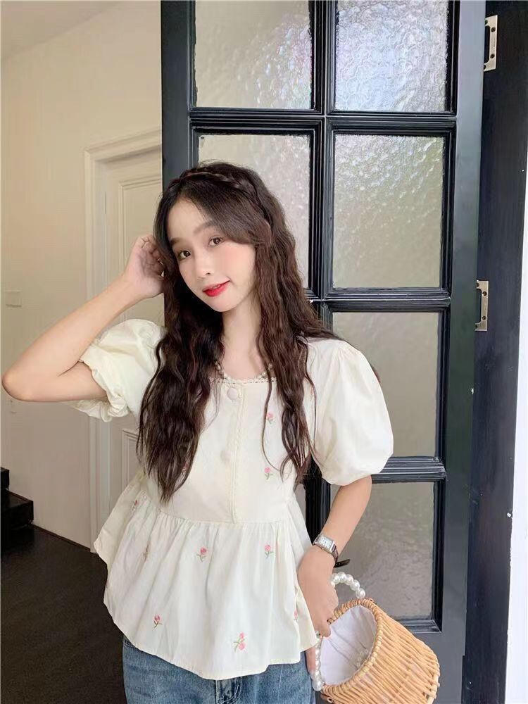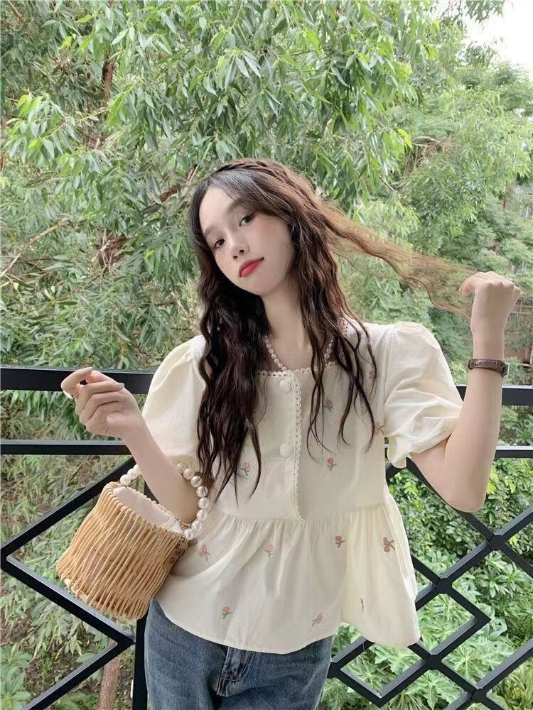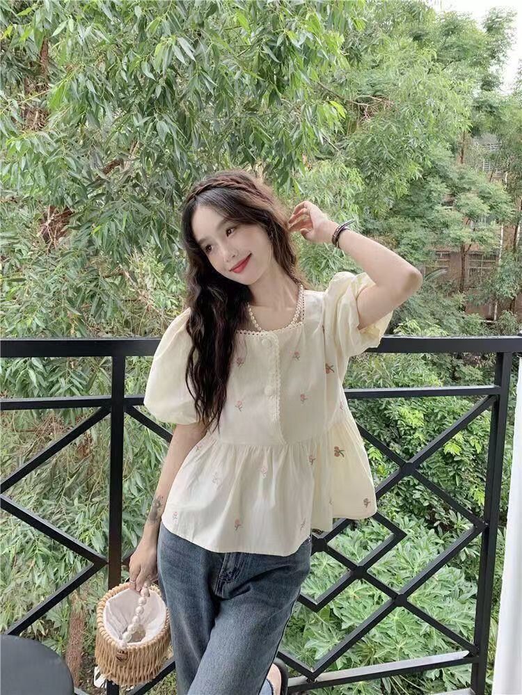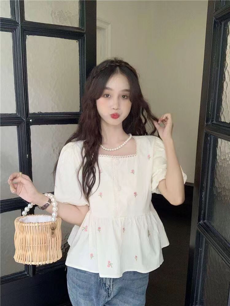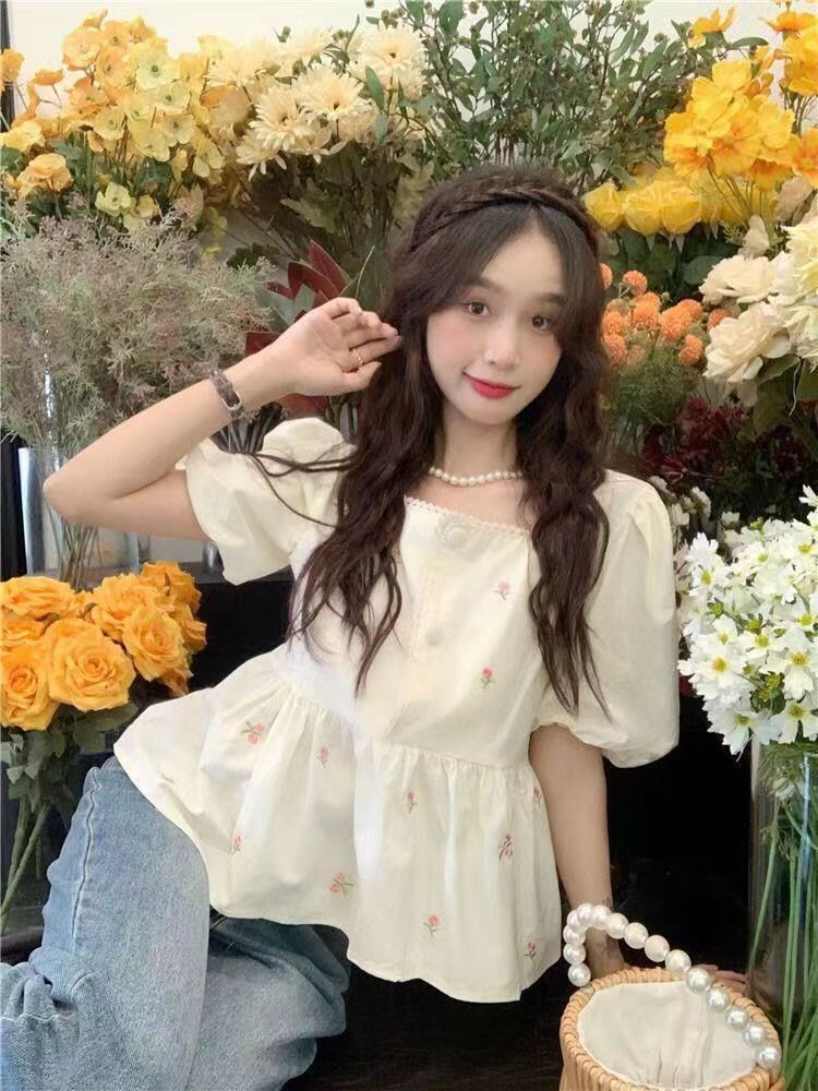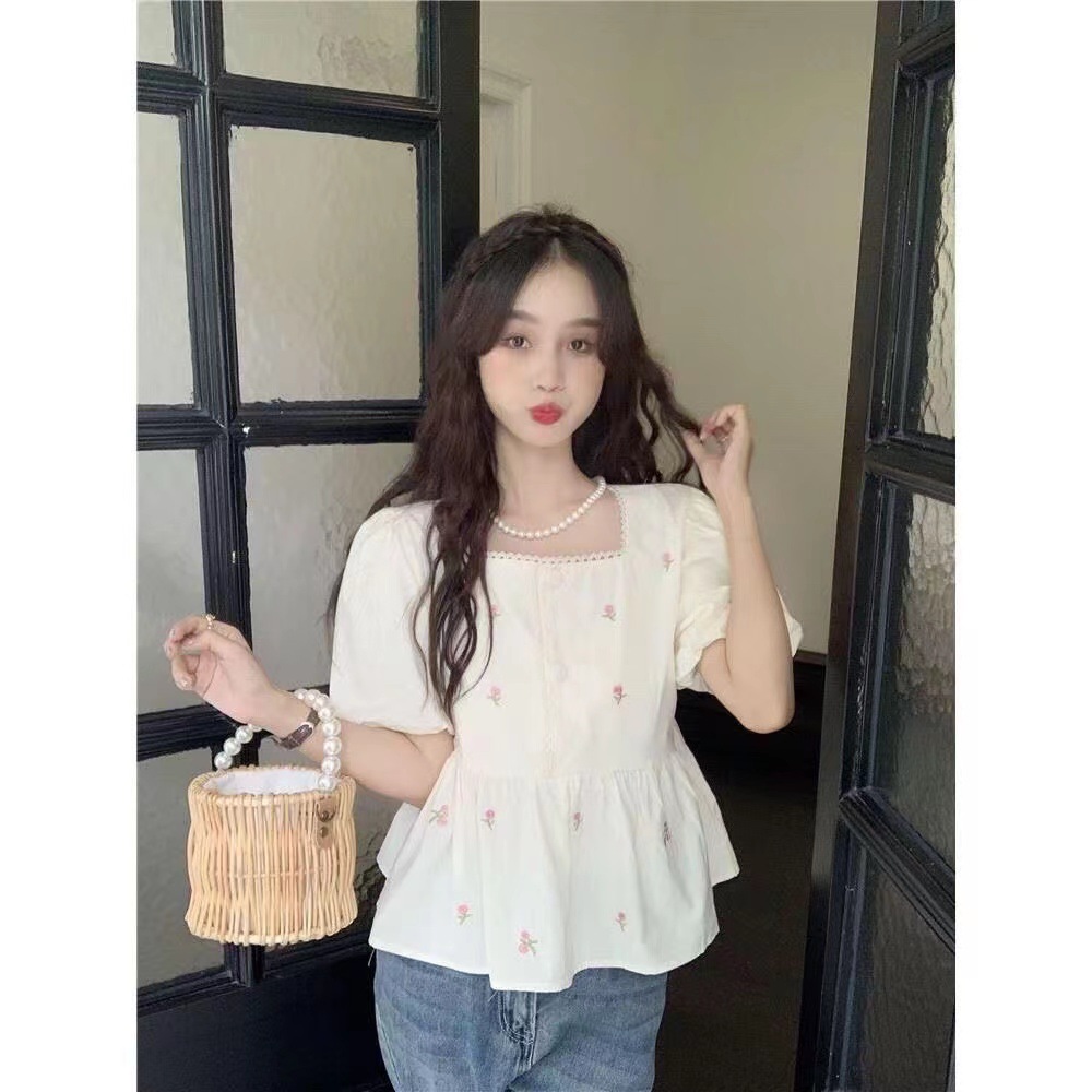 사각 넥라인과 퍼프 소매가 있는 플로럴 셔츠 2025 신상 달콤하고 세련된 루즈핏 반팔 여름 상의스토어 가기