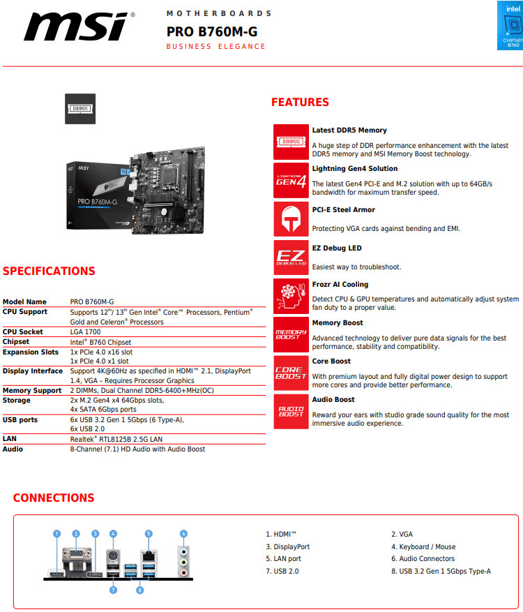 인텔 MSI PRO B760M BOMBER WIFI DDR5 폭발 폭탄 마더 보드