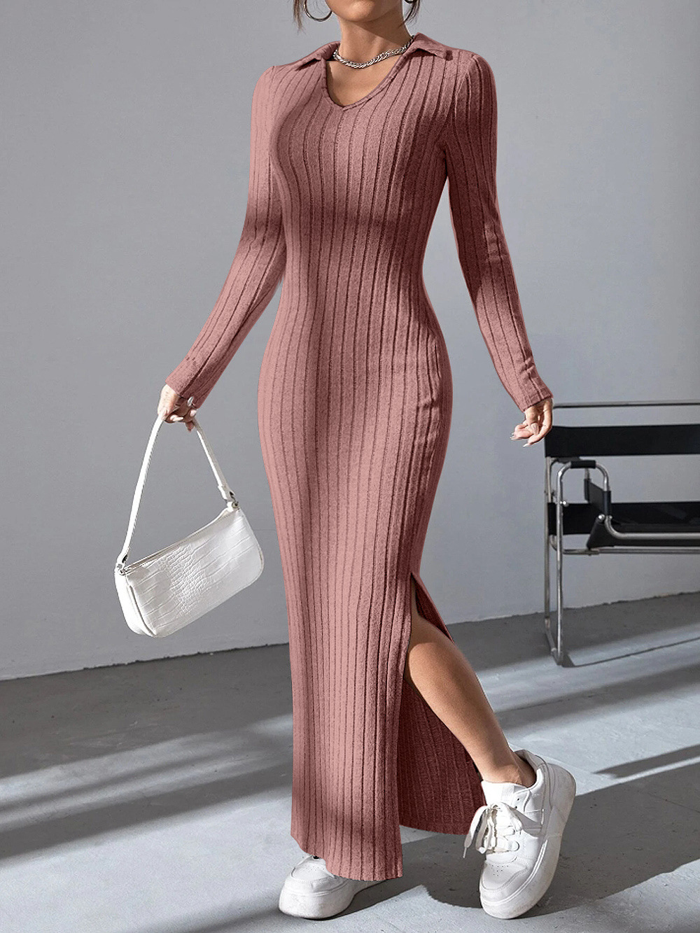 2024 봄과 여름 새로운 니트 슬림 옷깃 긴 소매 원피스 아마존 공급 피트 단색 단단한 원피스