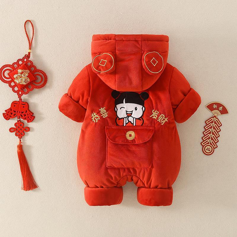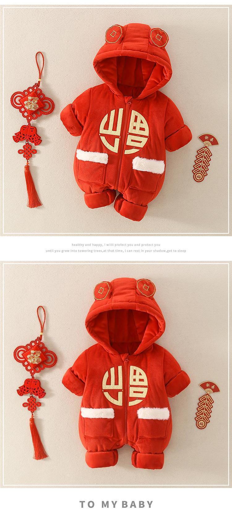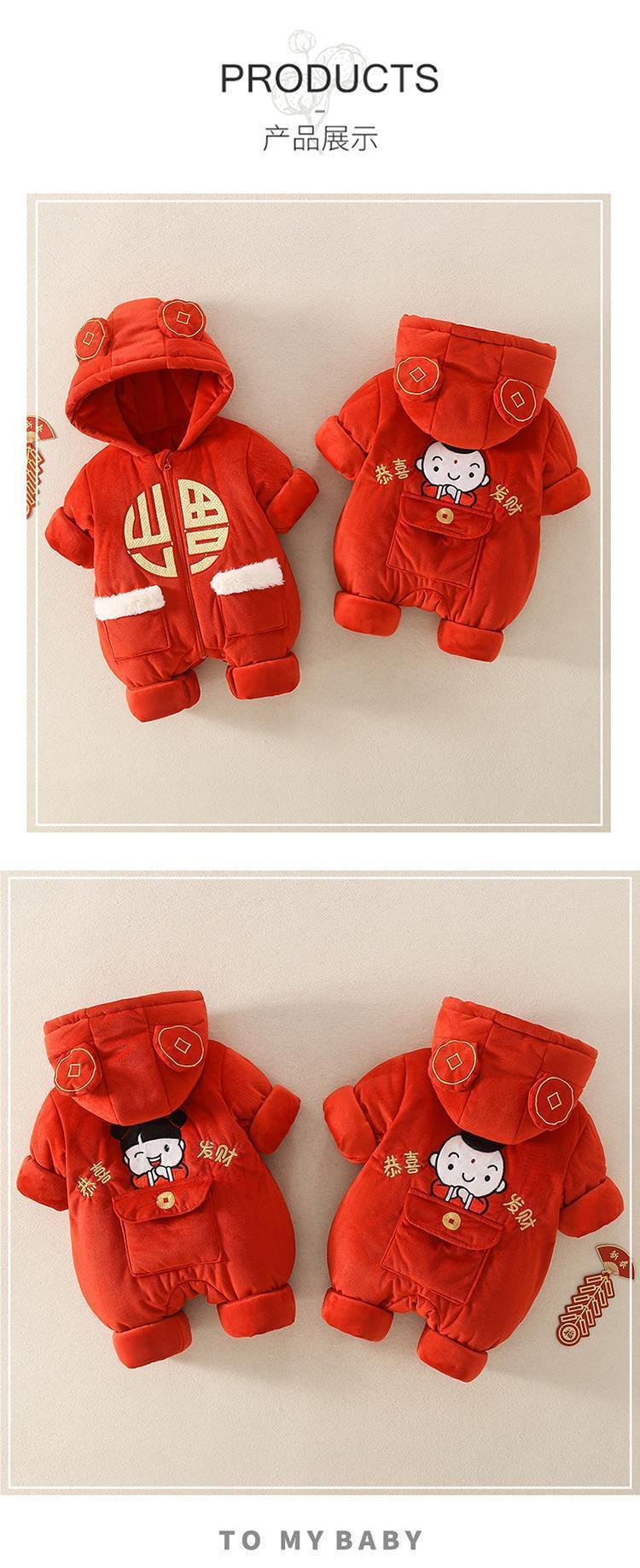 아기 새해 옷 겨울 두껍게 따뜻한 붉은 축제 남자와 여자 아기 한 달 된 새해 옷스토어 가기