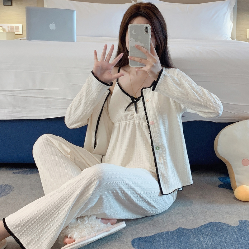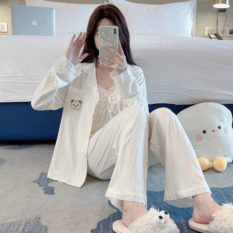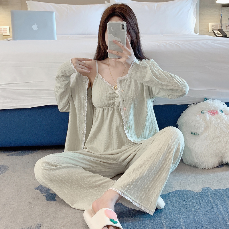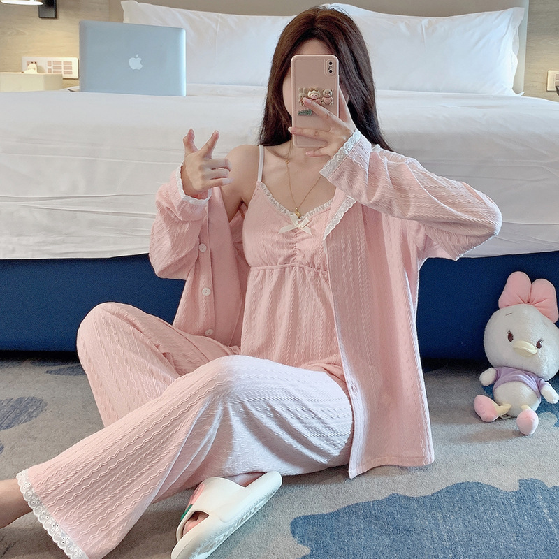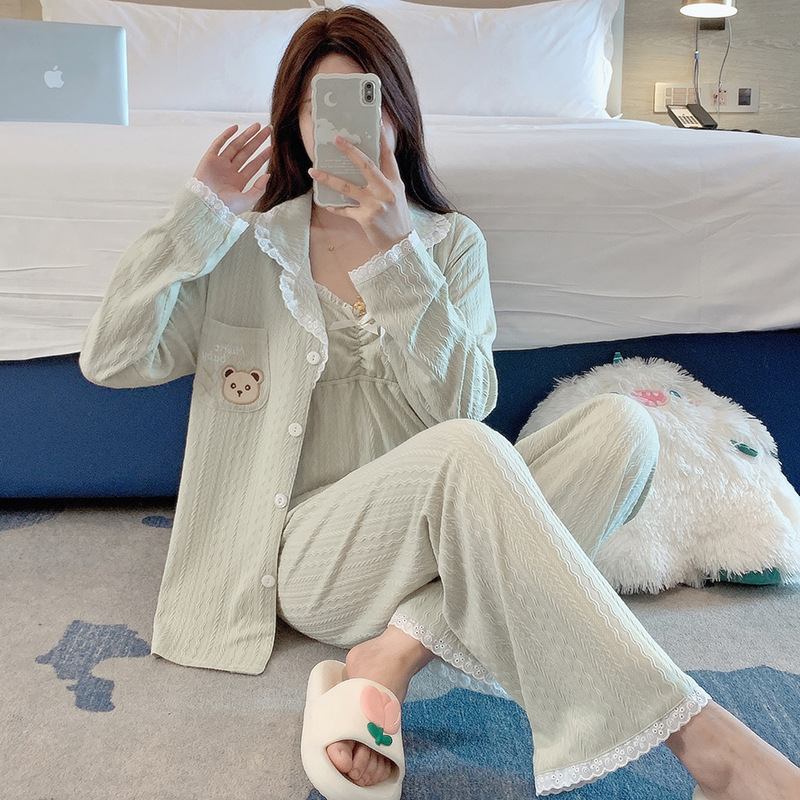 2024 봄과 가을 여성을위한 3 피스면 잠옷 새로운 달콤한 공주 슬링 긴 소매 가슴 패드 홈 착용 세트