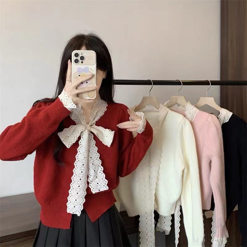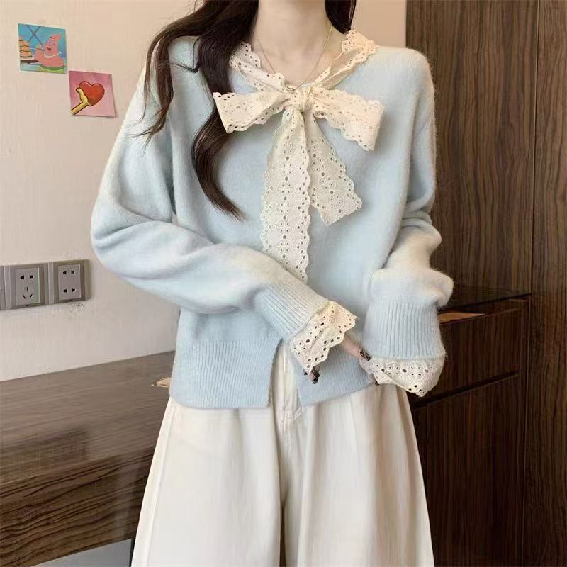 프랑스 스타일의 레이스 스티칭 활 긴팔 니트 카디건 여성의 가을과 겨울 내부 스웨터 바닥 셔츠 탑