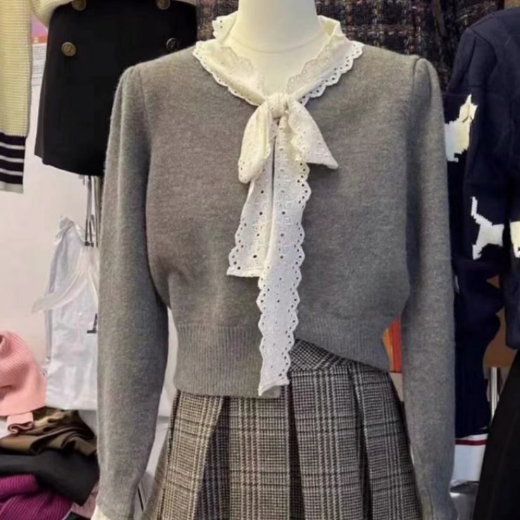 프랑스 스타일의 레이스 스티칭 활 긴팔 니트 카디건 여성의 가을과 겨울 내부 스웨터 바닥 셔츠 탑스토어 가기