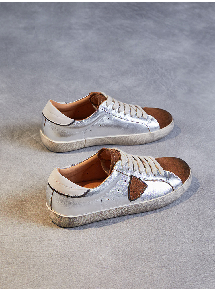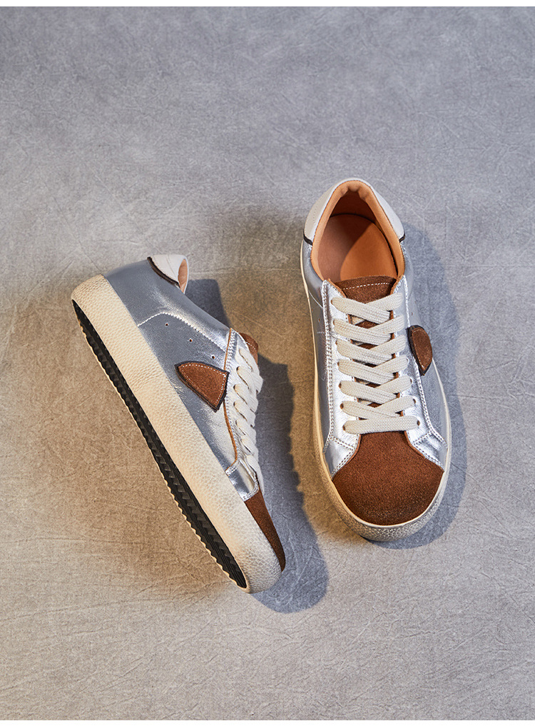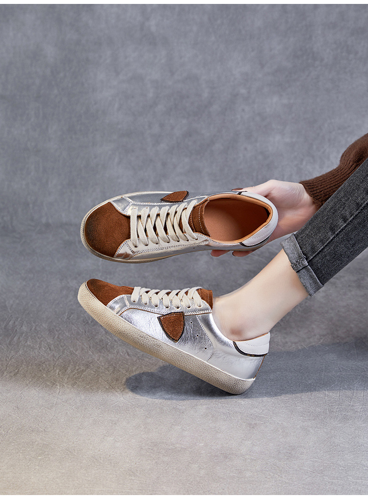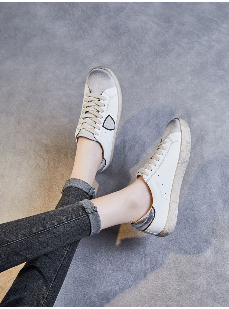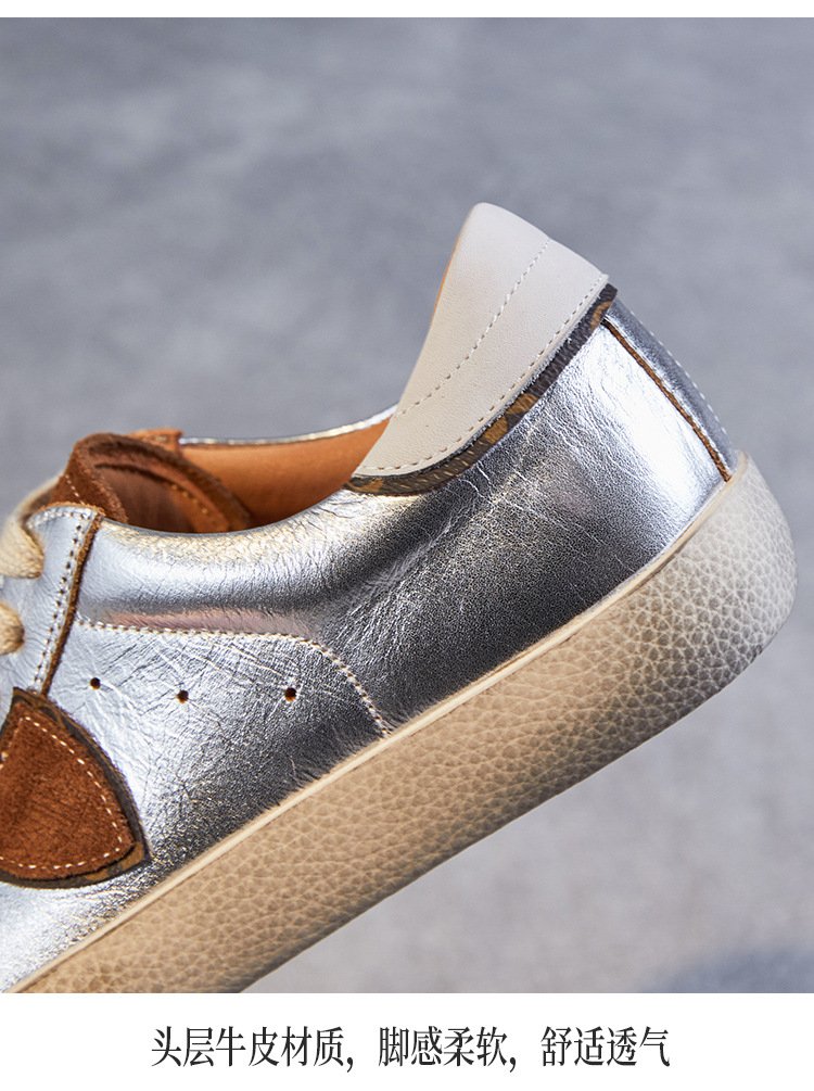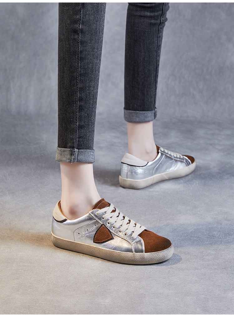 탑 레이어 소 가죽 오래된 작은 더러운 신발 2024 봄 새로운 캐주얼 내부 및 외부 가죽 플랫 여성용 레이스 업 컬러 매칭 보드 신발