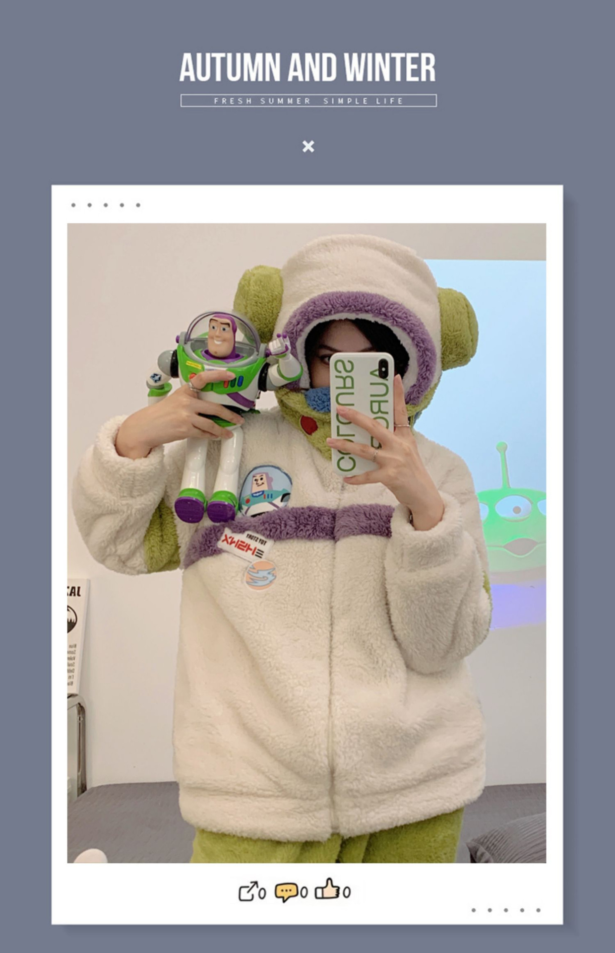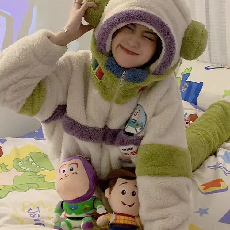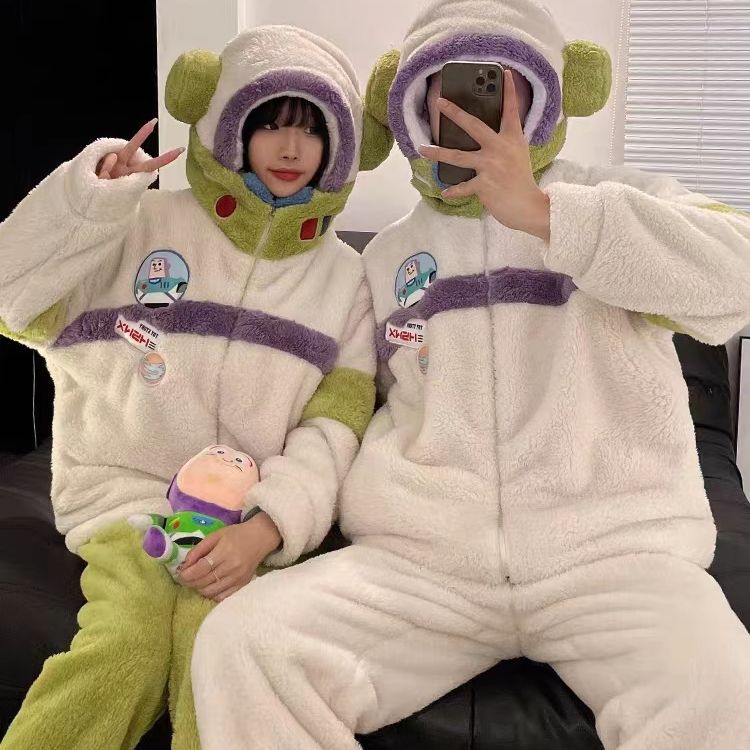 남성과 여성을위한 우주인 잠옷 커플 기모 두꺼운 플러시 지퍼 후드 겉옷 홈웨어 세트스토어 가기