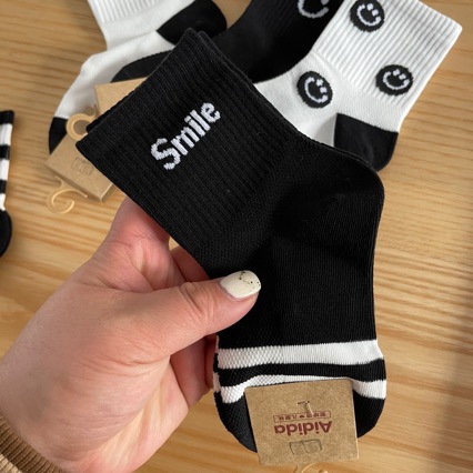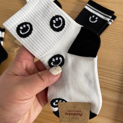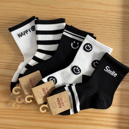 어린이 양말 봄과 여름 새로운 중반 송아지 양말 하프 메쉬 흑백 문자 웃는 얼굴 양말 인기 온라인 도매스토어 가기
