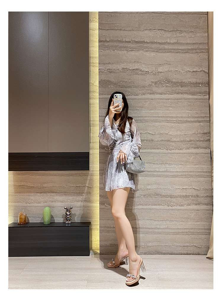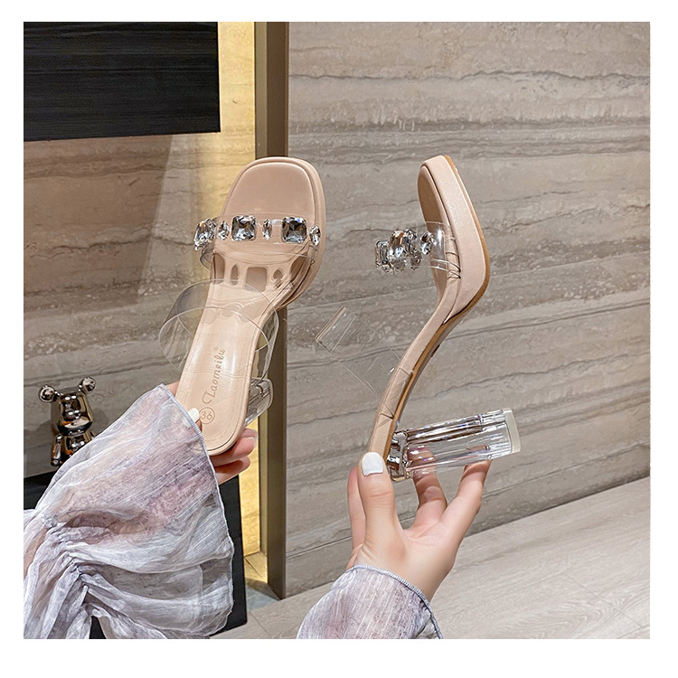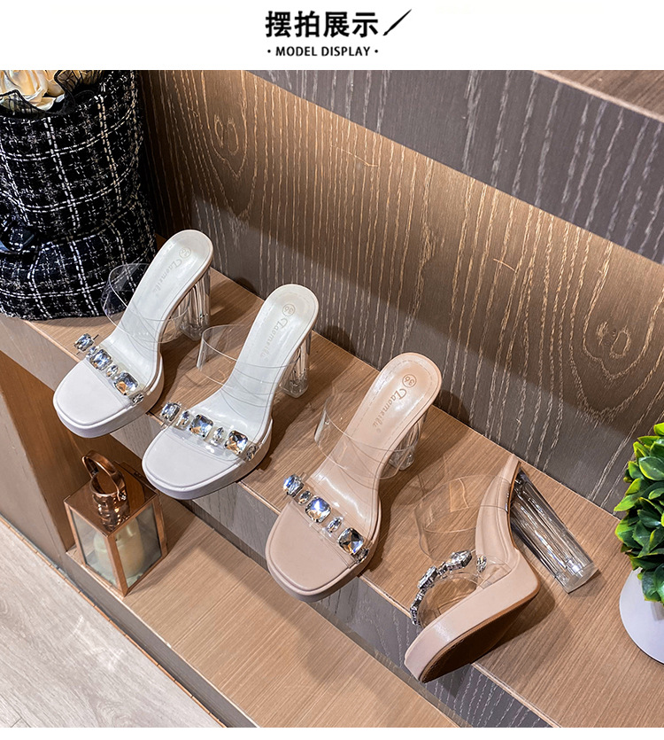 2023 여름 새로운 원 스트랩 하이힐 슬리퍼 방수 플랫폼 크리스탈 청키 힐 미드 힐 스몰 사이즈 투명 샌들 여성용