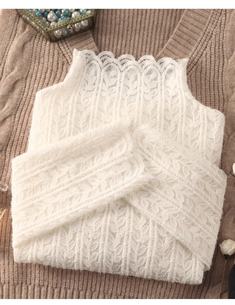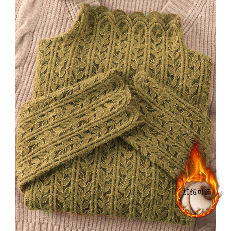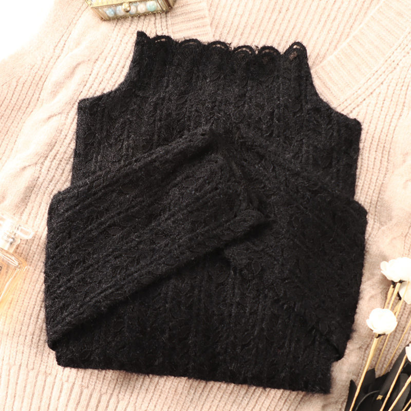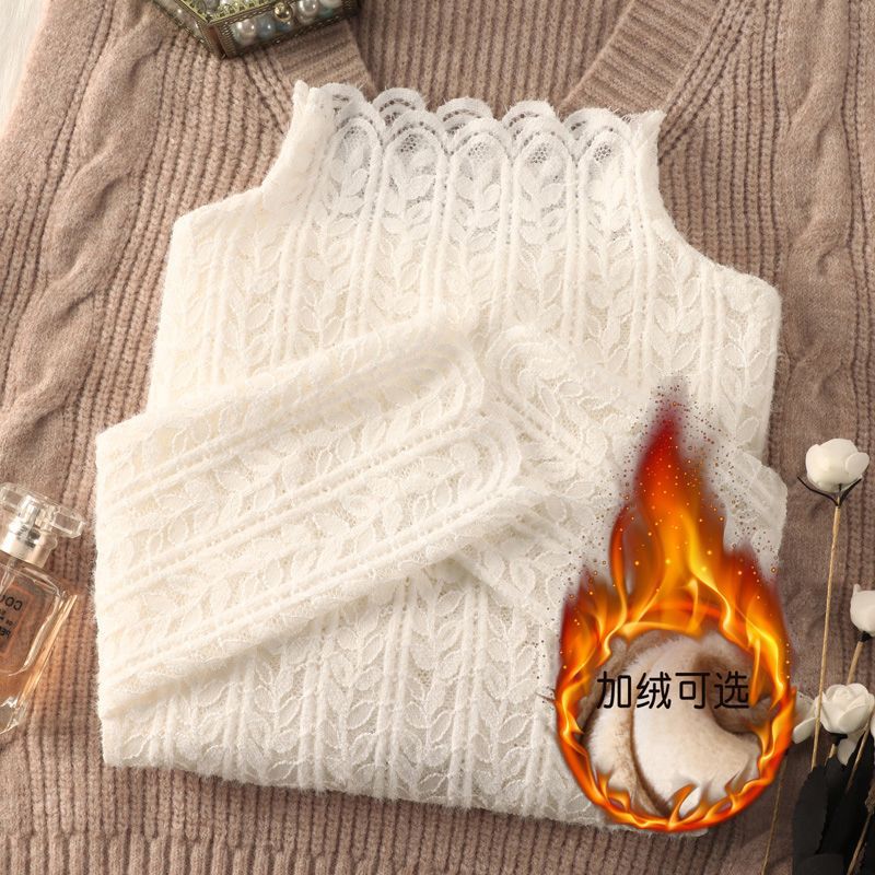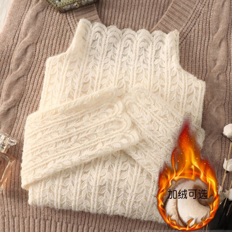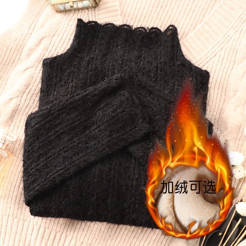 여성 하프 터틀넥 브러쉬 레이스 바닥 셔츠 기모 2023 가을과 겨울 여성을위한 새로운 서양식 언더 셔츠 메쉬 탑