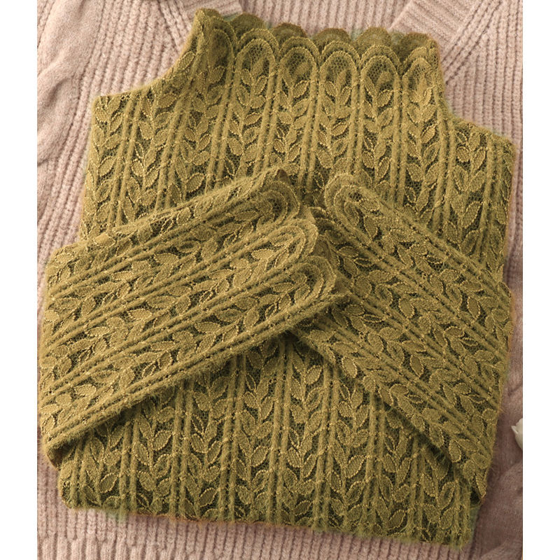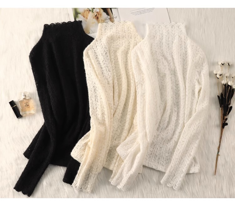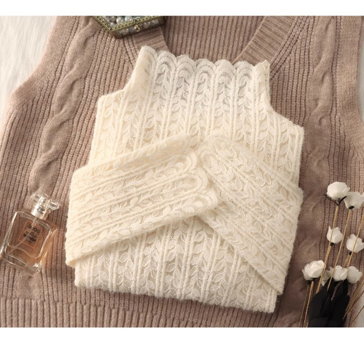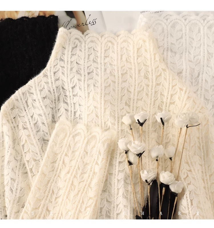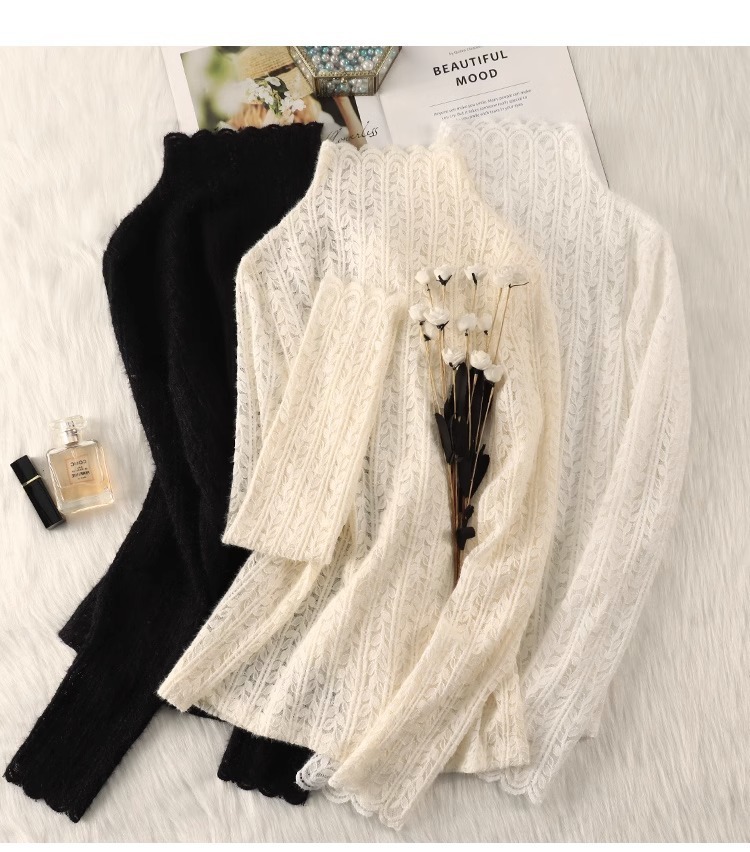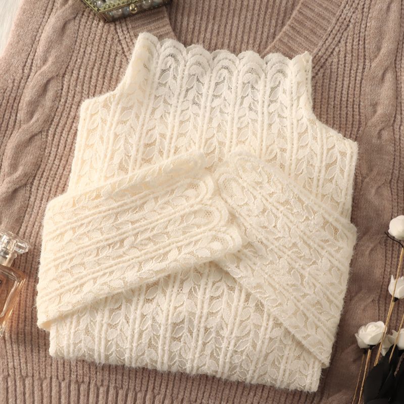 여성 하프 터틀넥 브러쉬 레이스 바닥 셔츠 기모 2023 가을과 겨울 여성을위한 새로운 서양식 언더 셔츠 메쉬 탑