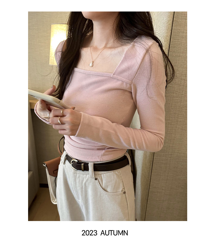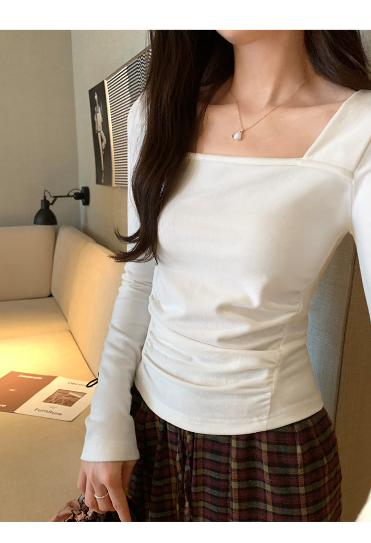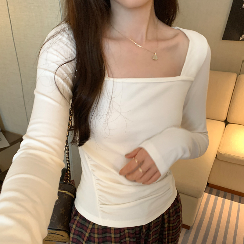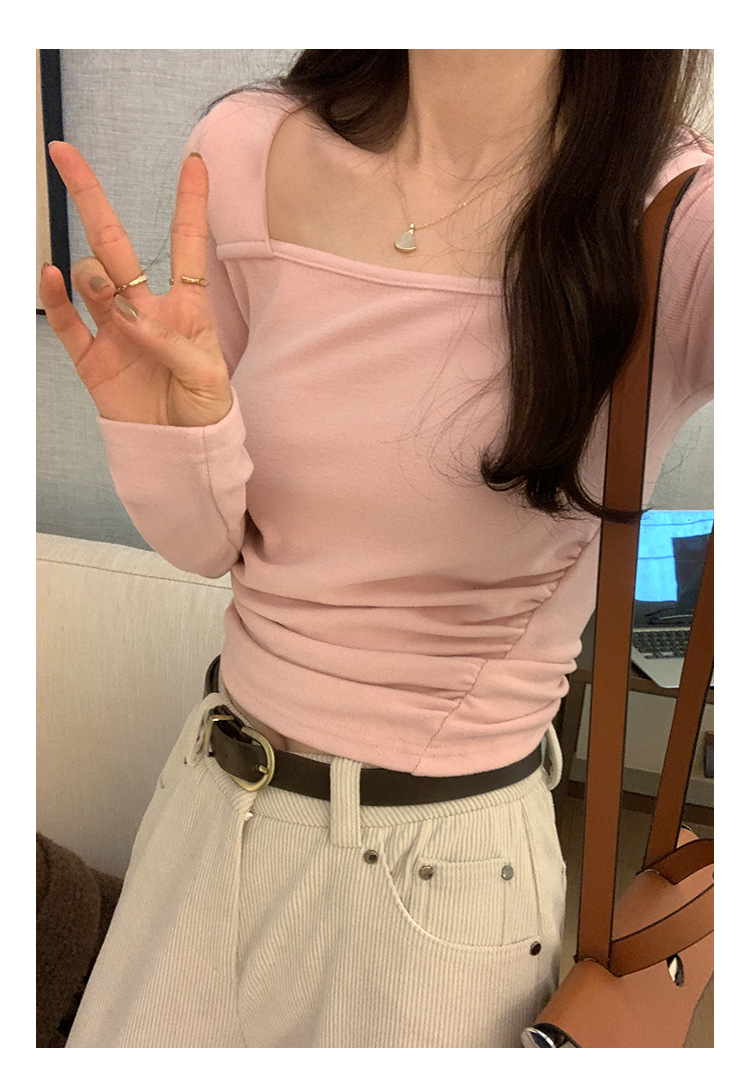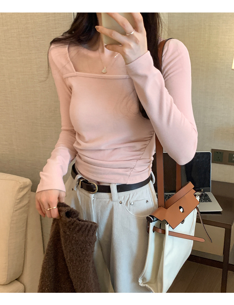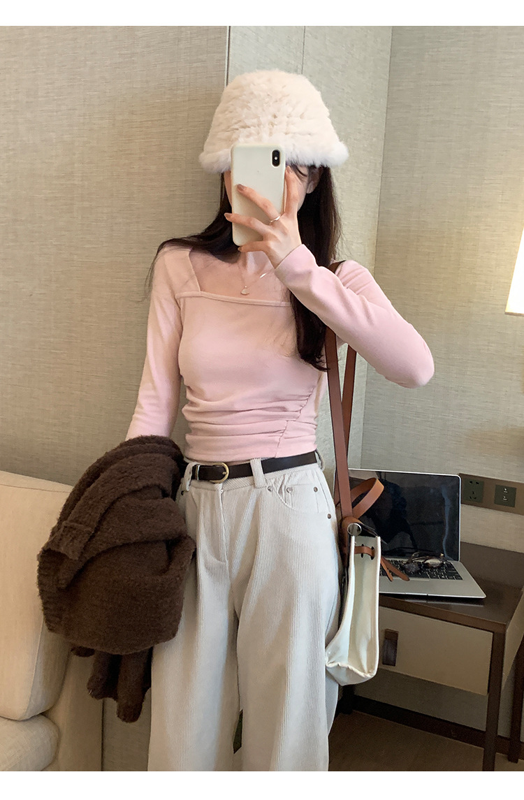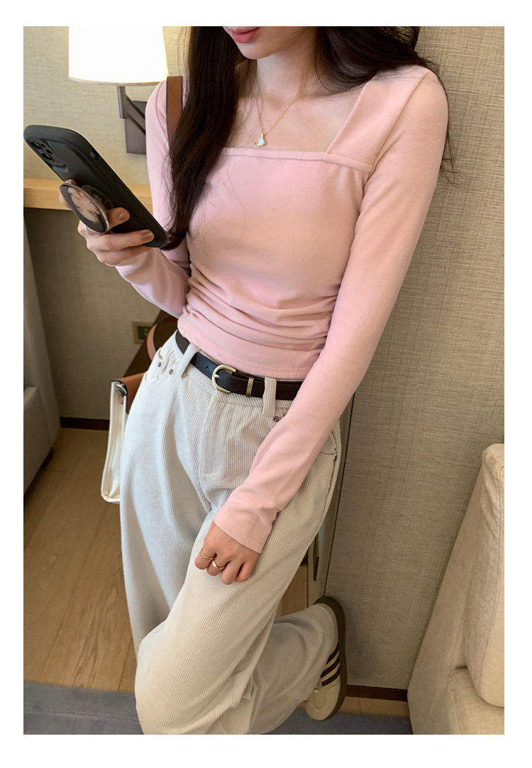 디자인 센스 순수한 욕망 스퀘어 칼라 코듀로이 긴팔 티셔츠 여성용 봄과 가을 새로운 주름진 허리 내베이스 셔츠 탑
