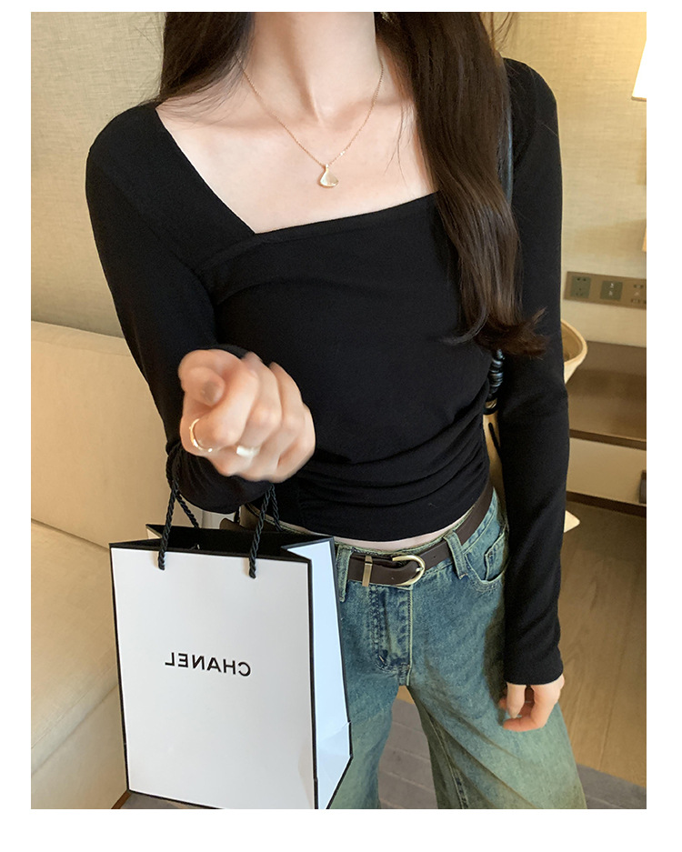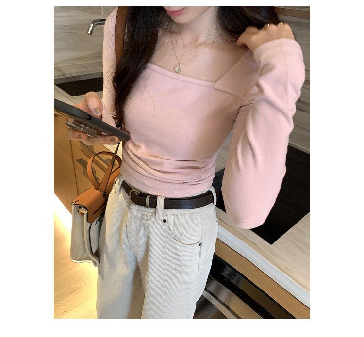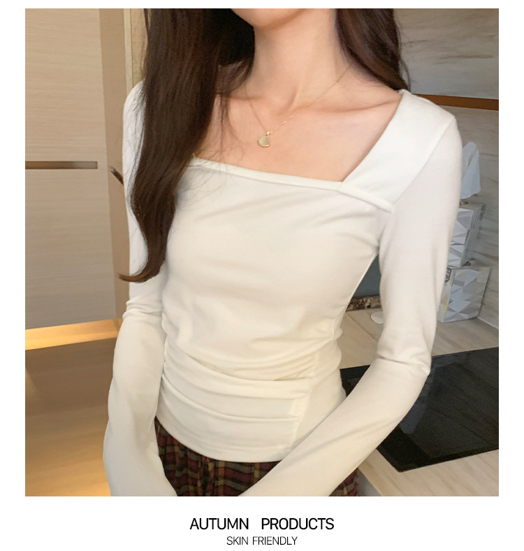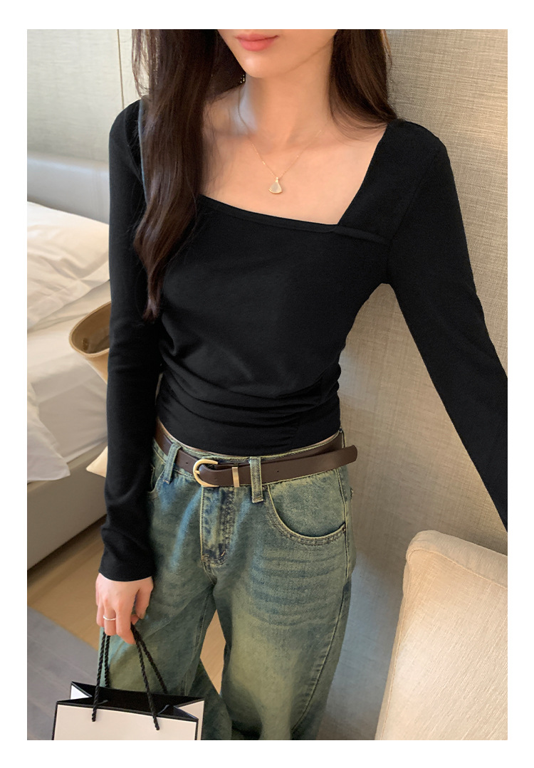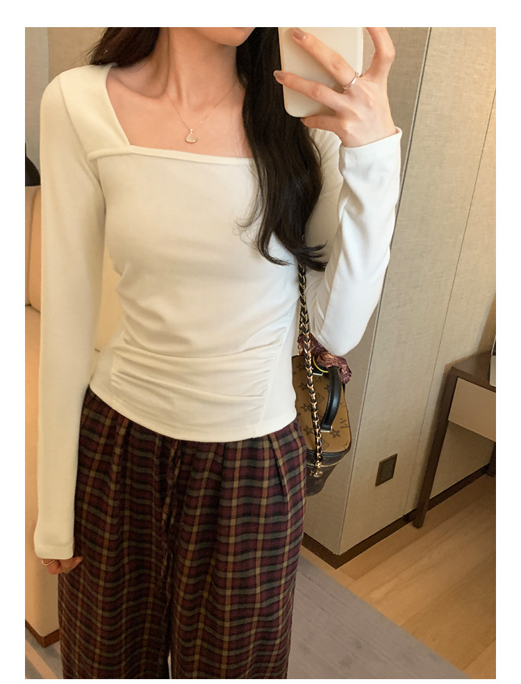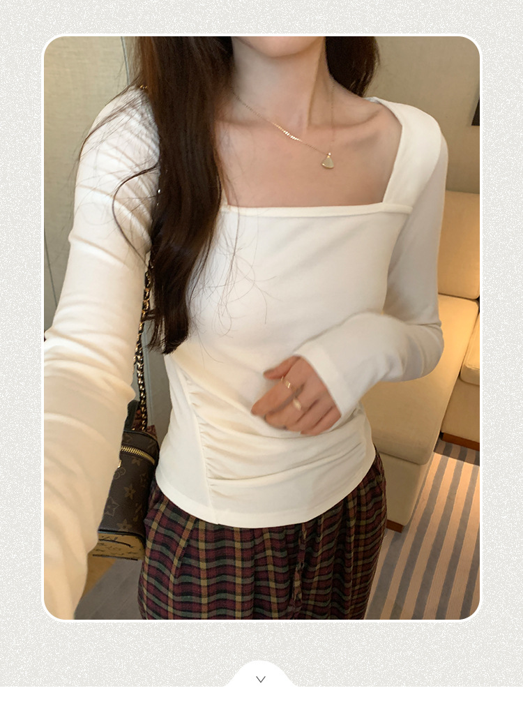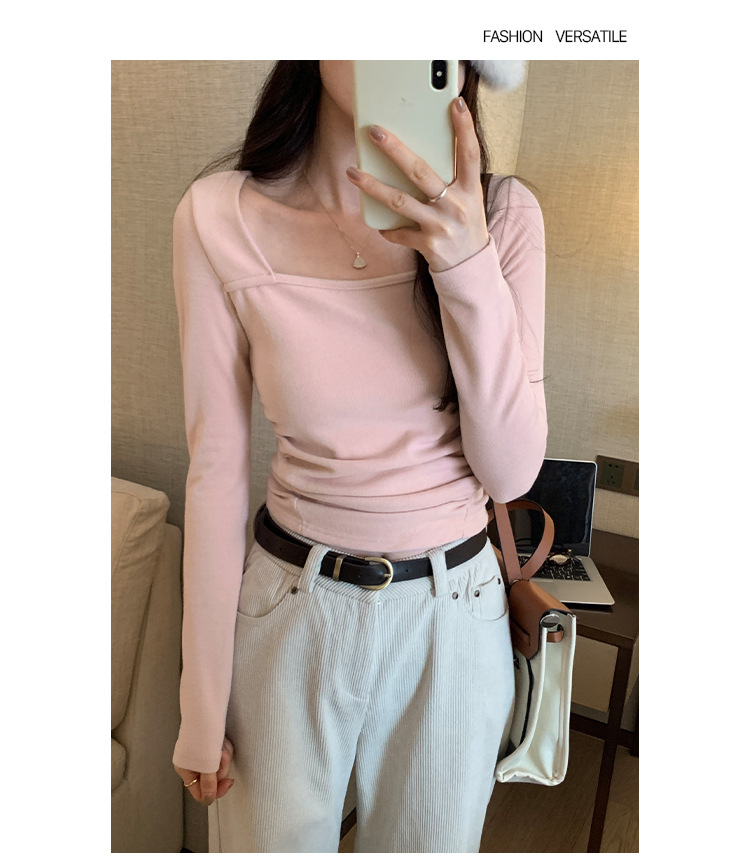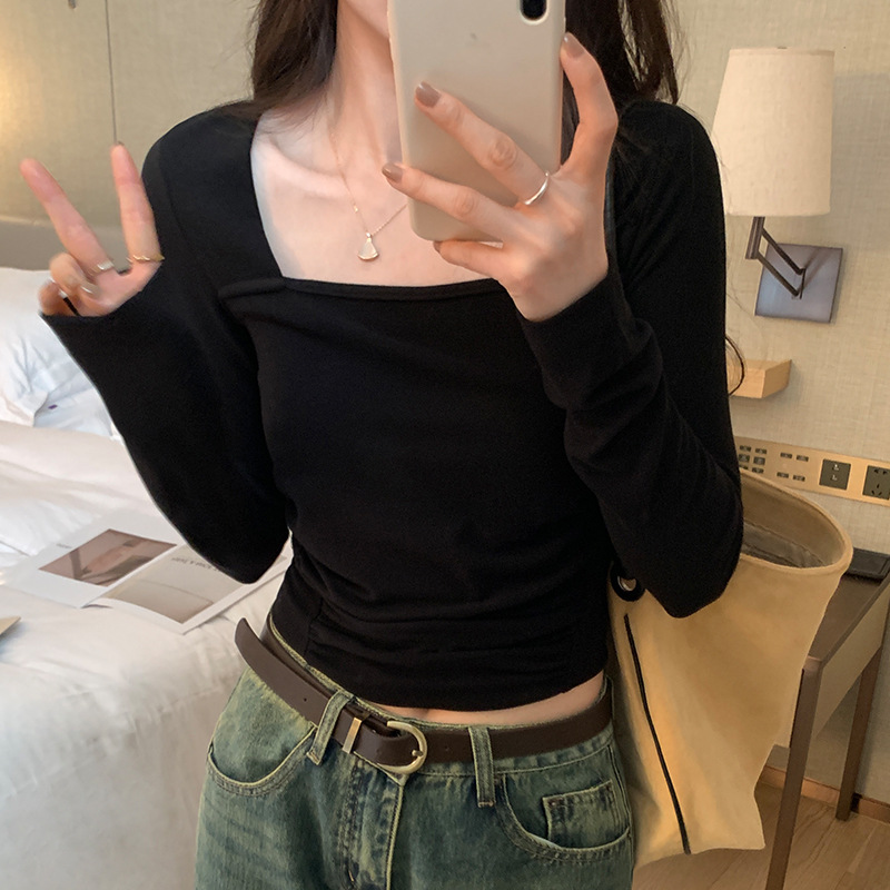 디자인 센스 순수한 욕망 스퀘어 칼라 코듀로이 긴팔 티셔츠 여성용 봄과 가을 새로운 주름진 허리 내베이스 셔츠 탑