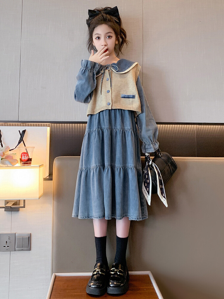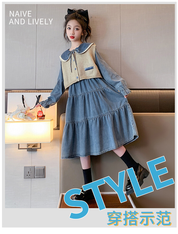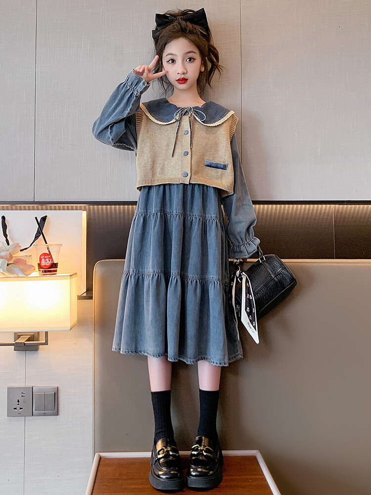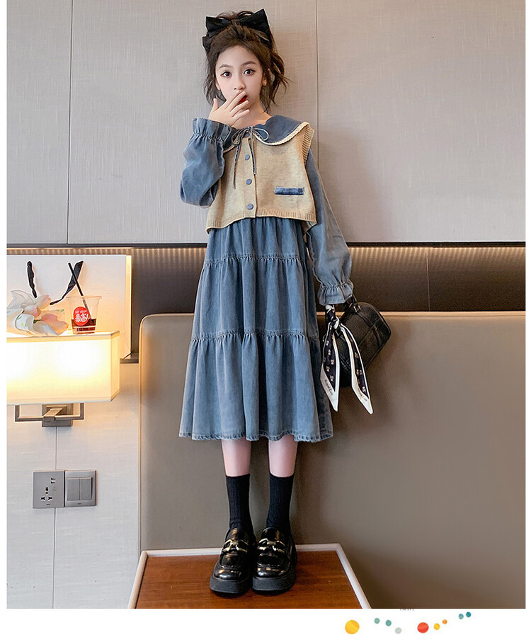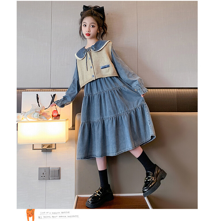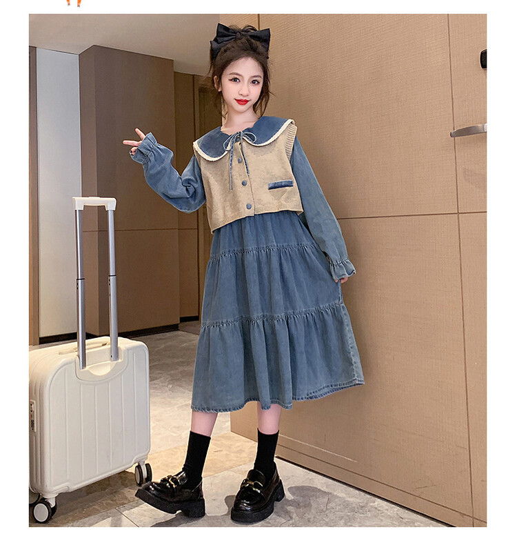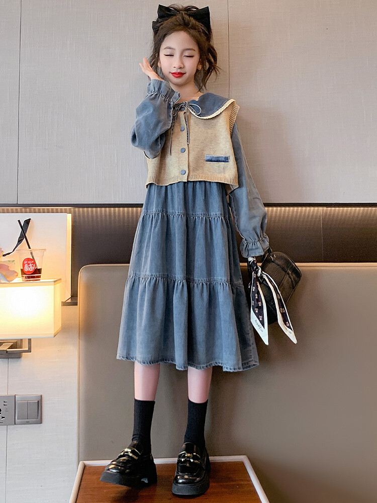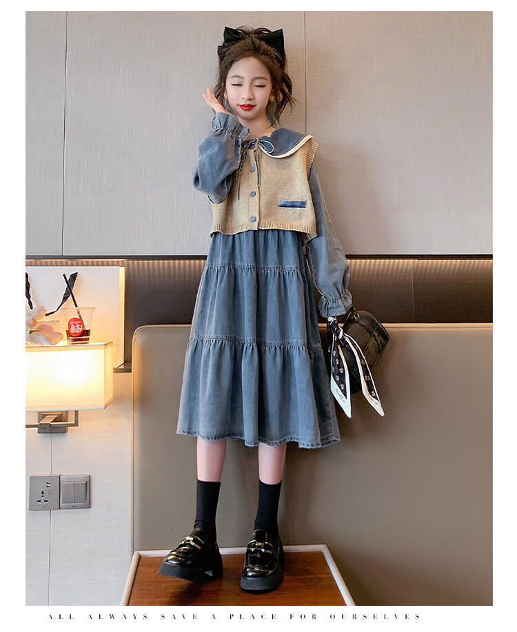 봄과 가을 새로운 소녀들의 원피스 스웨터 조끼 데님 원피스 투피스 달콤한 캐주얼 소녀 스커트스토어 가기