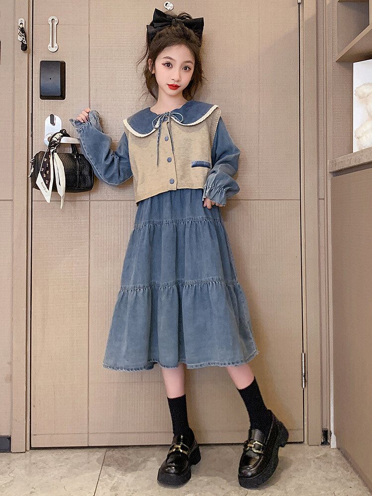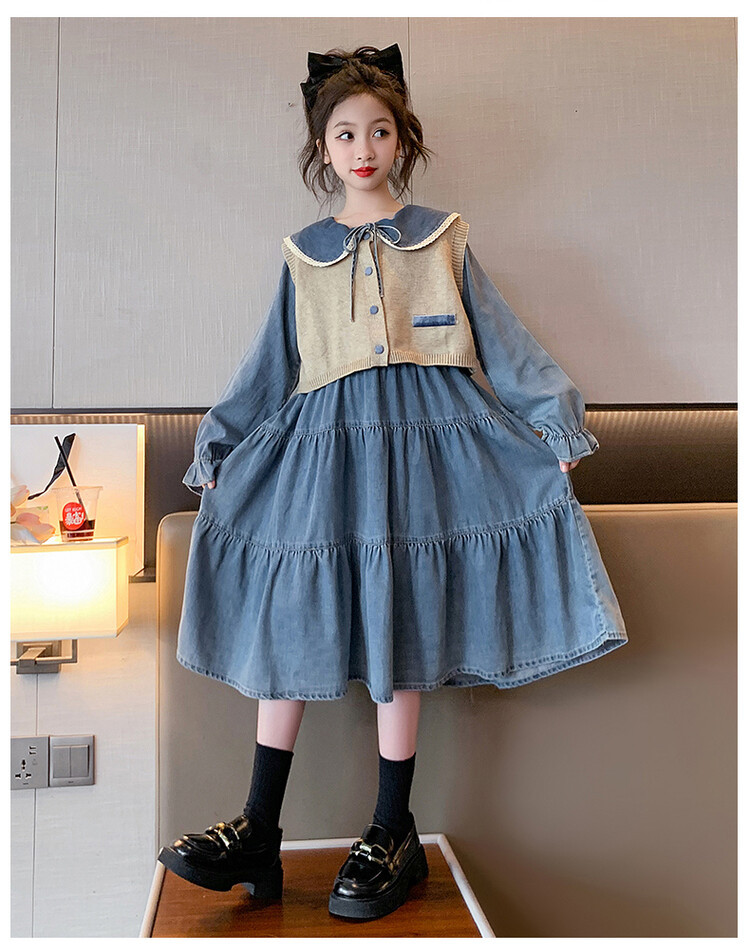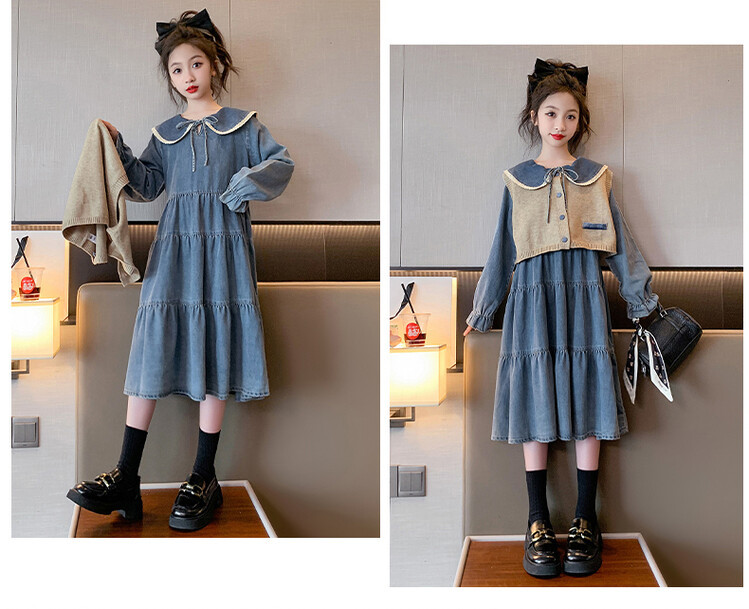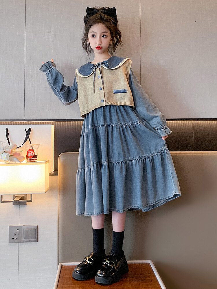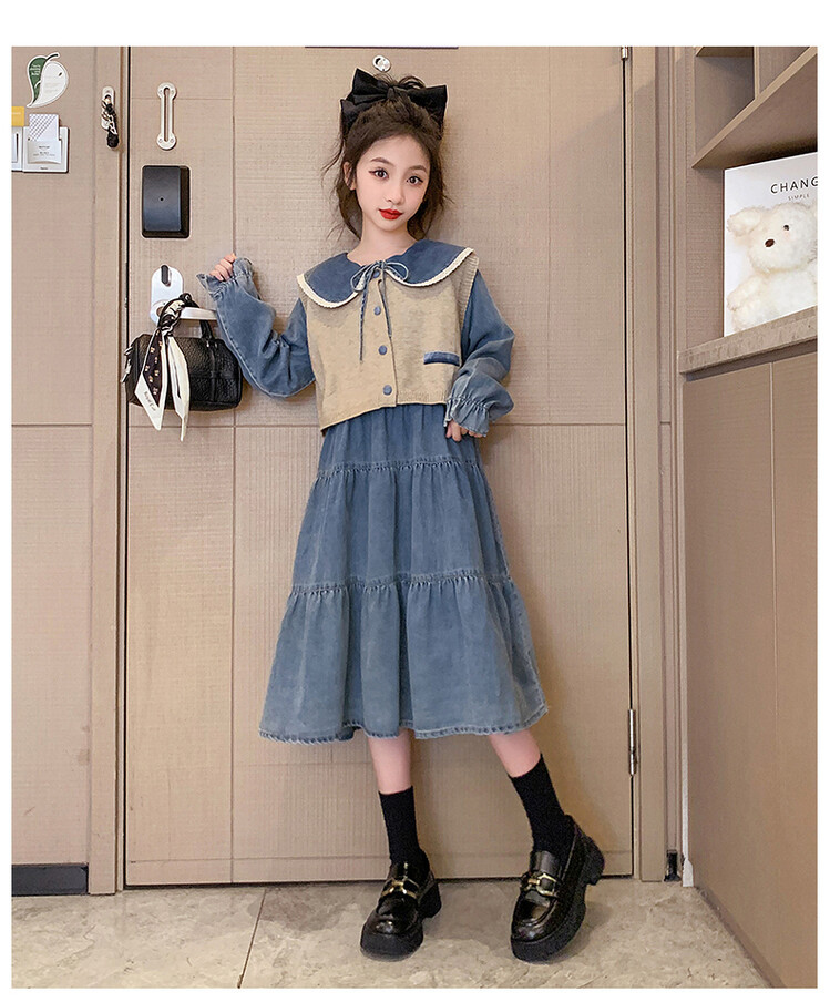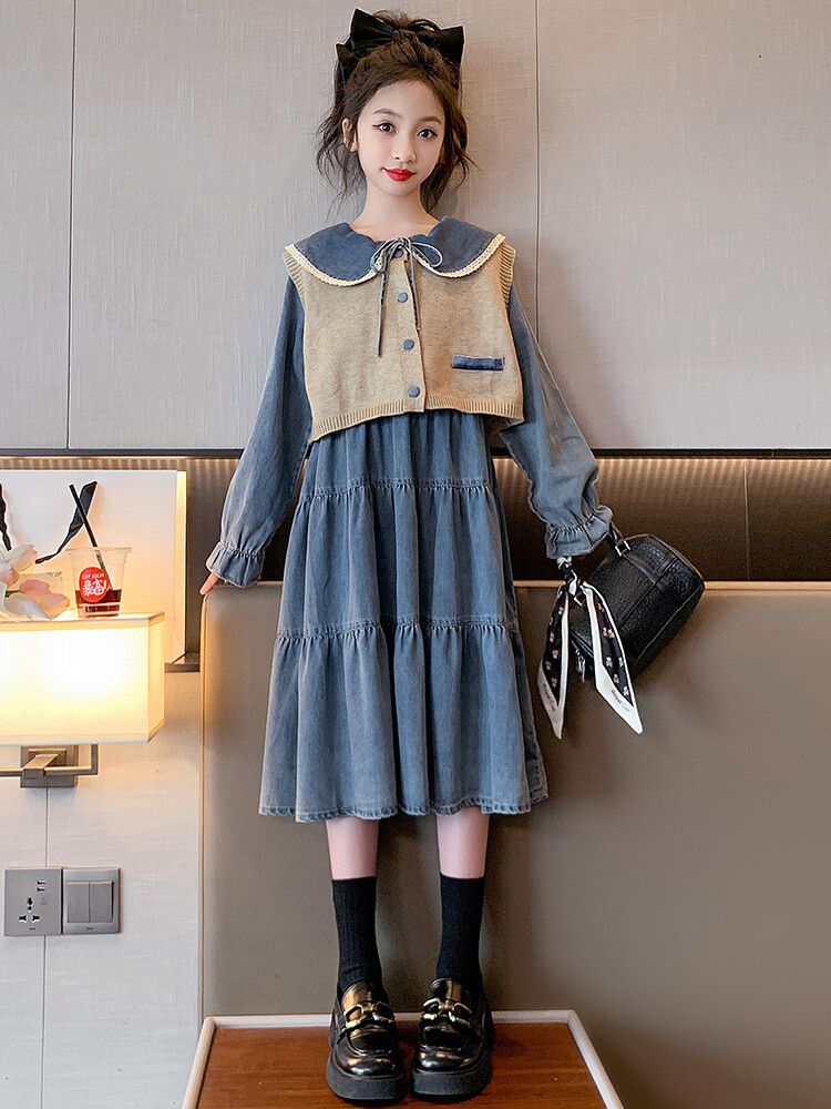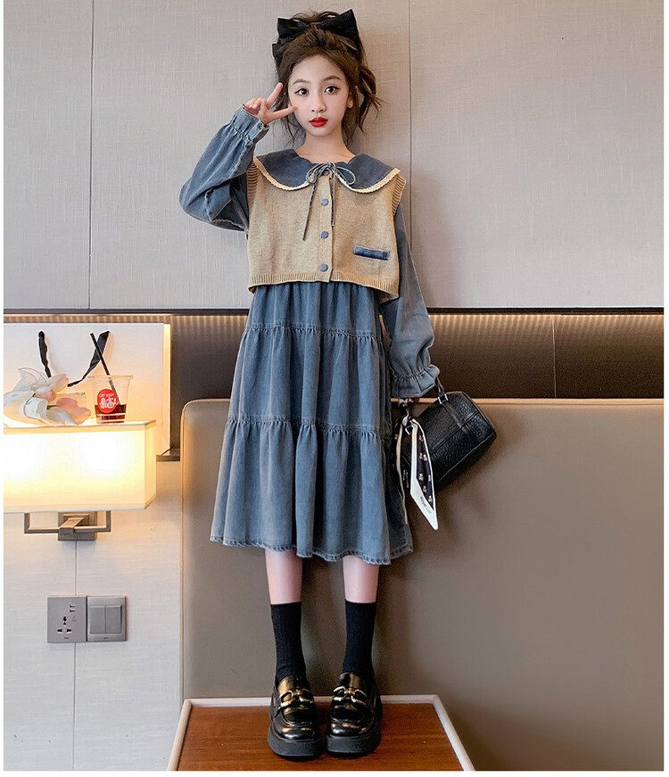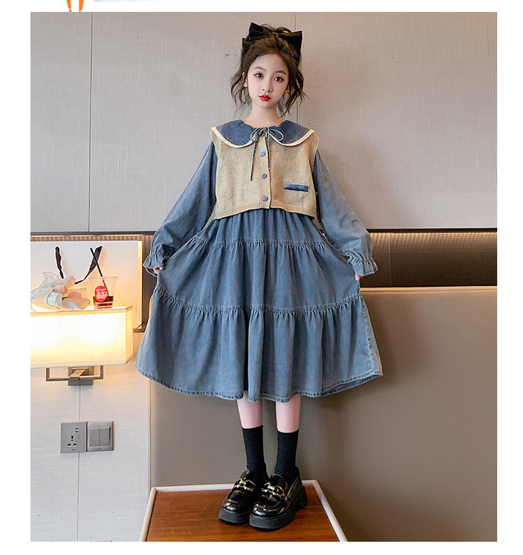 봄과 가을 새로운 소녀들의 원피스 스웨터 조끼 데님 원피스 투피스 달콤한 캐주얼 소녀 스커트스토어 가기