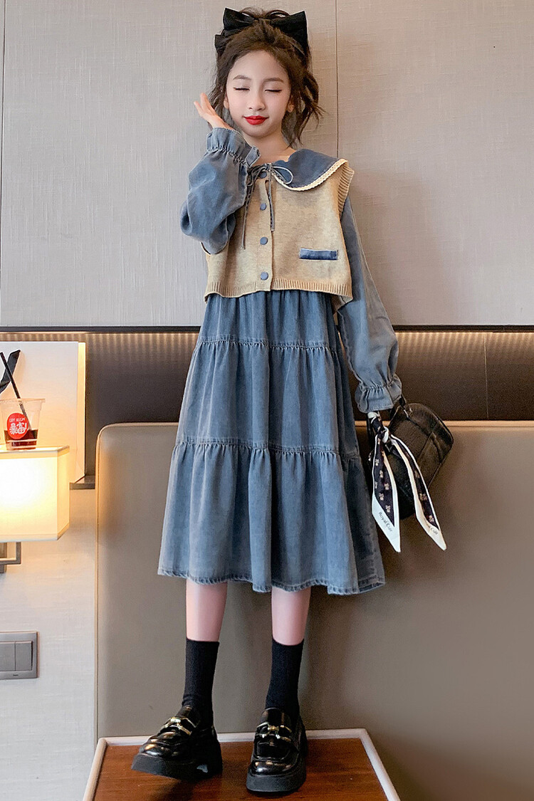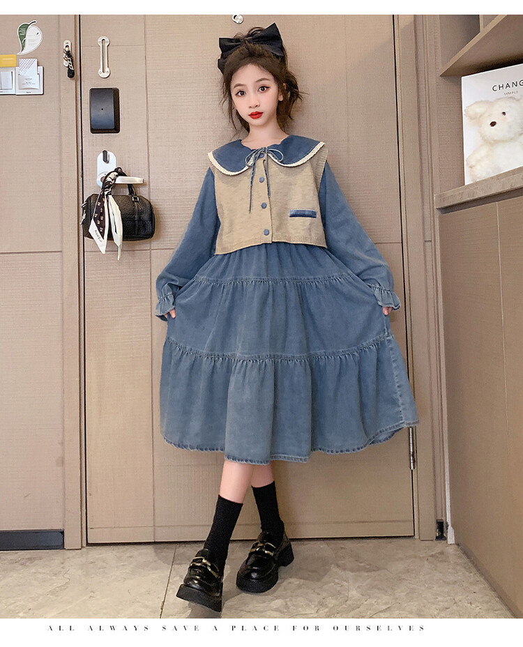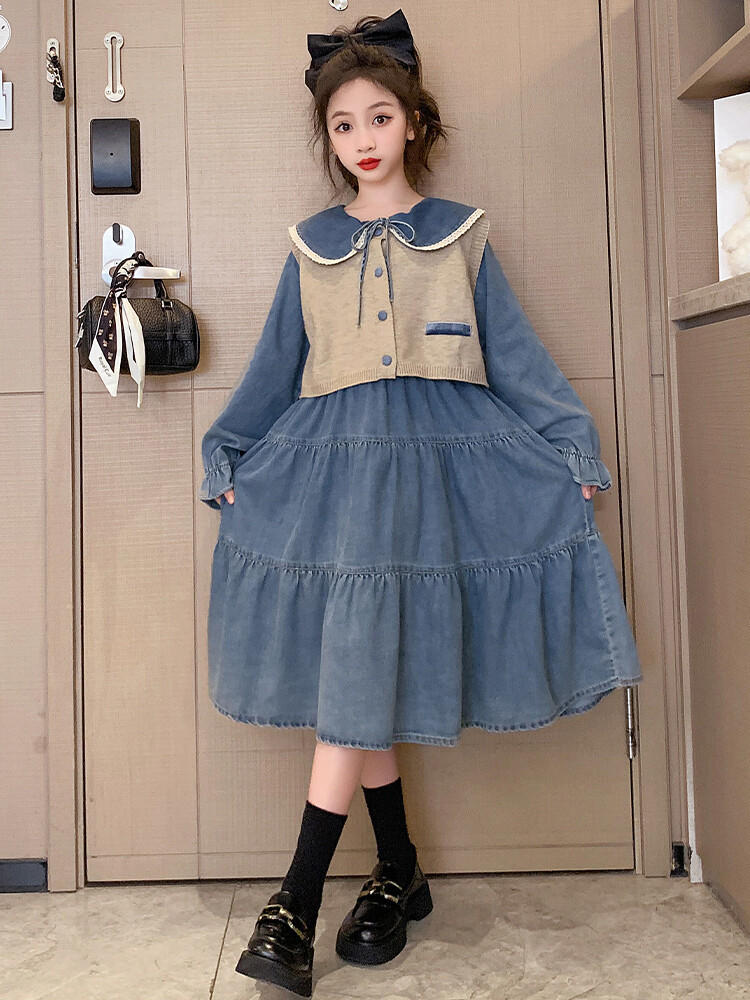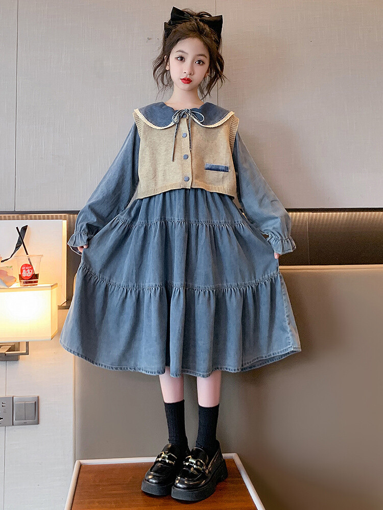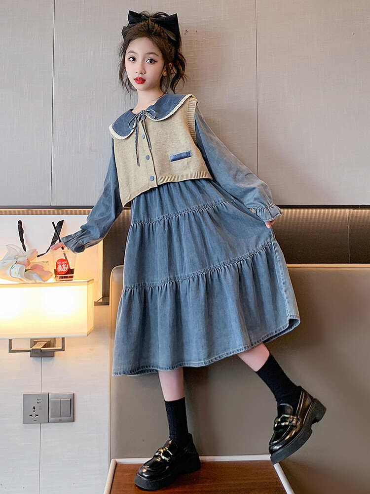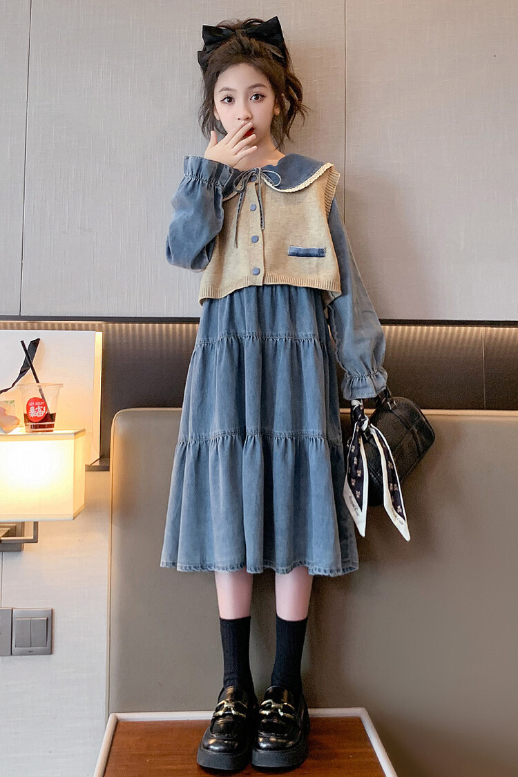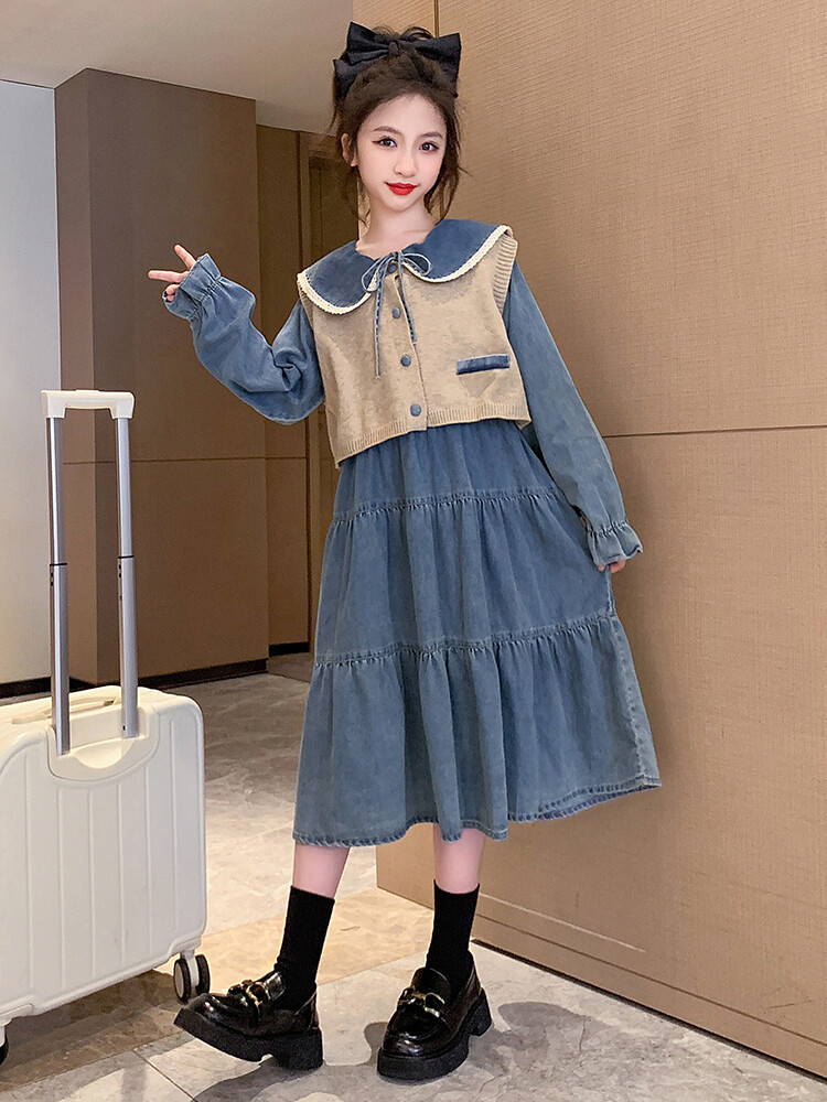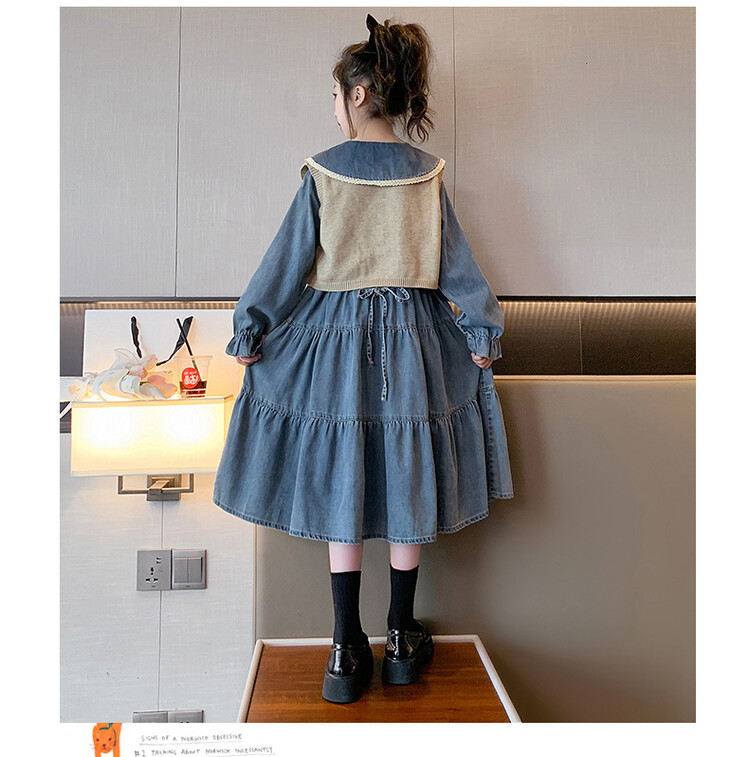 봄과 가을 새로운 소녀들의 원피스 스웨터 조끼 데님 원피스 투피스 달콤한 캐주얼 소녀 스커트스토어 가기