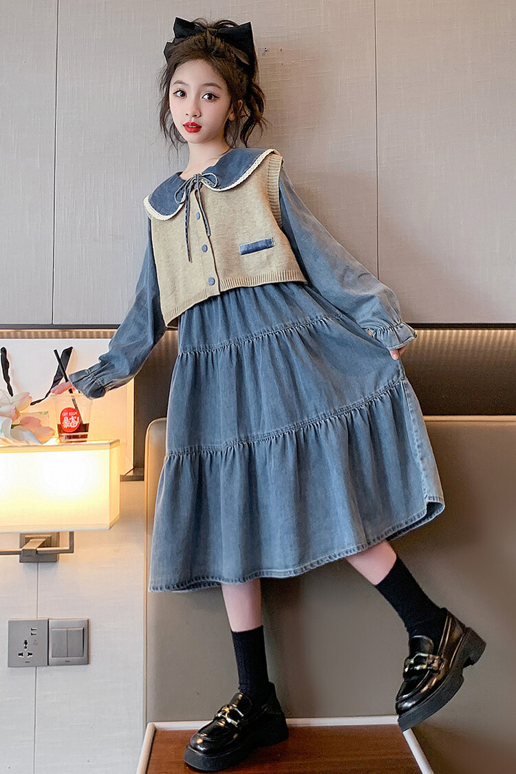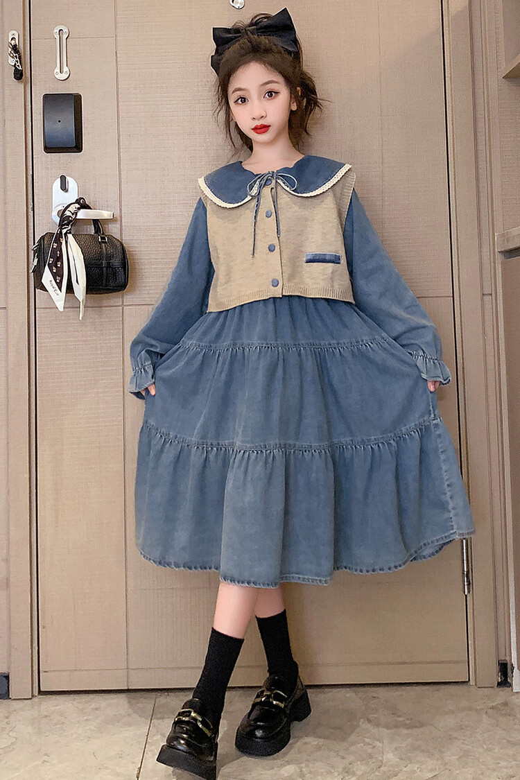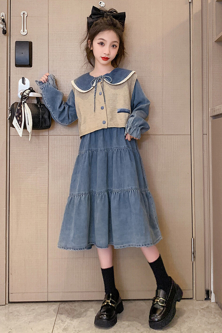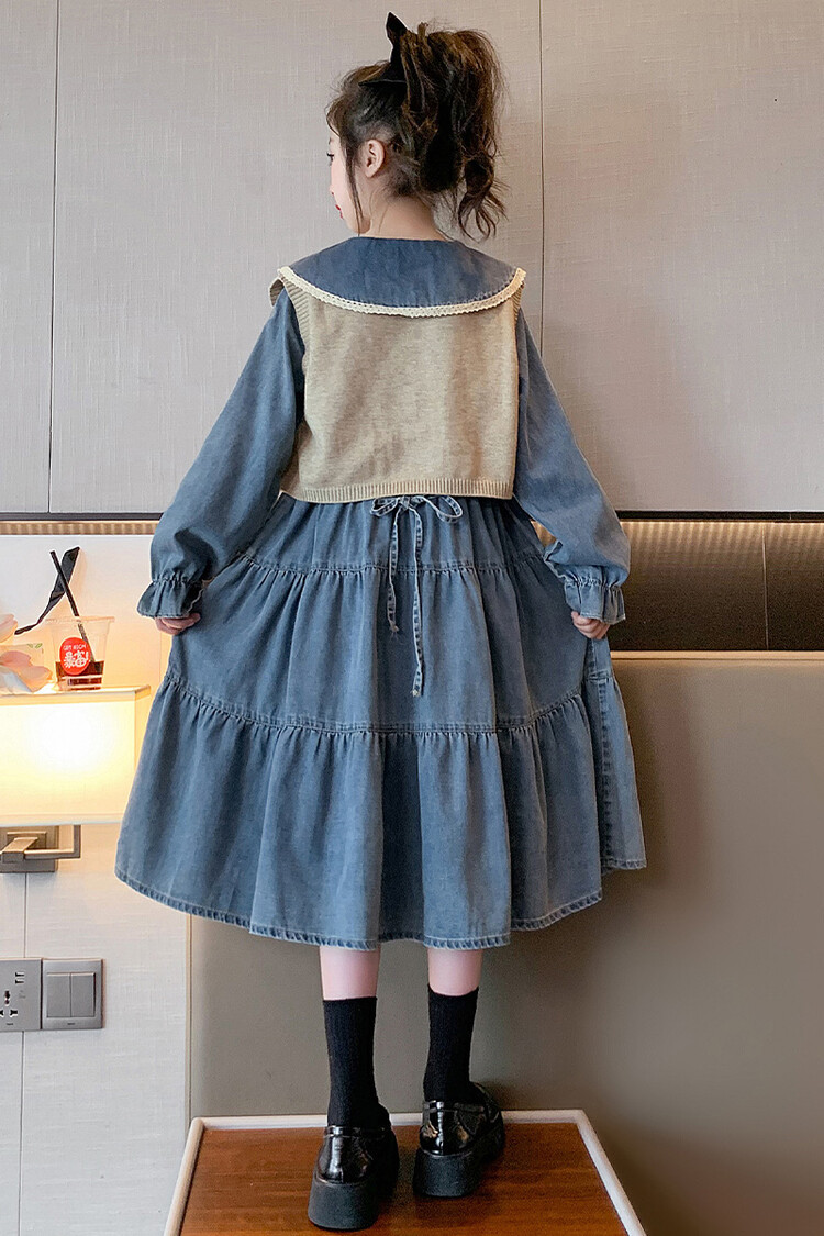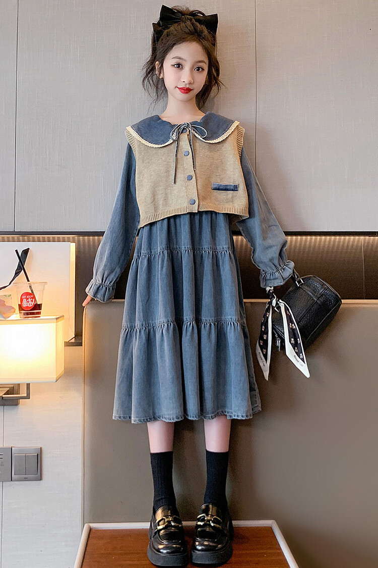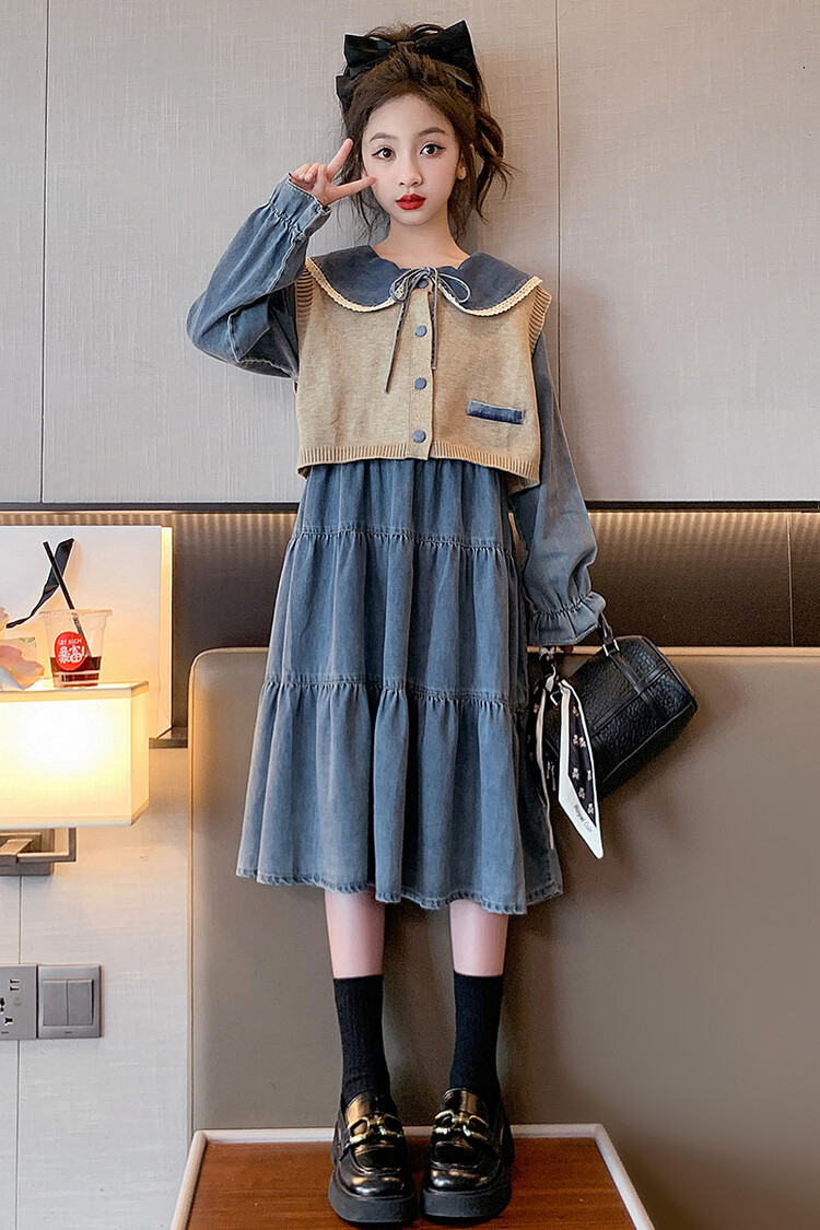 봄과 가을 새로운 소녀들의 원피스 스웨터 조끼 데님 원피스 투피스 달콤한 캐주얼 소녀 스커트스토어 가기