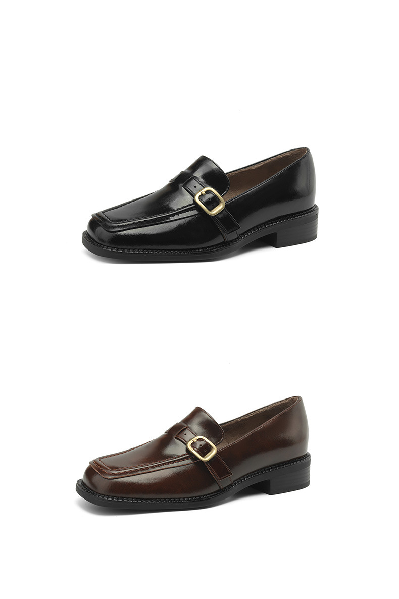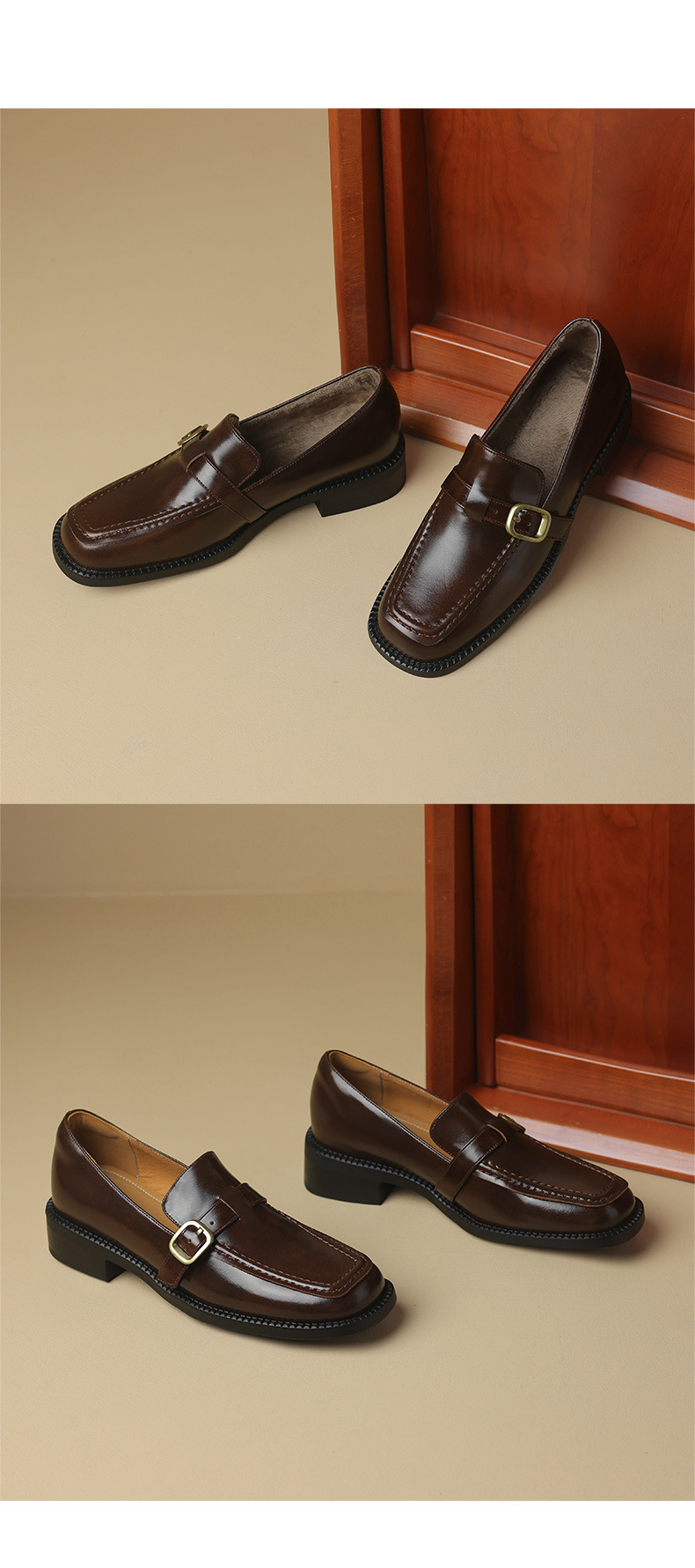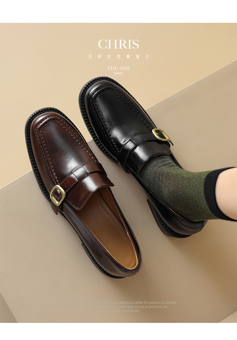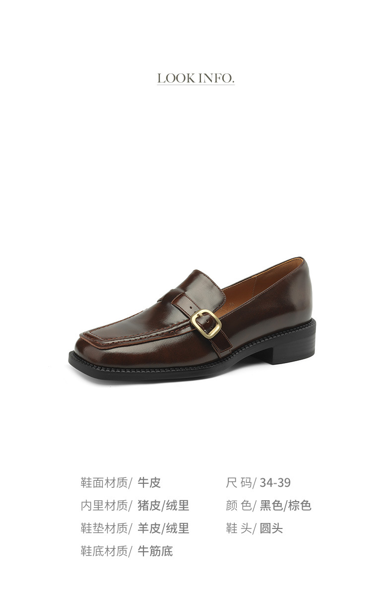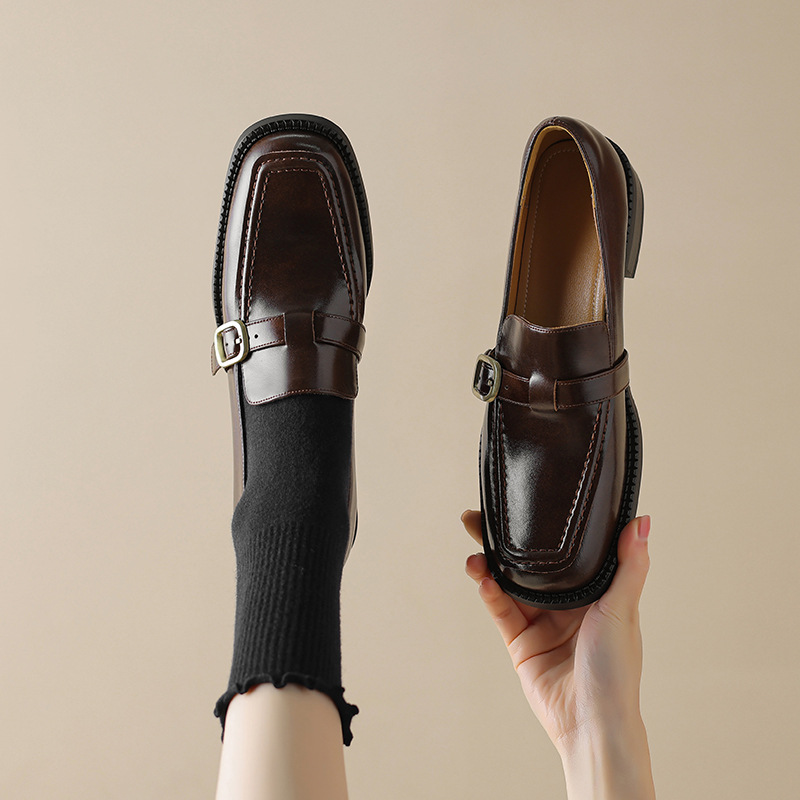 영국 스타일 벨트 버클 로퍼 2024 이른 봄 스퀘어 토 가죽 신발 복고풍 청키 힐 싱글 레이어 신발 여성용 미드 힐 플러스 사이즈