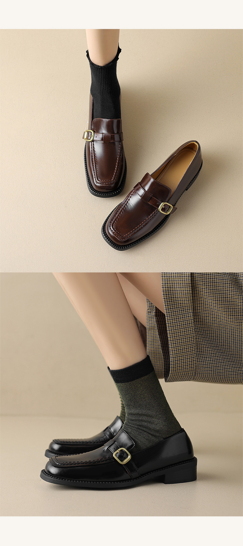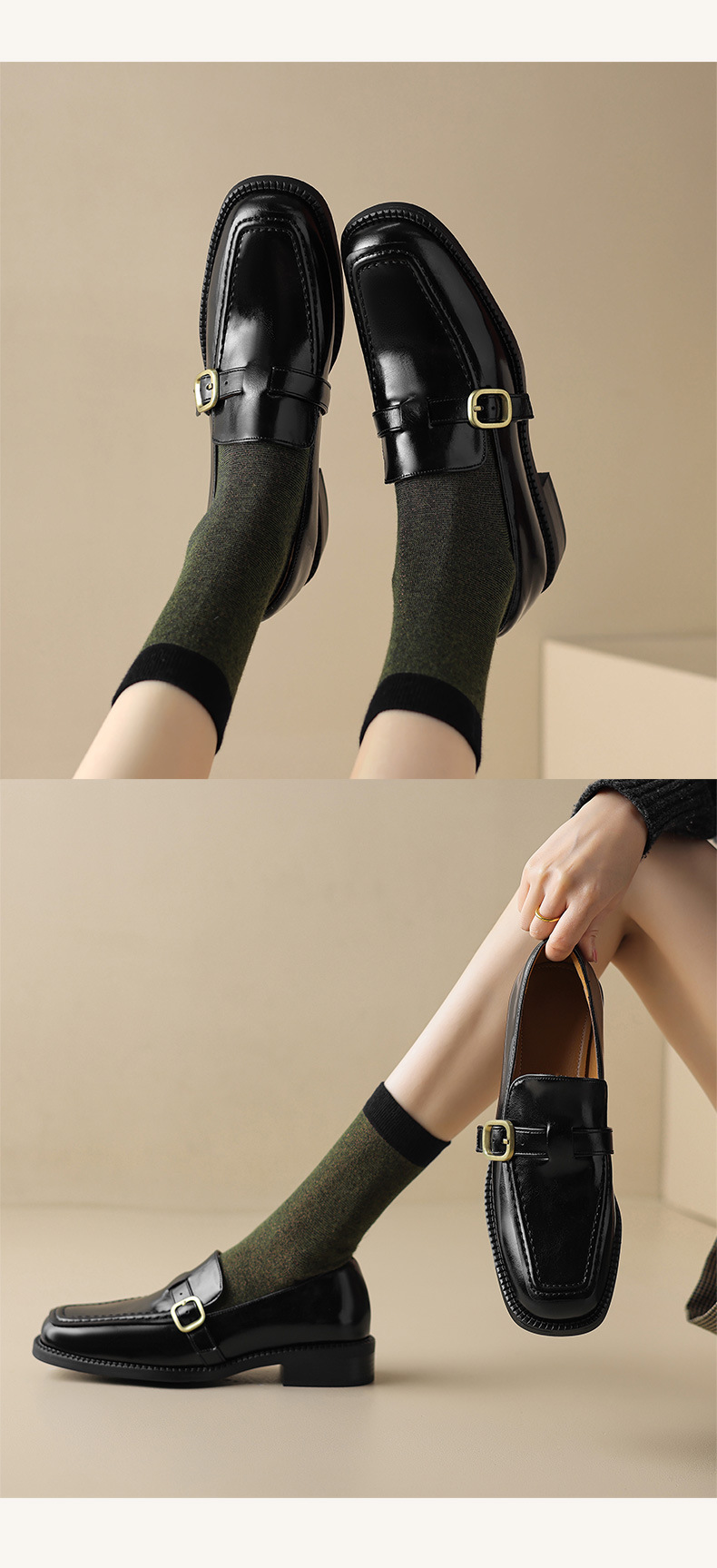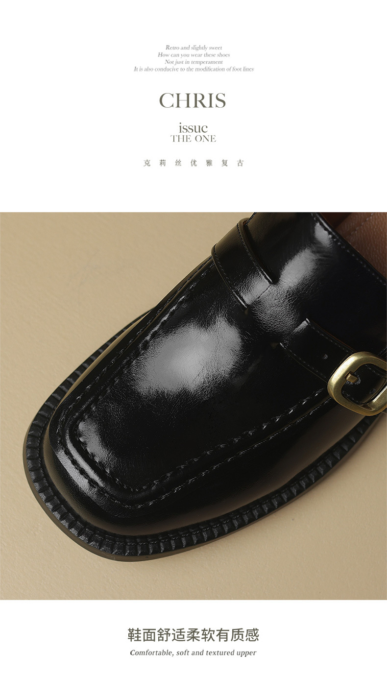 영국 스타일 벨트 버클 로퍼 2024 이른 봄 스퀘어 토 가죽 신발 복고풍 청키 힐 싱글 레이어 신발 여성용 미드 힐 플러스 사이즈